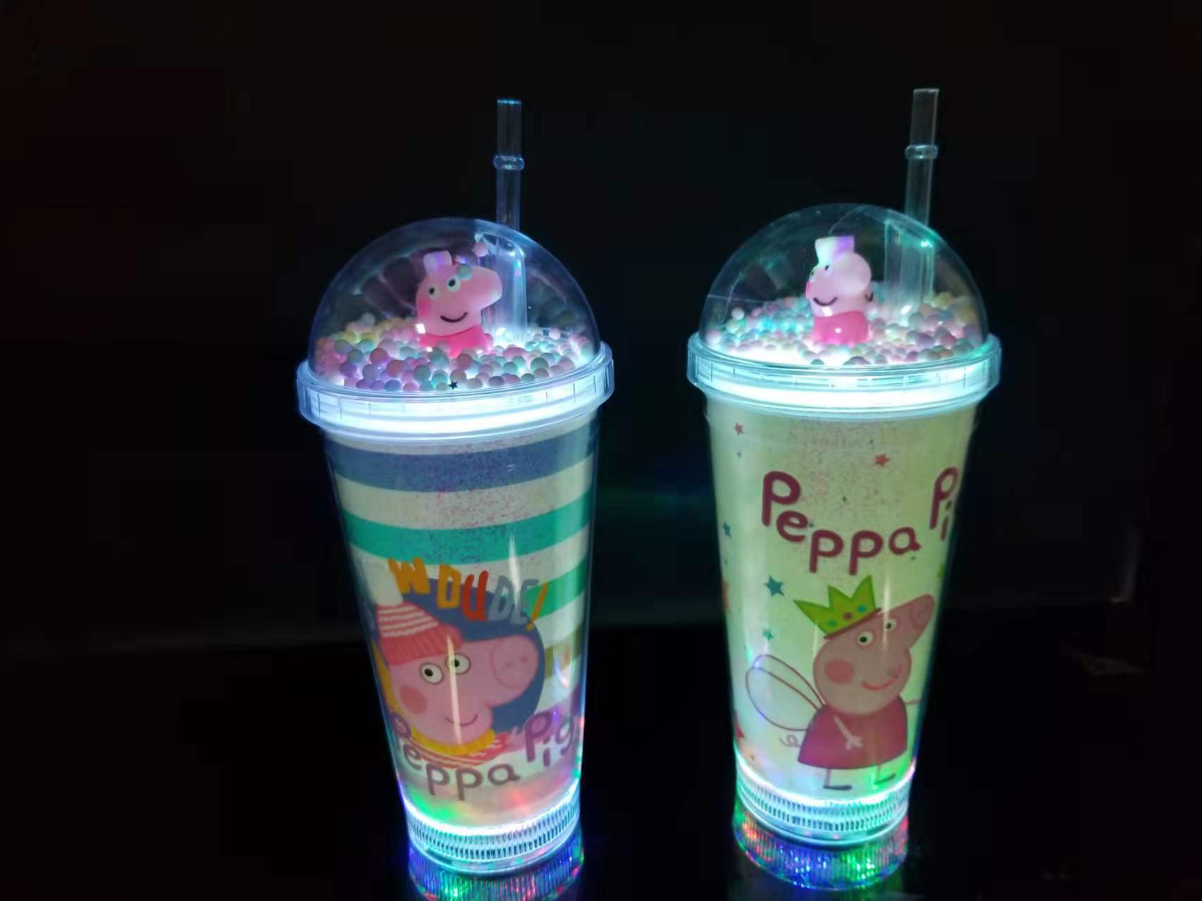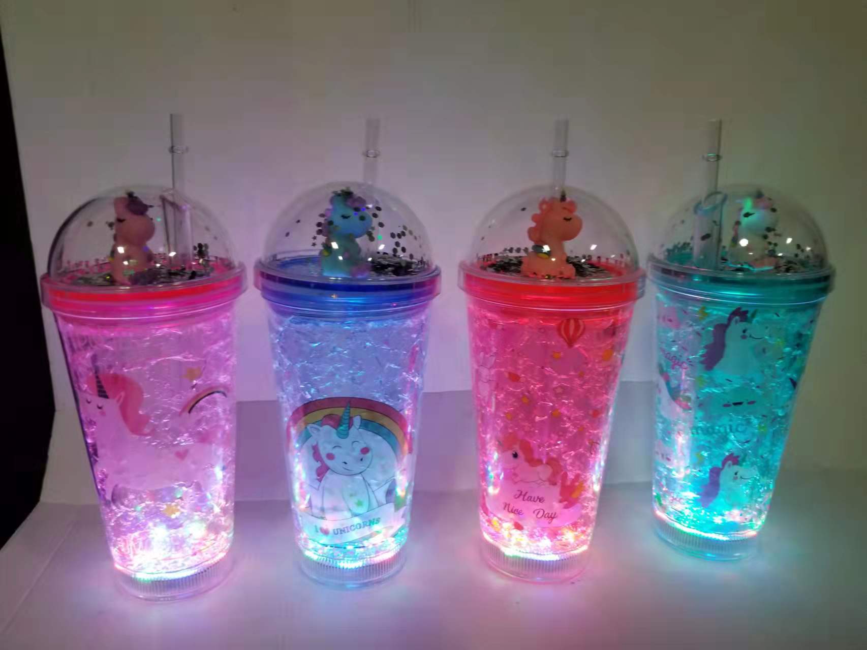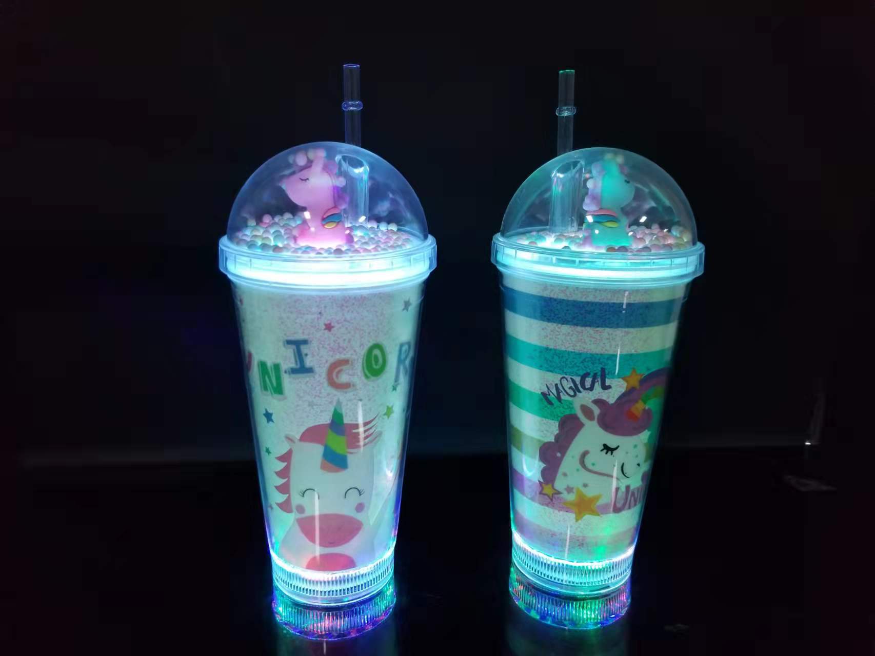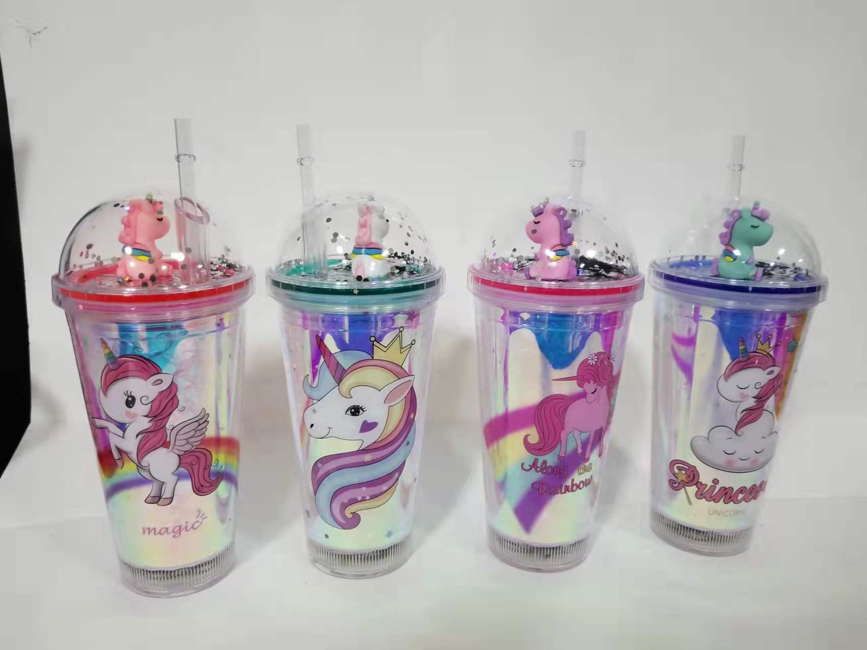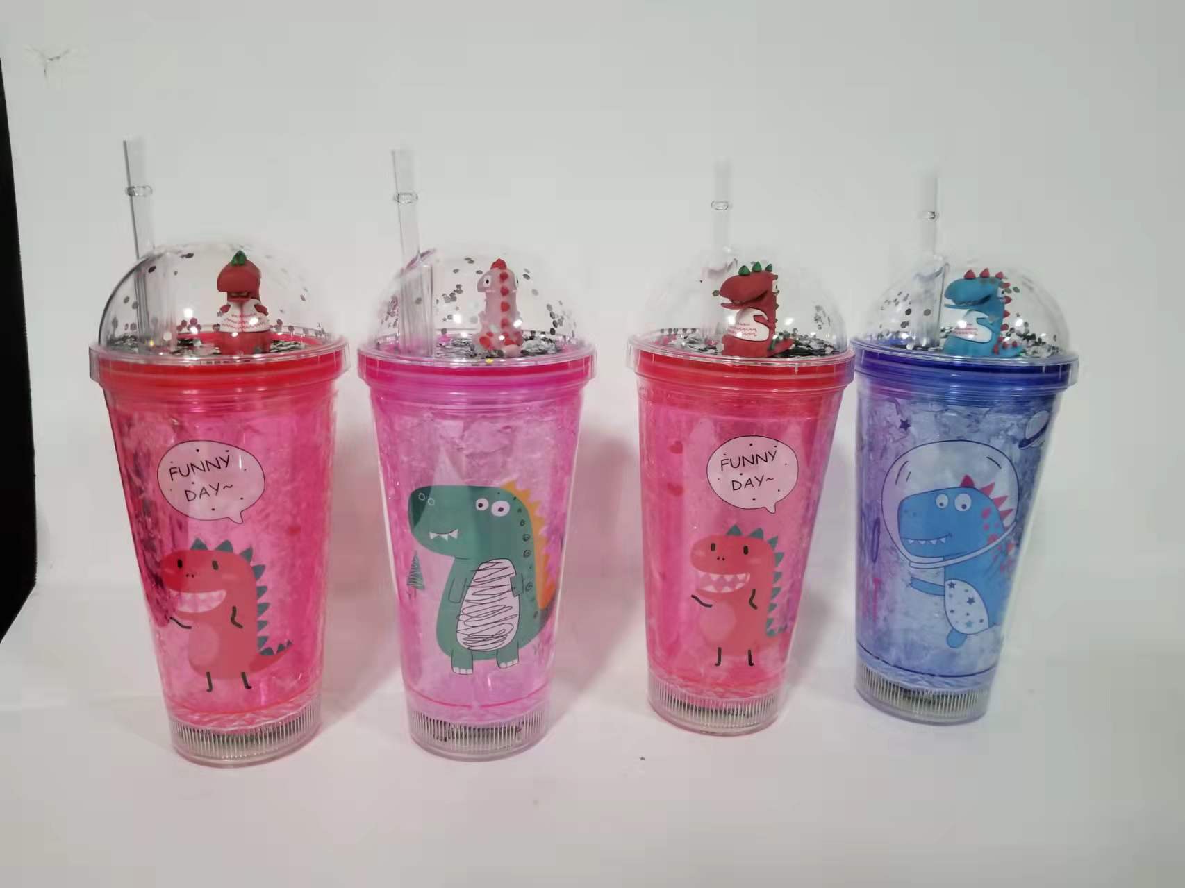 恐龙玩偶亮片创意双层塑料杯16oz冰杯厂家广告礼品吸管杯