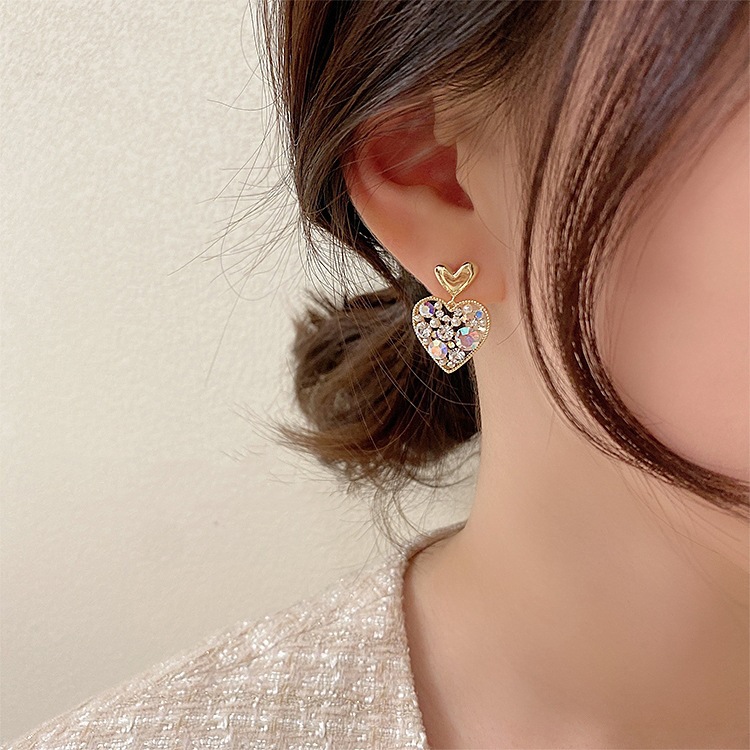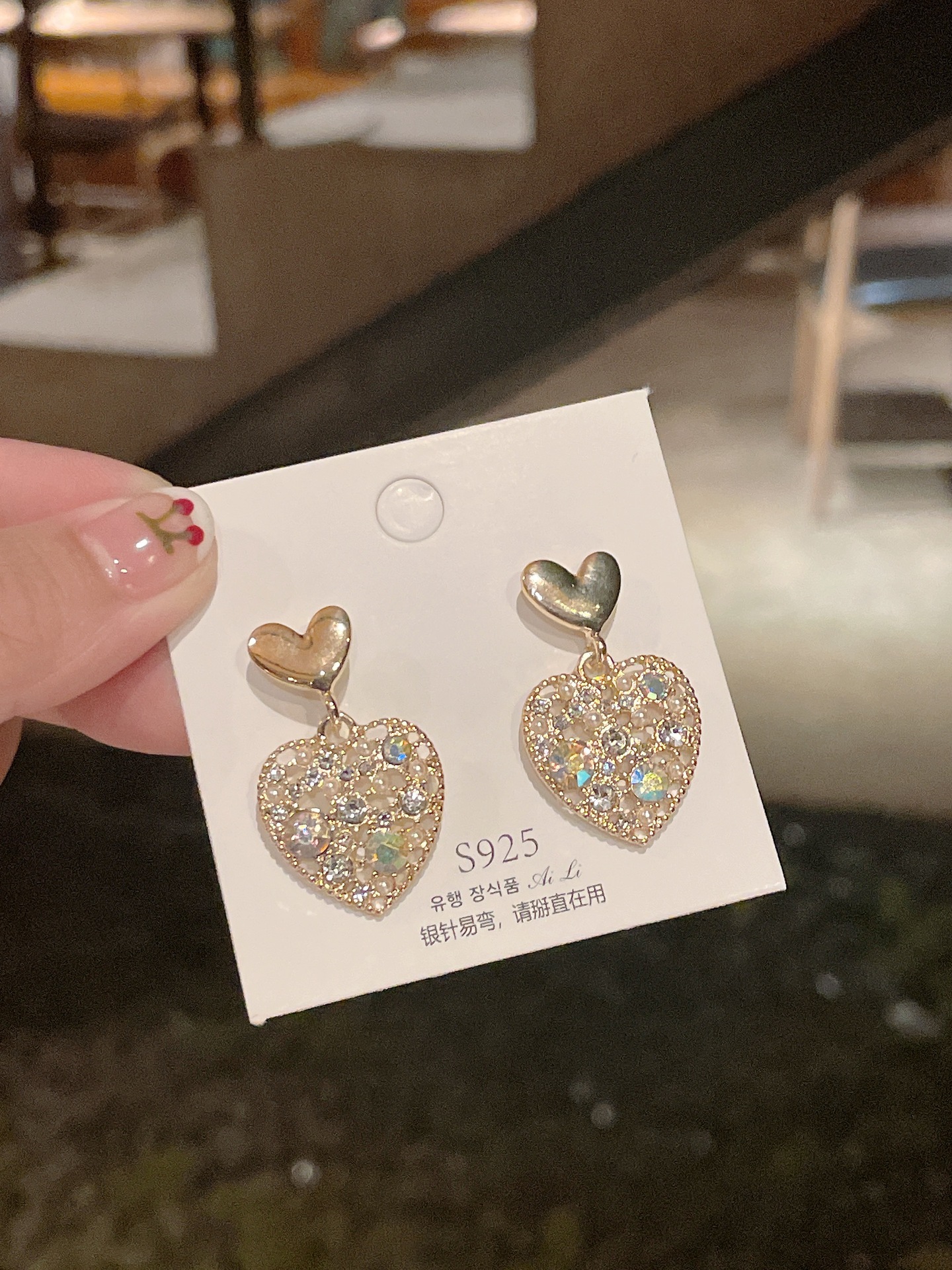 S925银针韩国东大门爱心满钻耳钉心形小巧奢华水钻时尚通勤耳环新