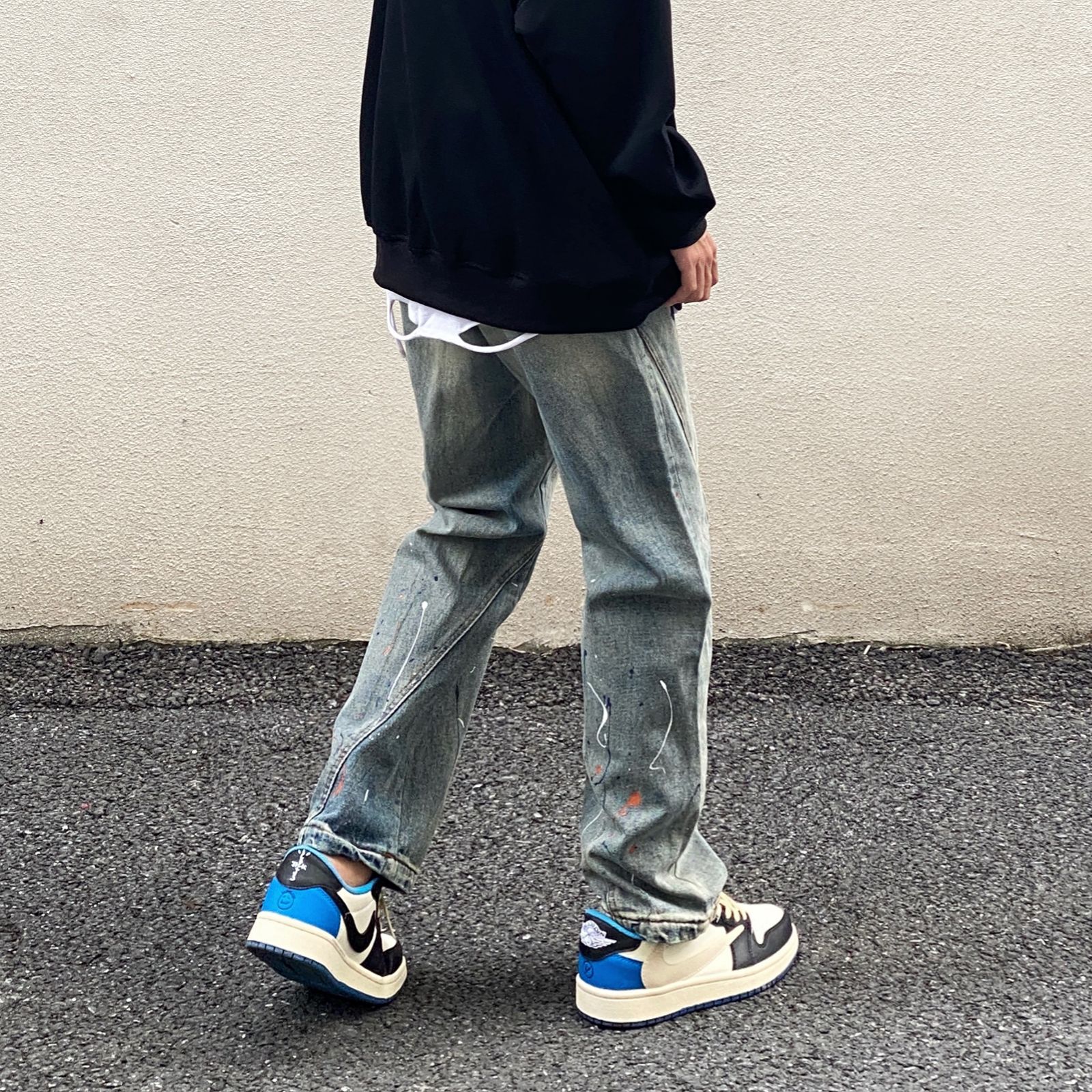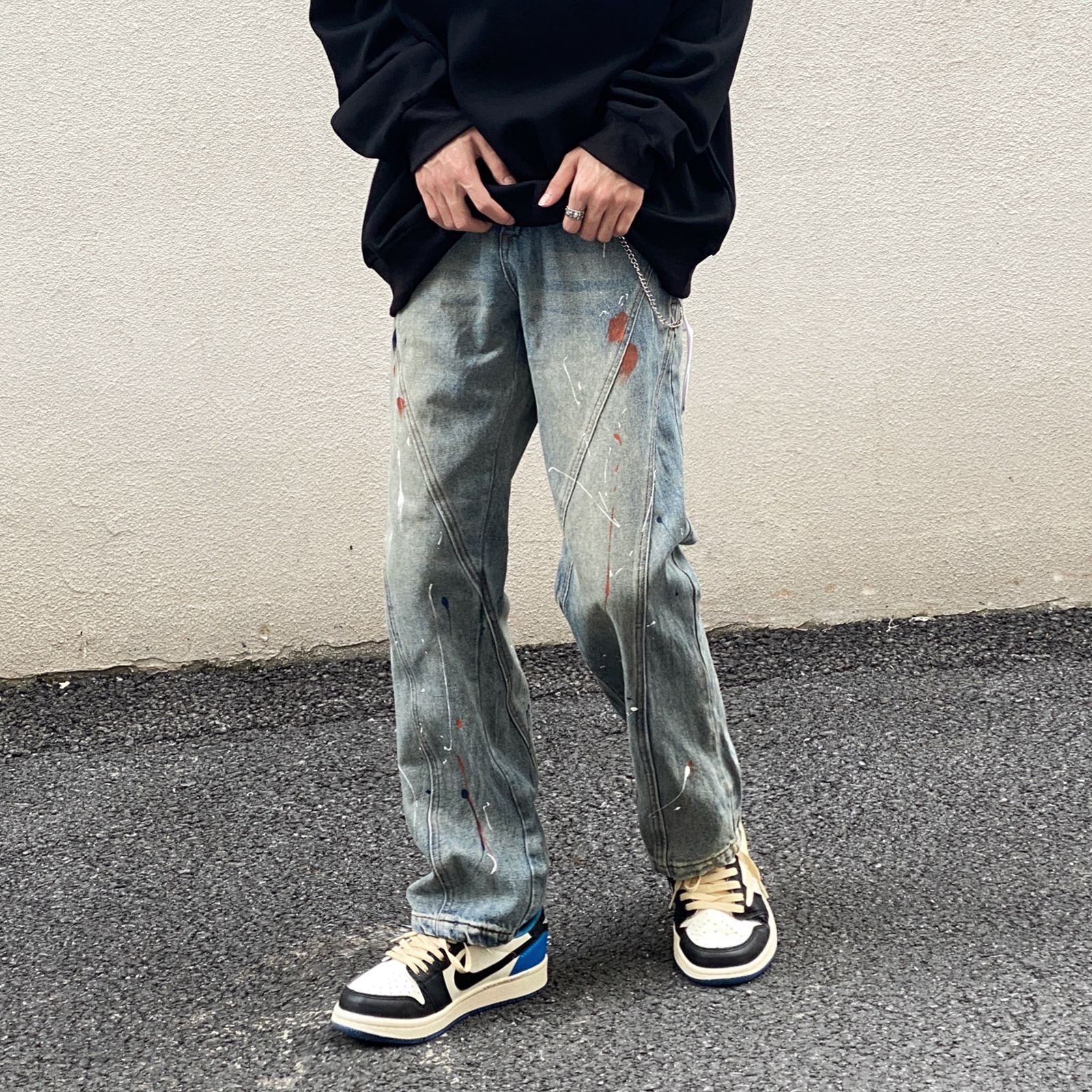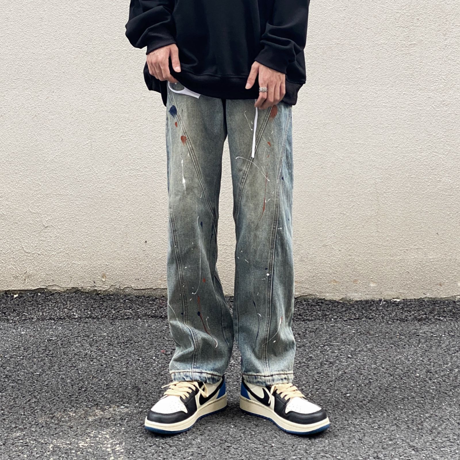 高街美式复古做旧泼墨涂鸦新款牛仔裤男宽松直筒潮牌拼接嘻哈裤子