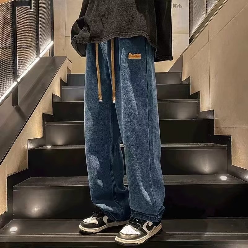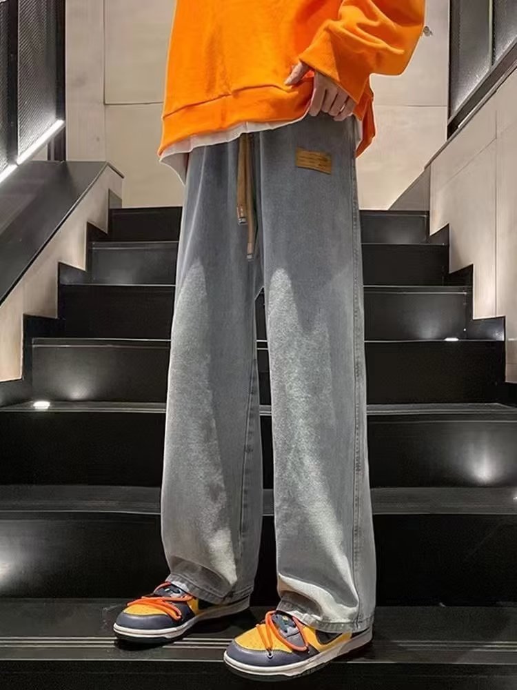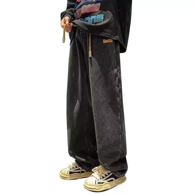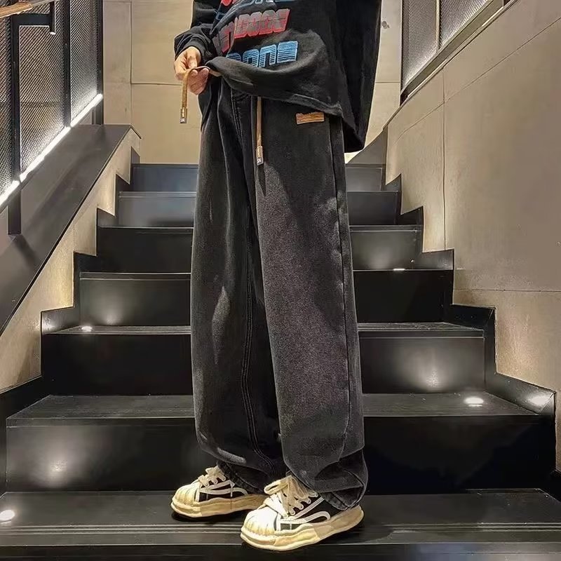 黑色牛仔裤男秋冬季复古水洗阔腿宽松直筒裤高街潮牌ins拖地裤子