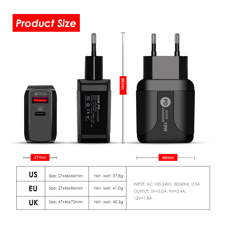 【裸机尺寸】:US-美规27*46*66mm、EU-欧规27*46*86mm、UK-英规47*46*72mm; 【裸机重量】:US-美规37.8g、EU-欧规41g、UK-英规40.3g;【输入参数】:AC100-240V 50--60Hz;0.5A; 【输出参数】:5V/2.4A; 【彩盒尺寸】:US-美规9*3.2*14cm、EU-欧规9*3.2*14cm、UK-英规9*5*14cm; 【彩盒重量】:US-美规20.2g、EU-欧规20.2、UK-英规26.2g; 【装箱尺寸】:US-美规49*29*38cm、EU-欧规49*29*46cm、UK-英规50*44*39cm; 【装箱重量】:US-美规21kg、EU-欧规23kg、UK-英规23kg; 【装箱数量】:500个/箱(裸机装箱); |