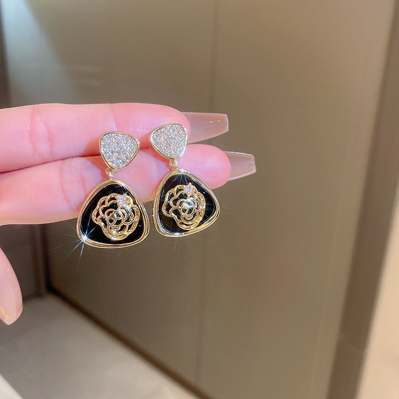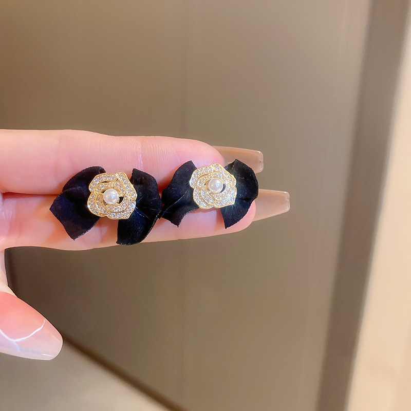 银针复古镶钻珍珠蝴蝶结花朵耳环法式高机感气质耳钉时尚耳饰批发