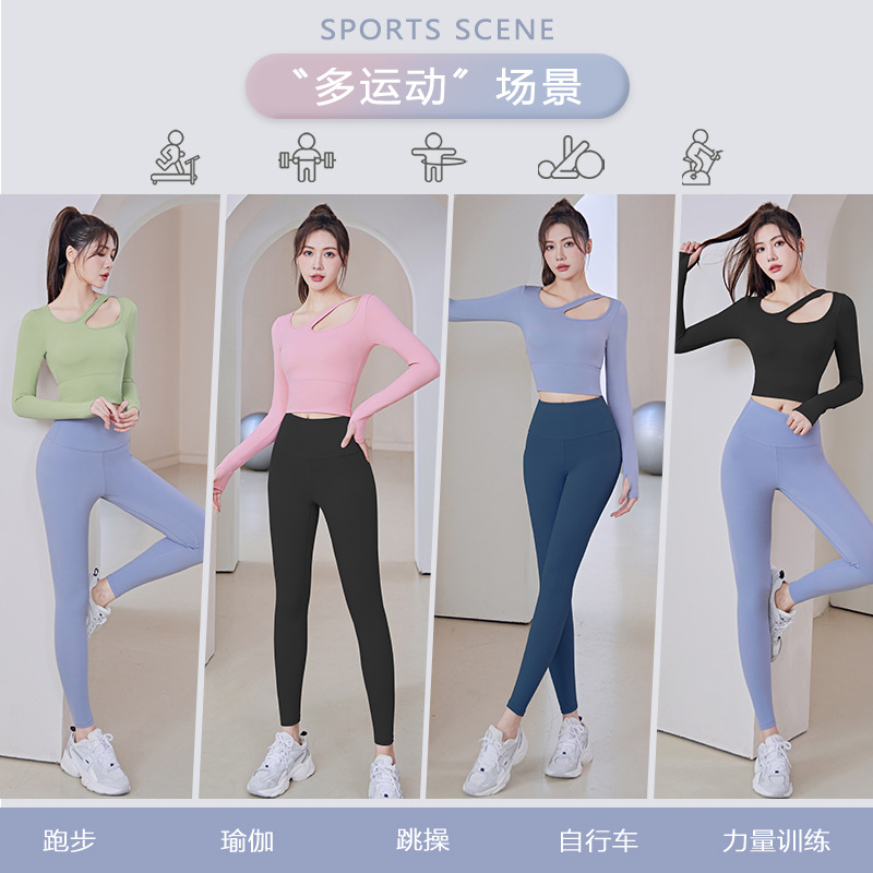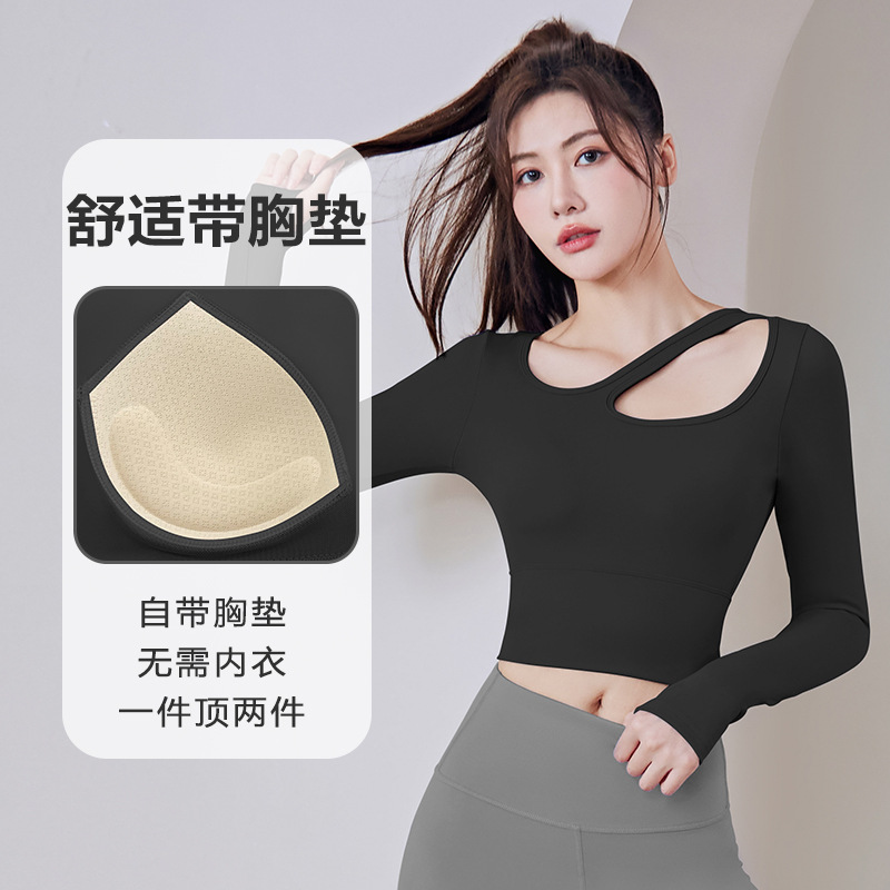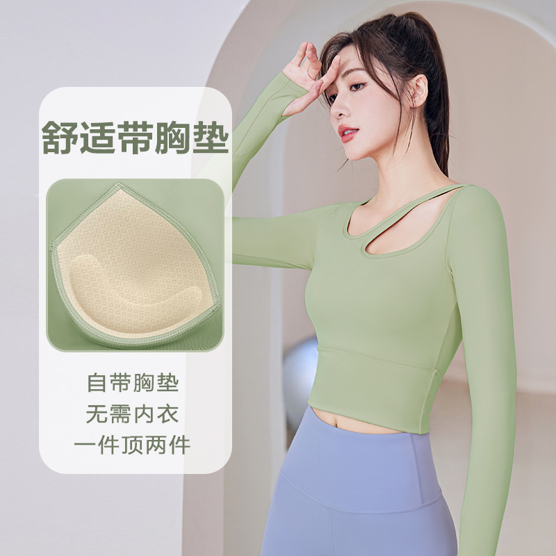 春夏新款带胸垫圆领健身跑步运动普拉提训练紧身长袖瑜伽服上衣