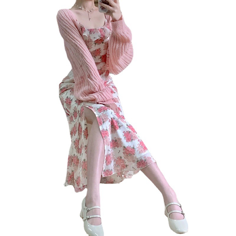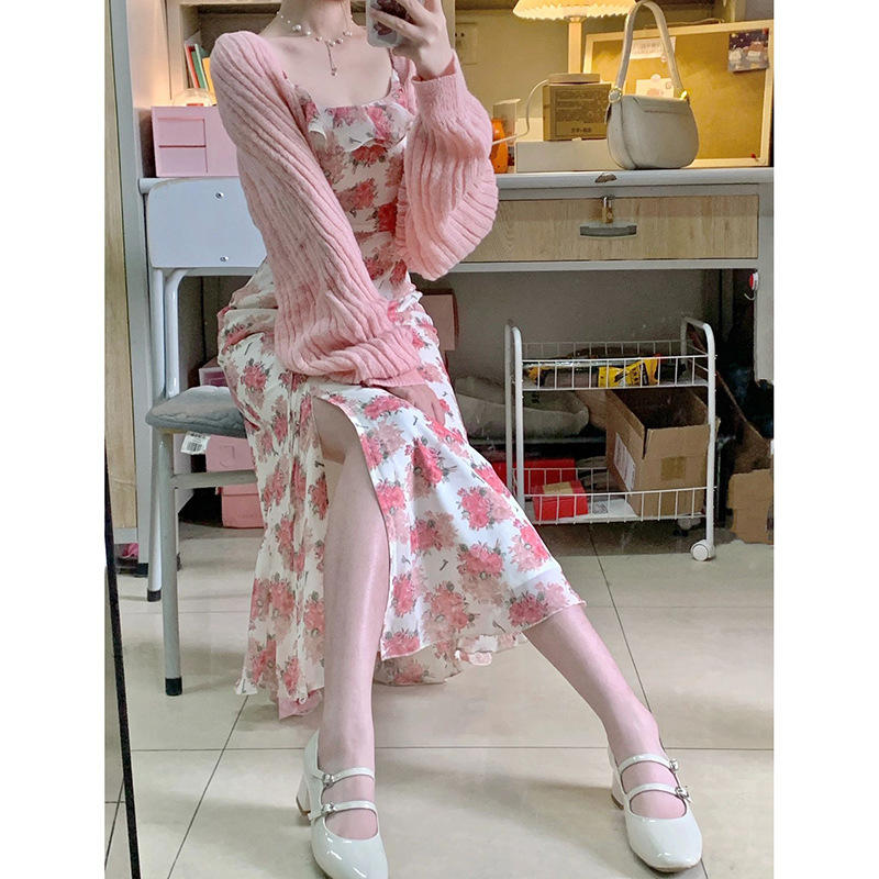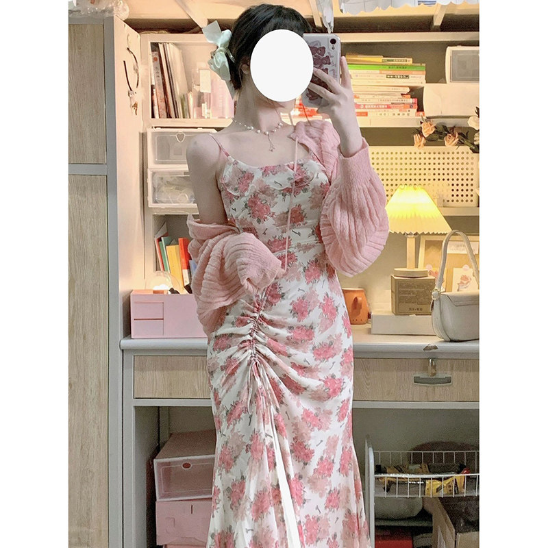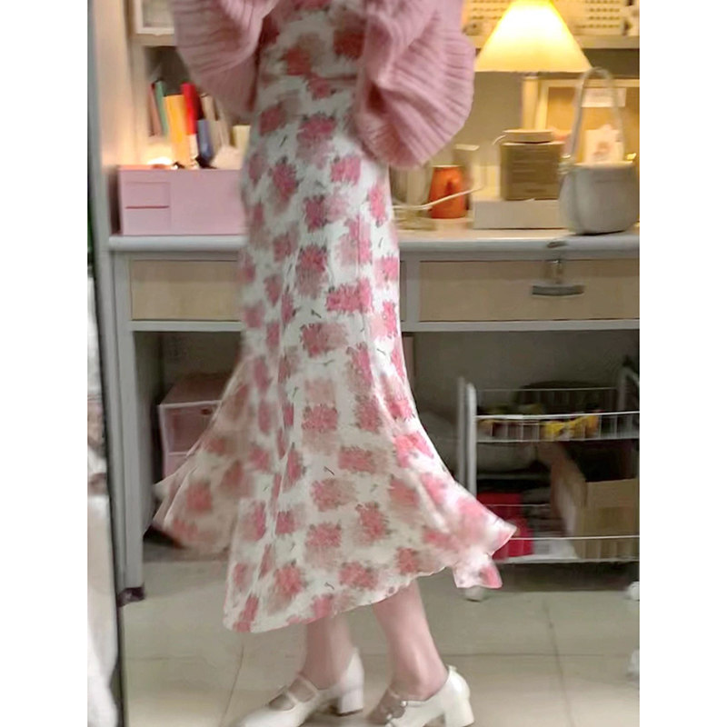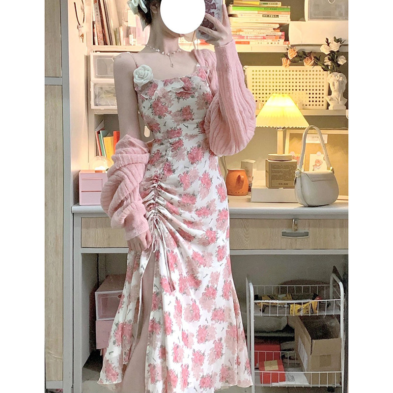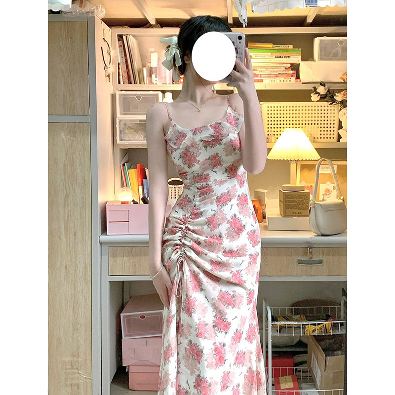 碎花吊带连衣裙女春季新款法式温柔风复古小众初恋鱼尾裙开叉长裙