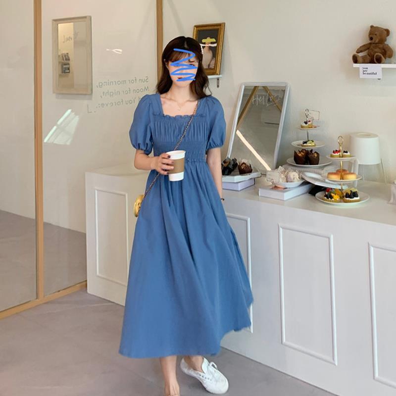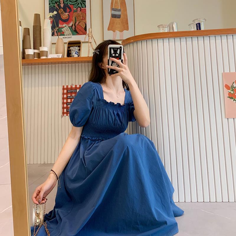 复古方领泡泡袖裙子2022年新款夏天薄款长裙显瘦显高气质连衣裙女