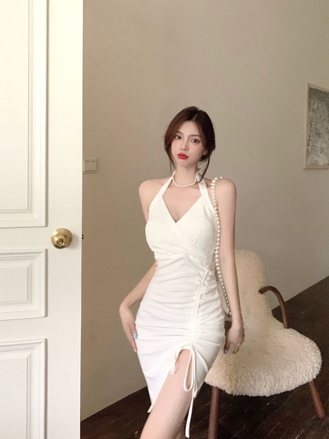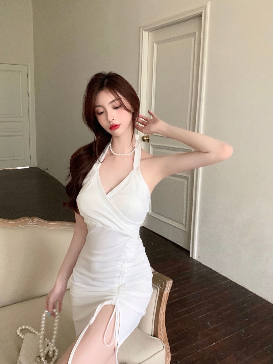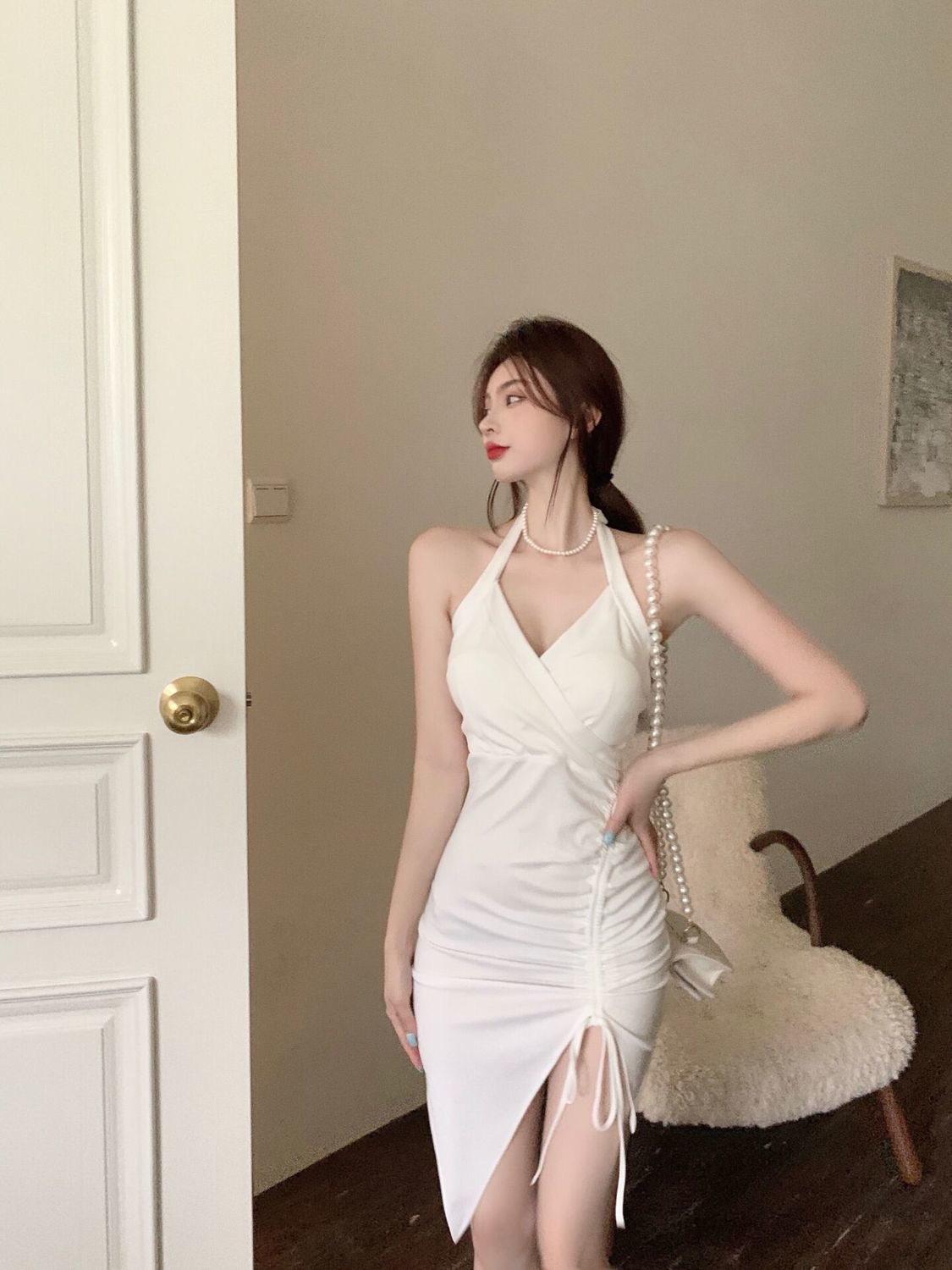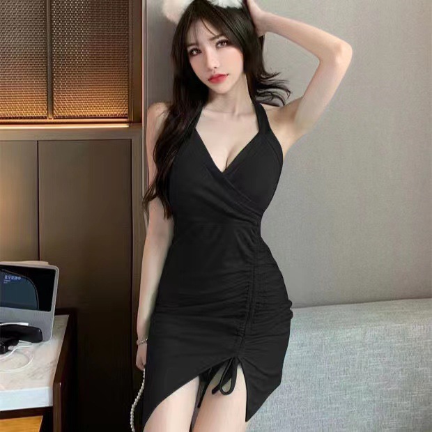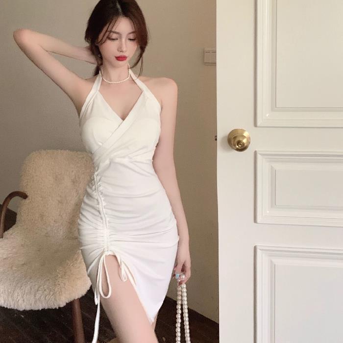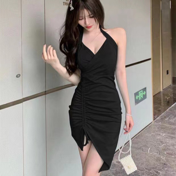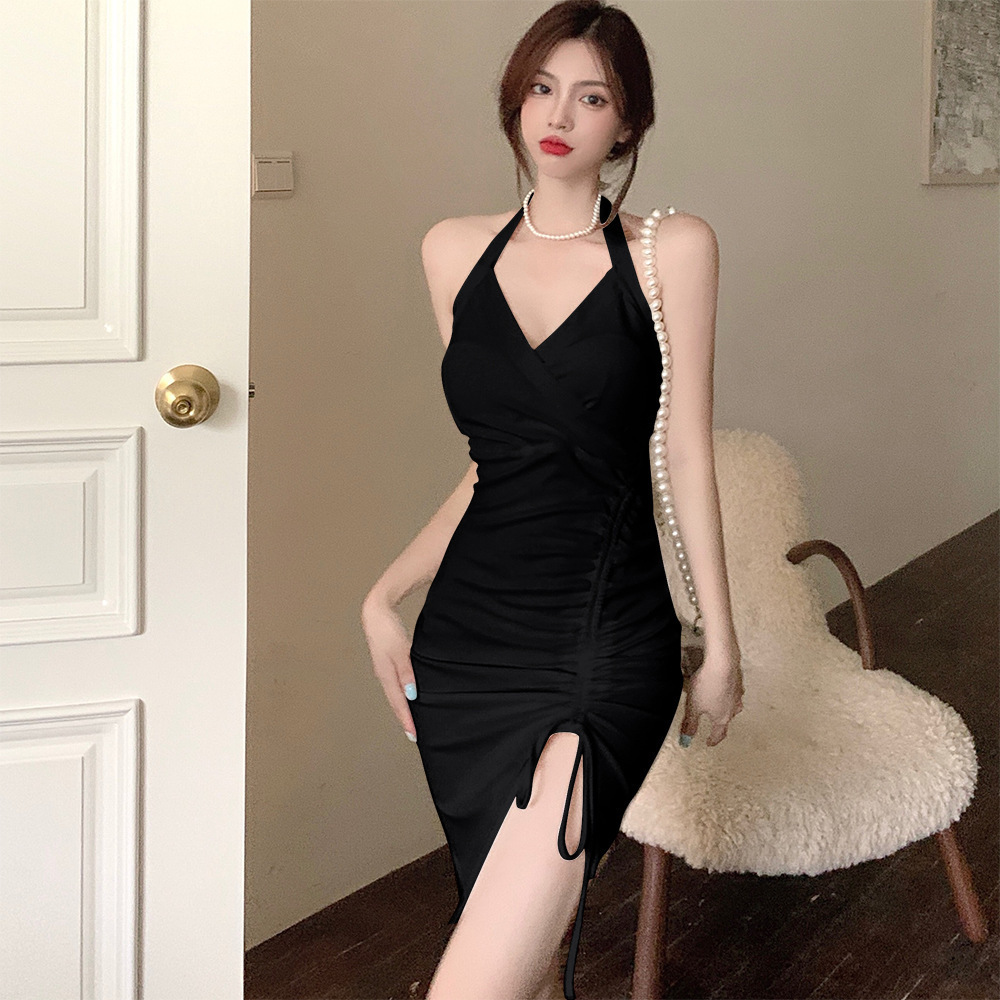 2022新款挂脖吊带连衣裙女夏季性感V领气质修身裙子开叉包臀短裙