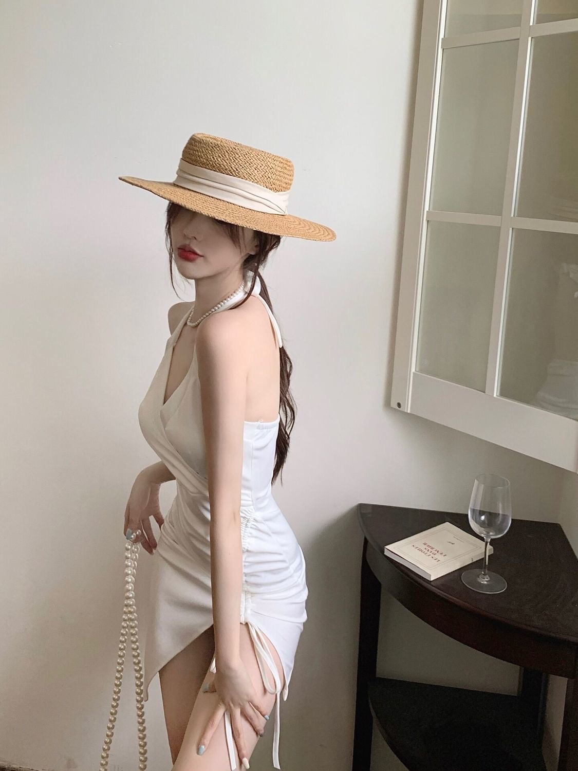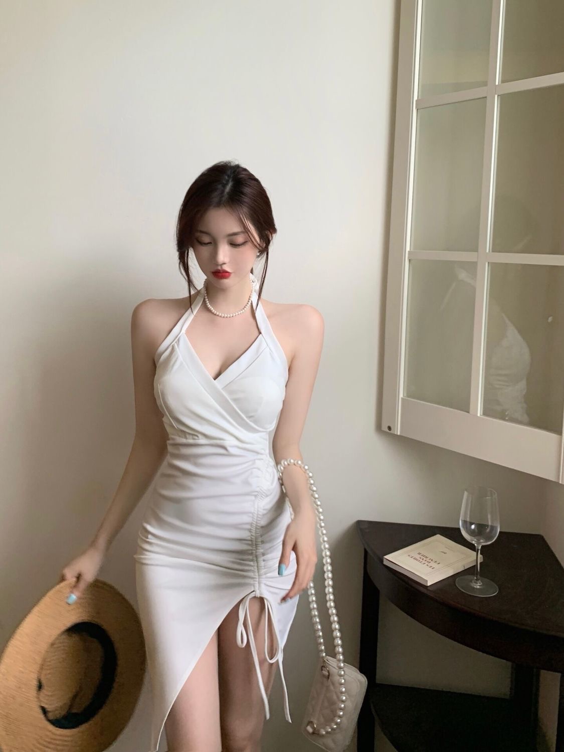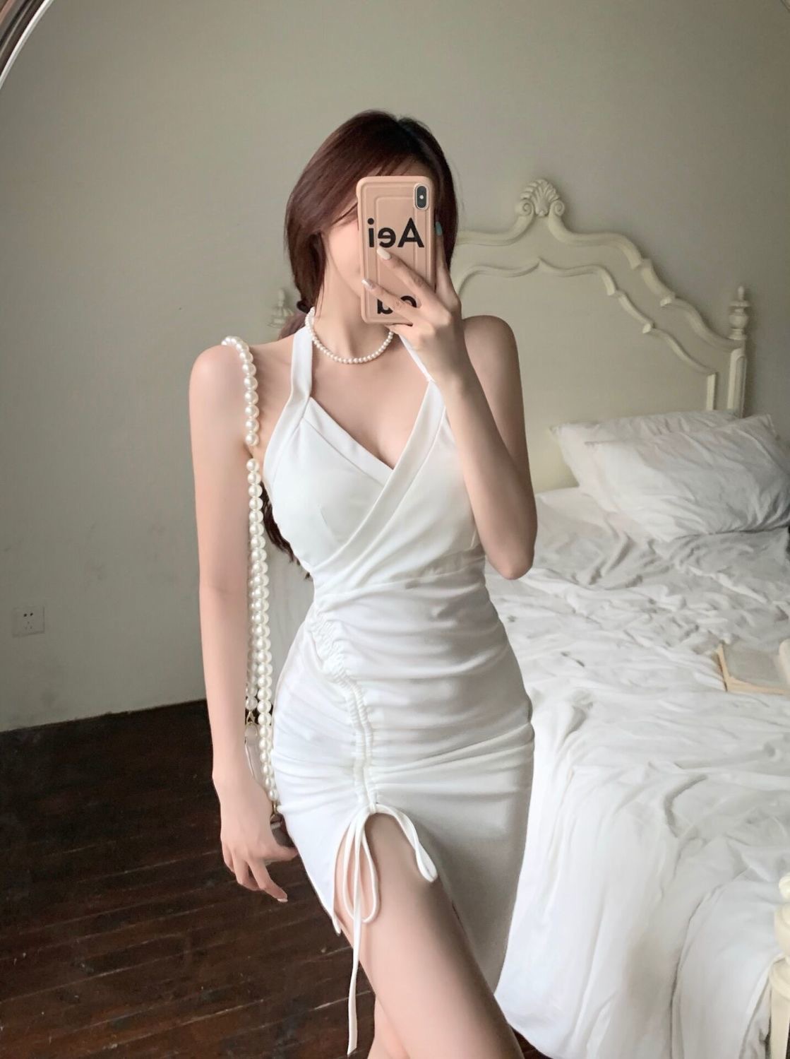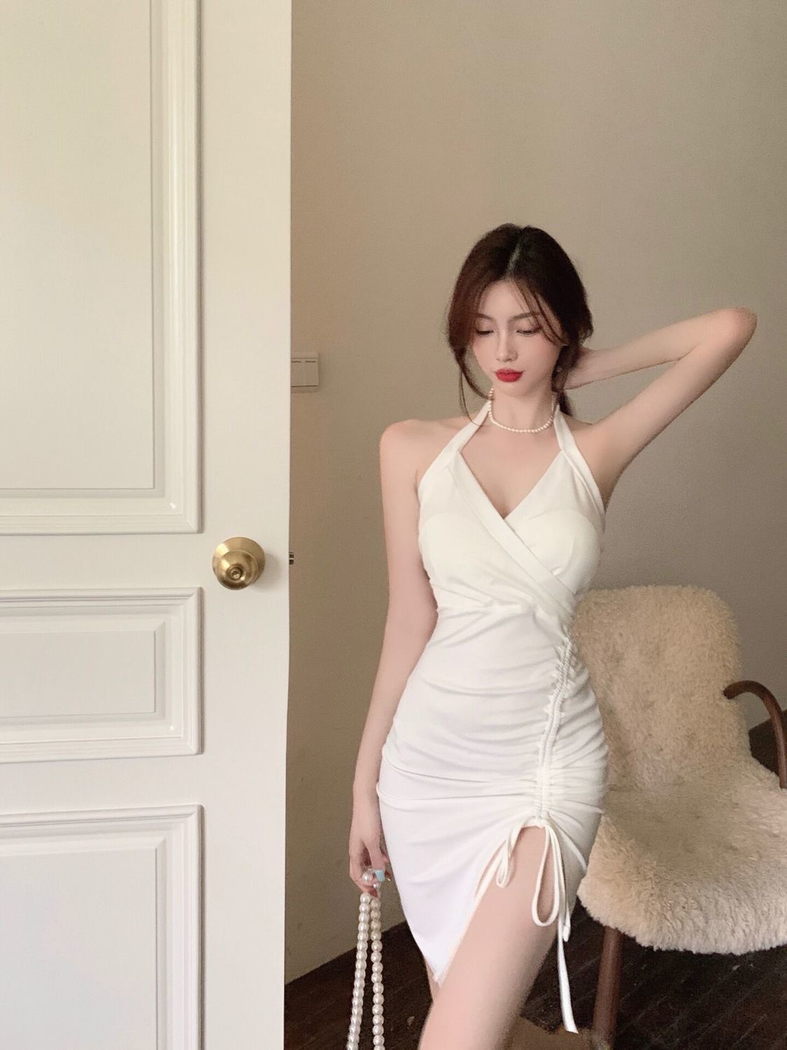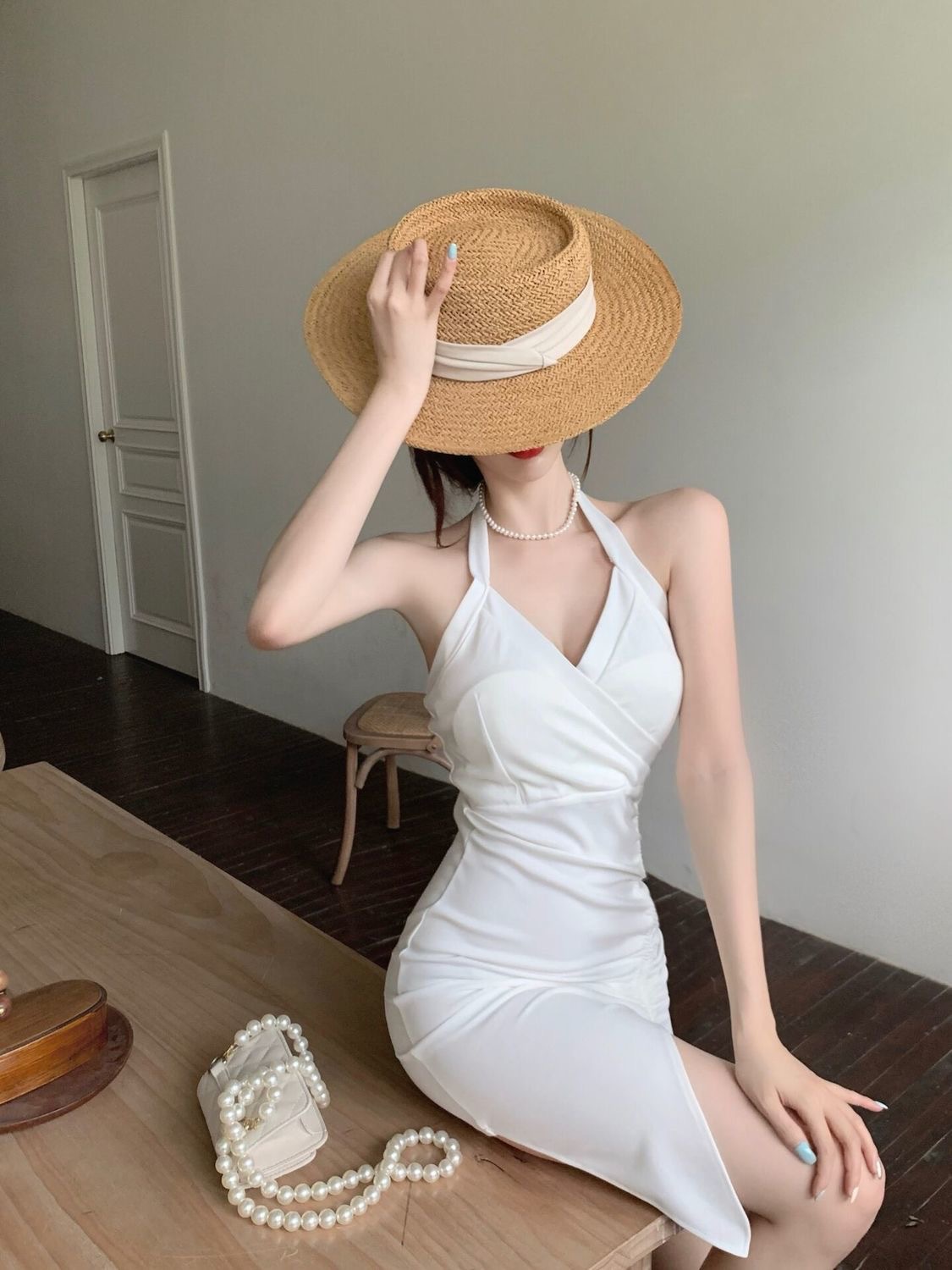 2022新款挂脖吊带连衣裙女夏季性感V领气质修身裙子开叉包臀短裙