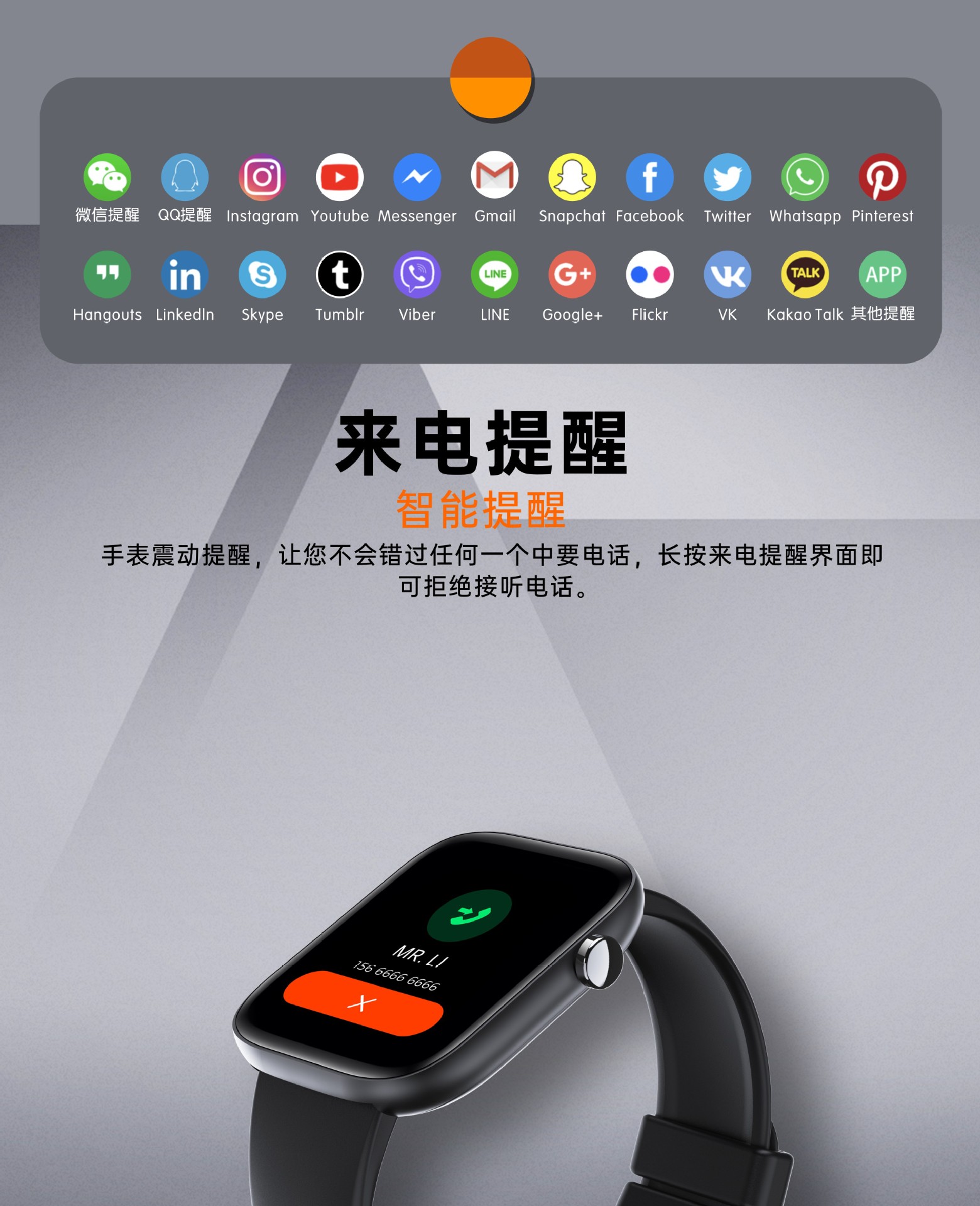 | 其他功能 | QQ、微信、Facebook、WhatsApp、Line等提醒 |
