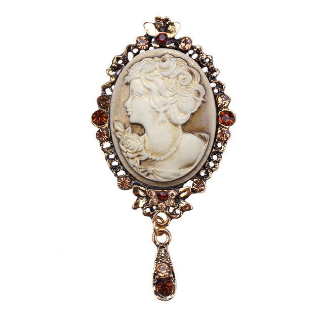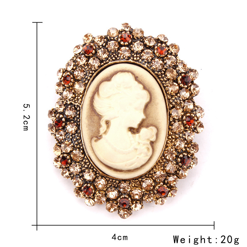 电镀合金复古胸花女 服装配饰品别针批发欧美时尚水钻美人头胸针