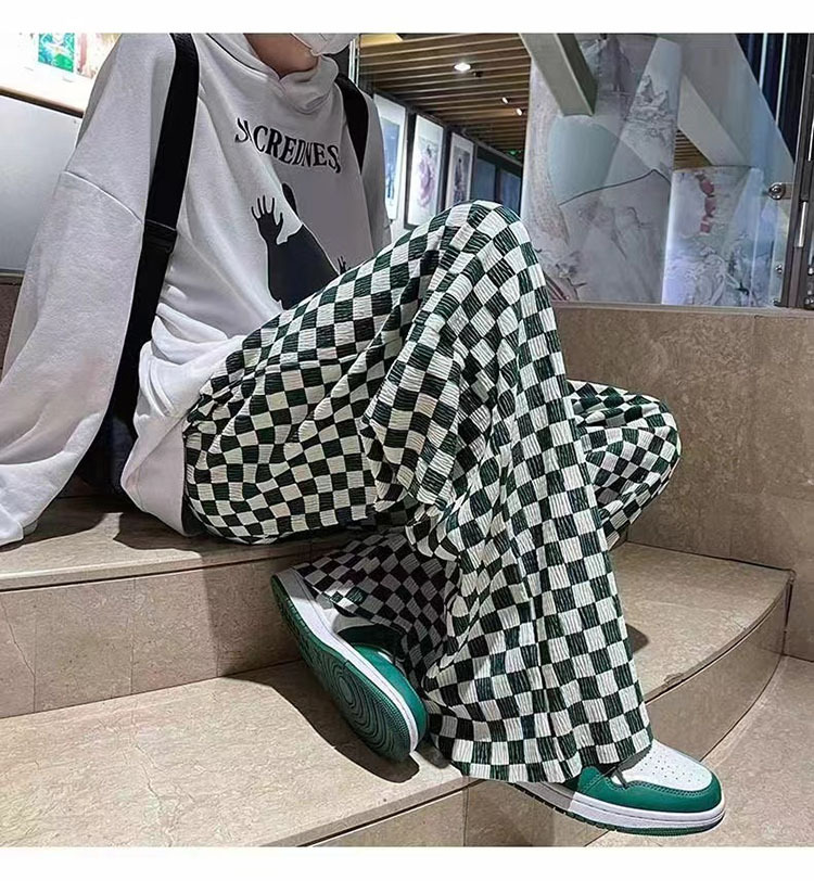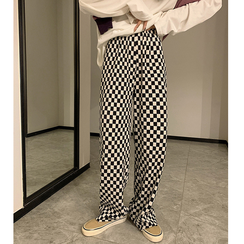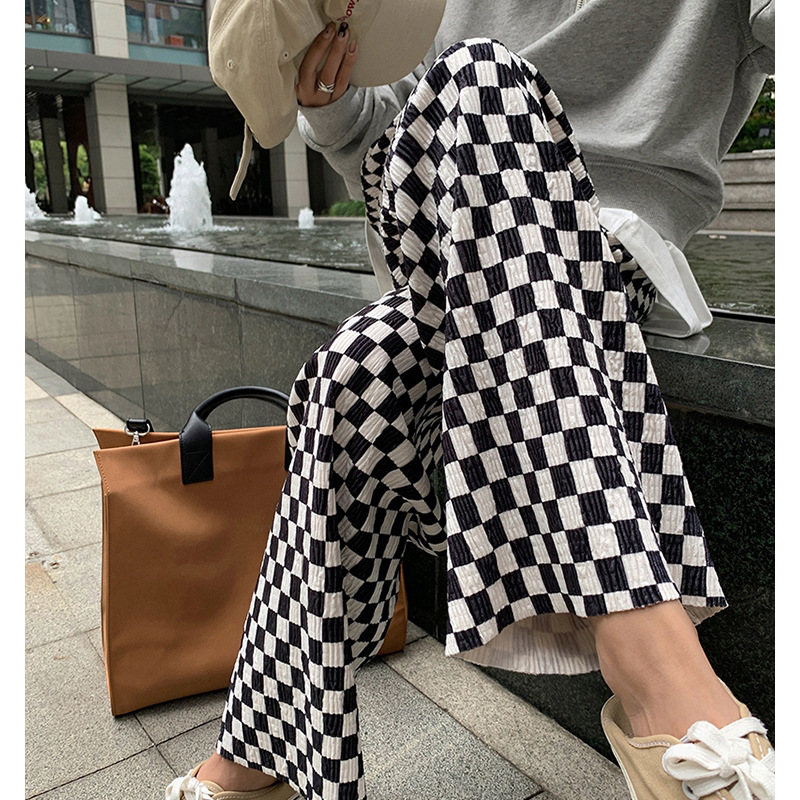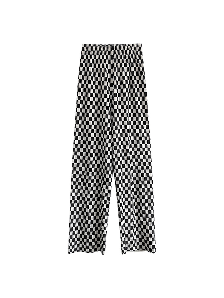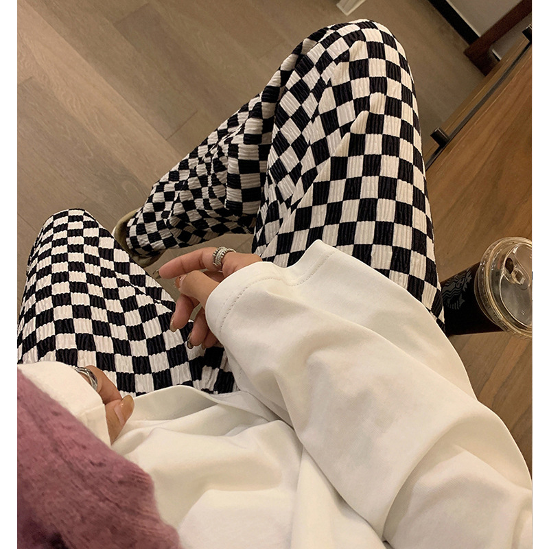 2024新款黑白棋盘格子休闲裤女直筒宽松复古阔腿裤