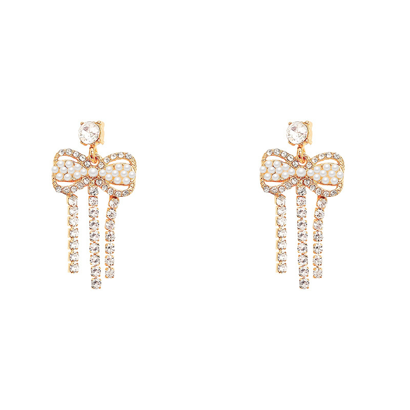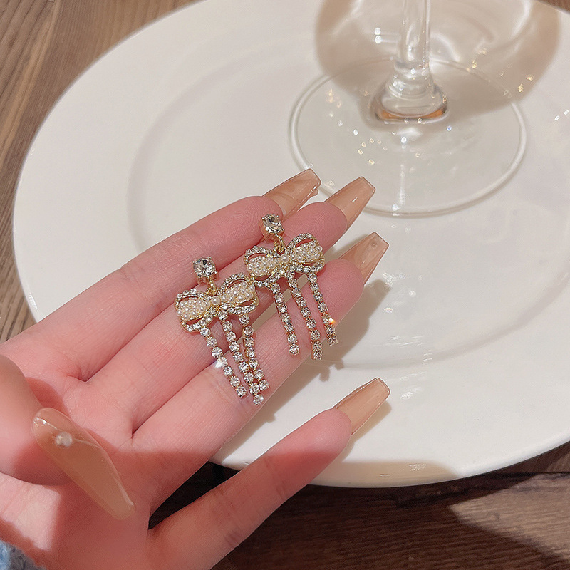 925银针ins潮百搭气质珍珠蝴蝶结耳钉轻奢小众长款流苏水钻耳环女