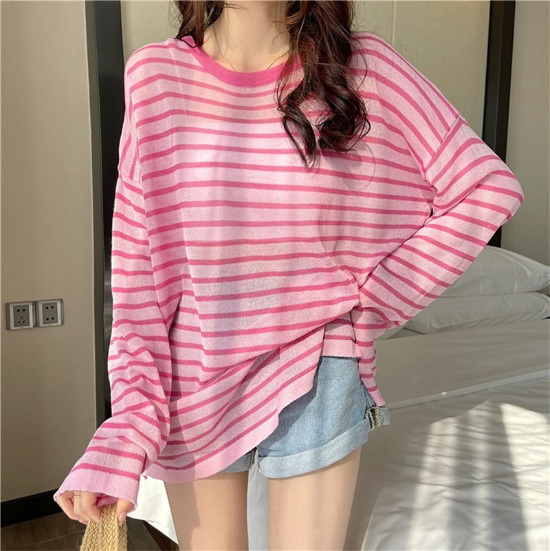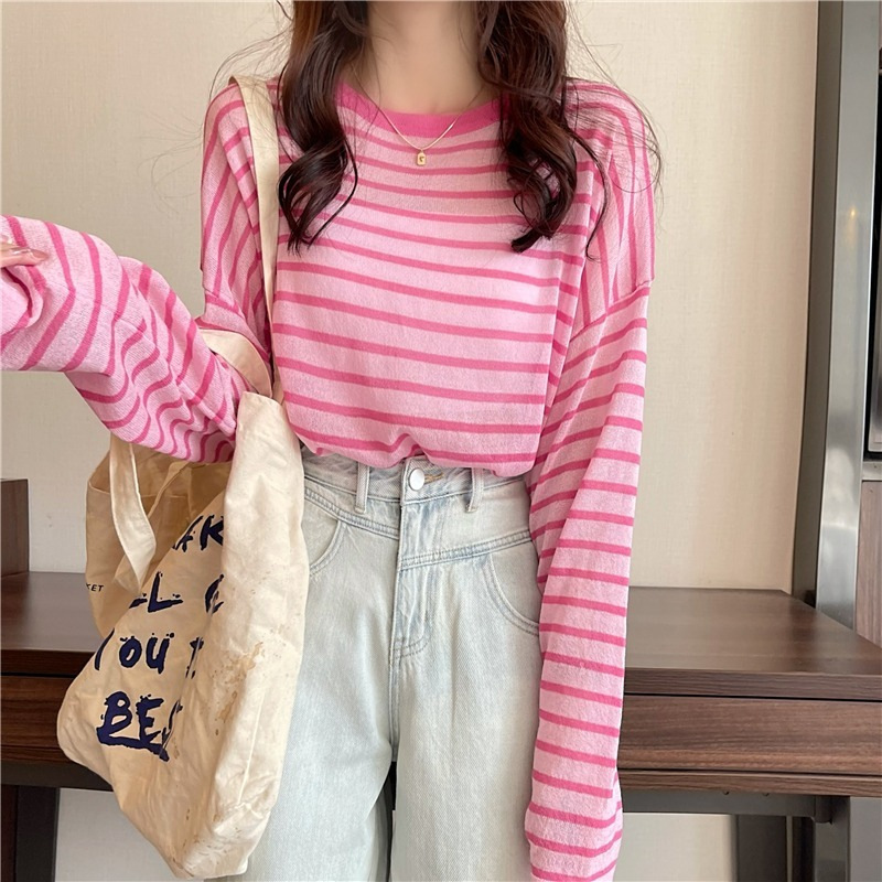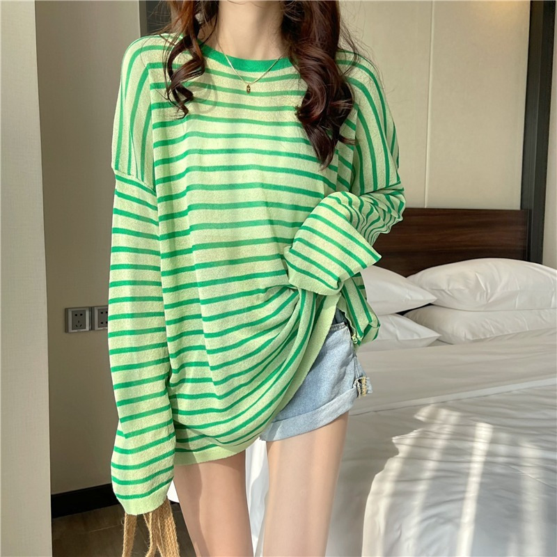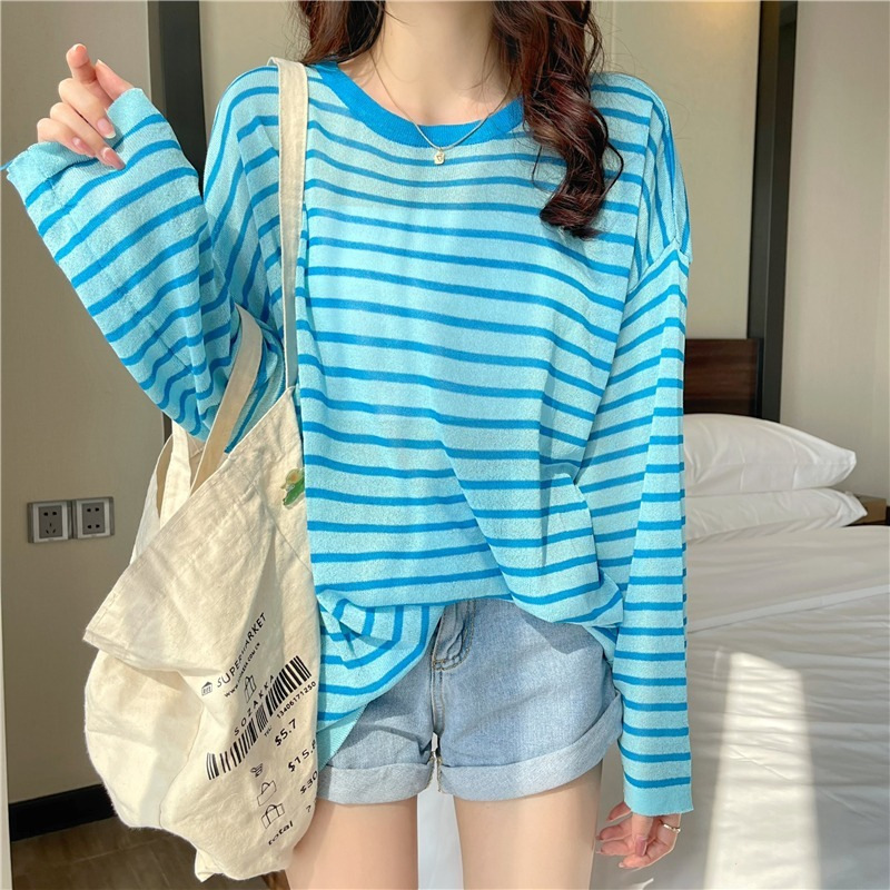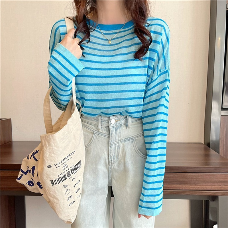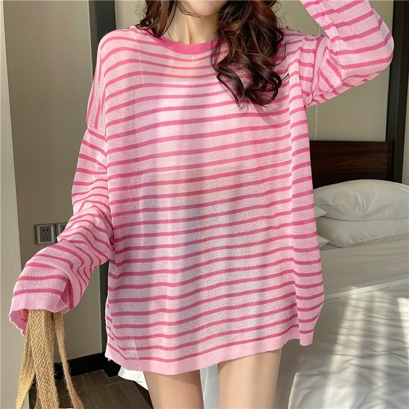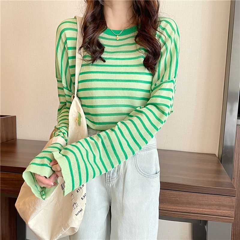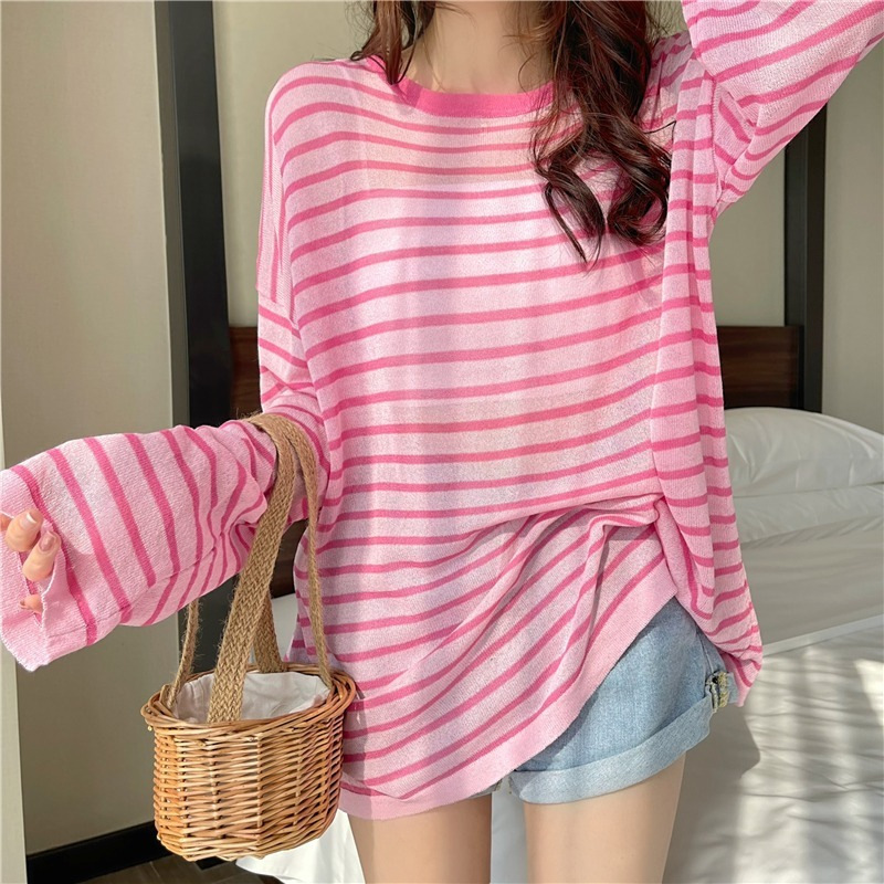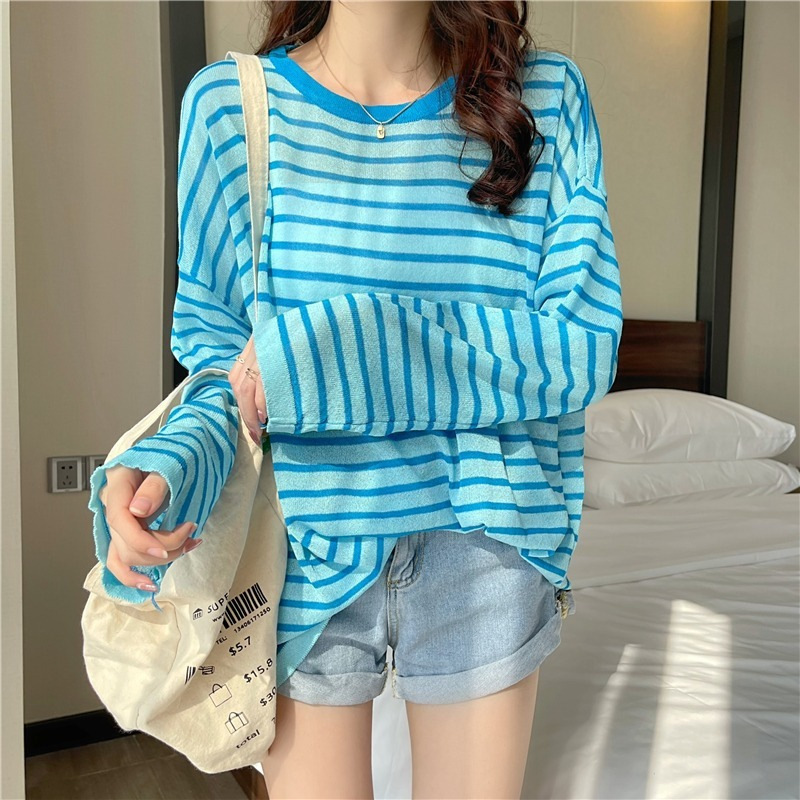 薄款糖果色圆领长袖防晒衣女夏季新款透气条纹针织空调衫大码上衣