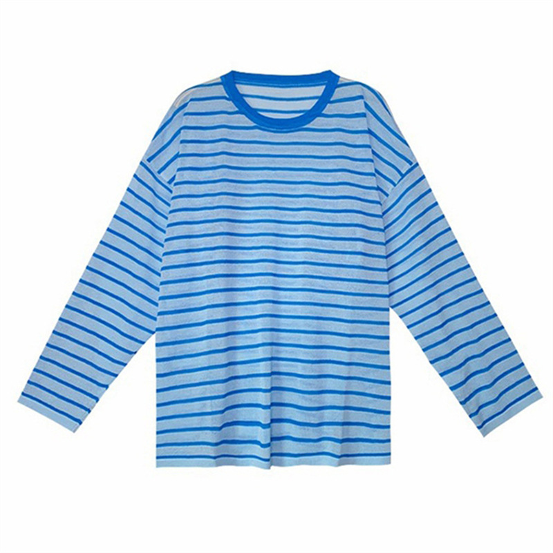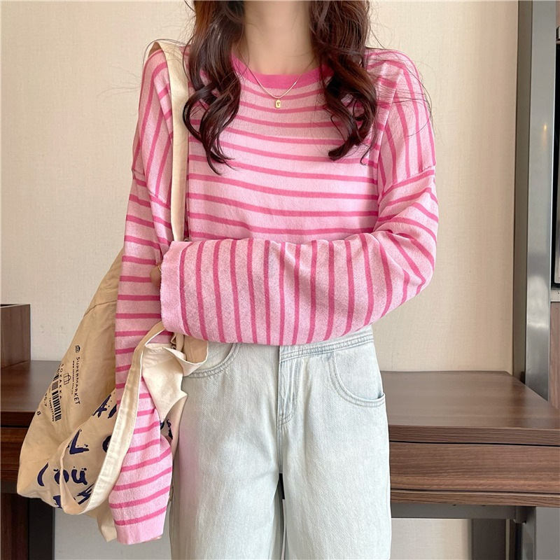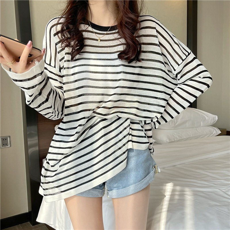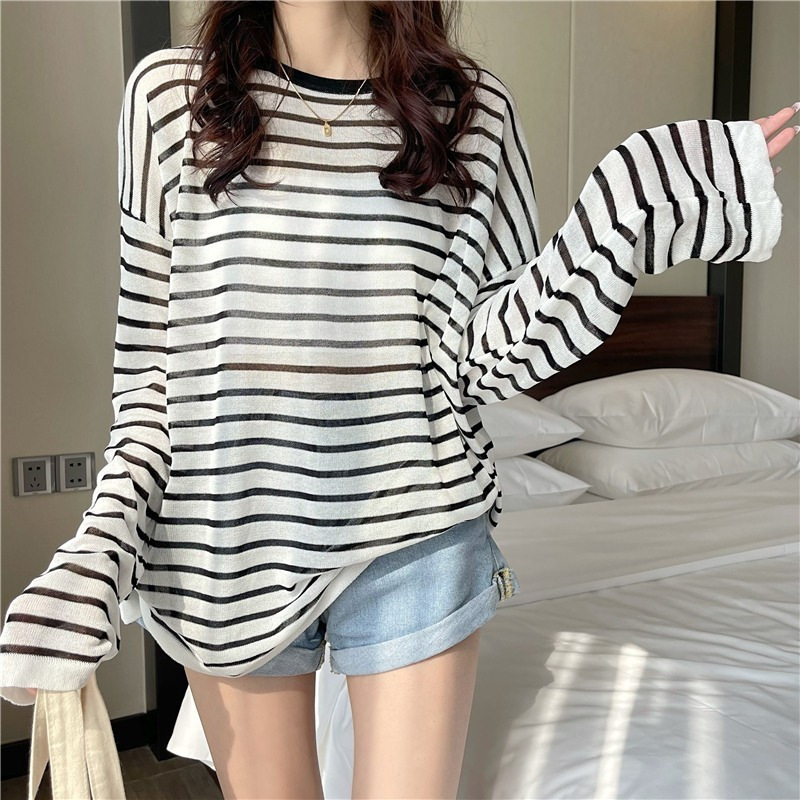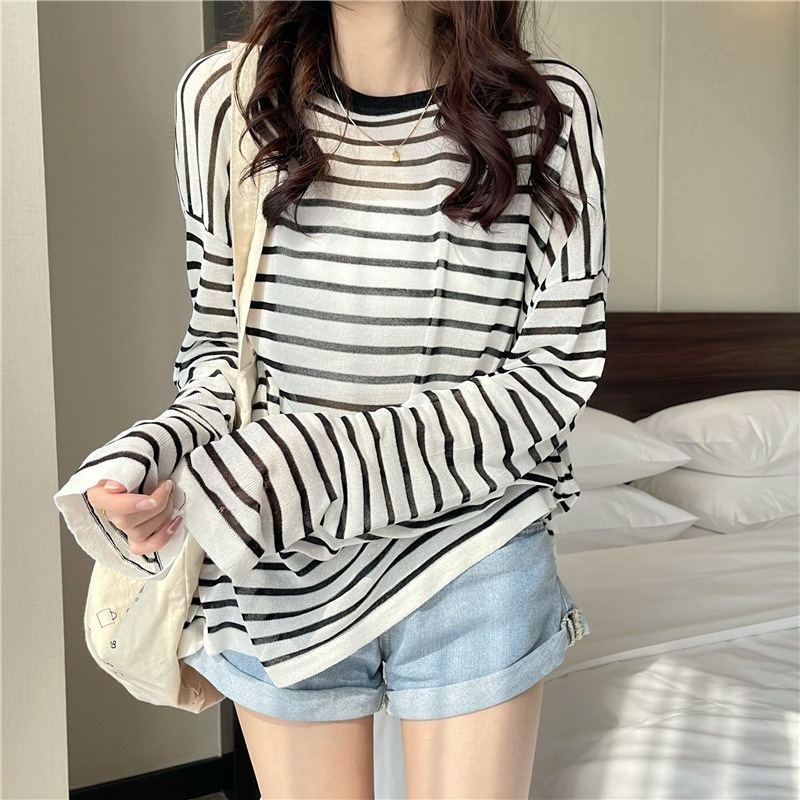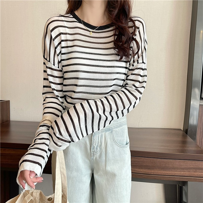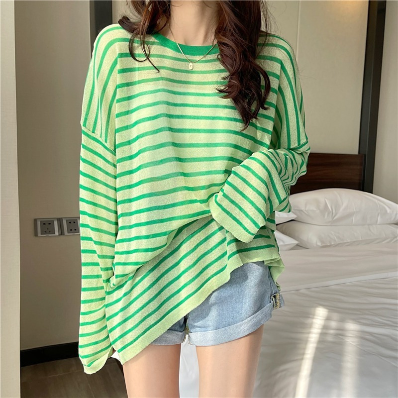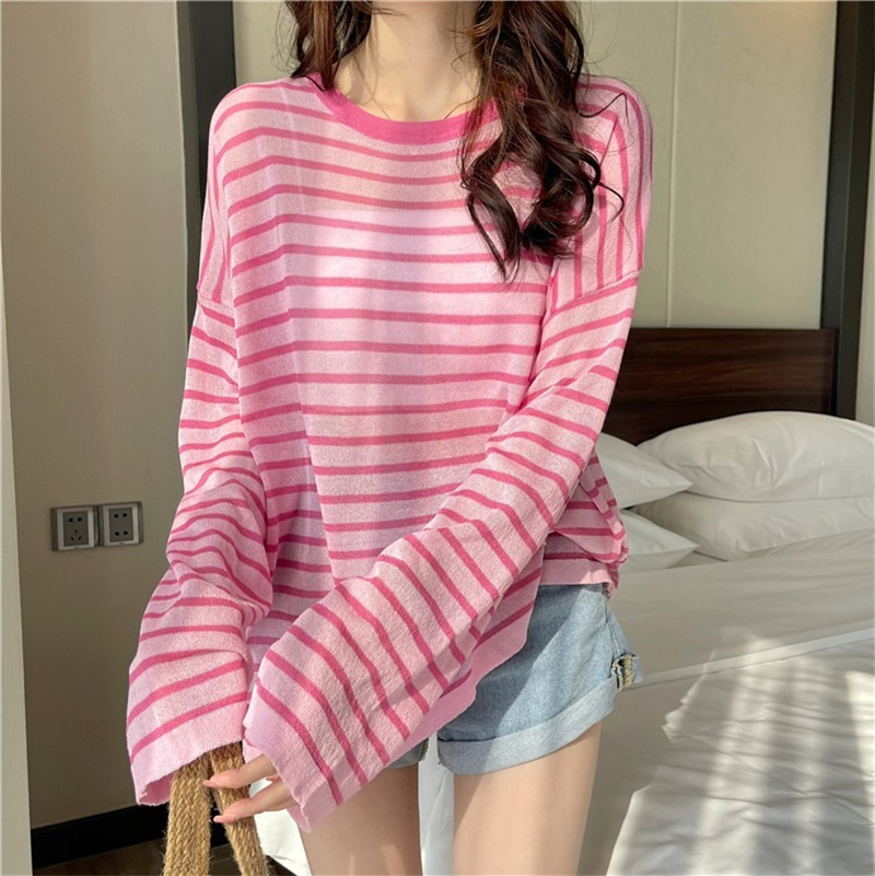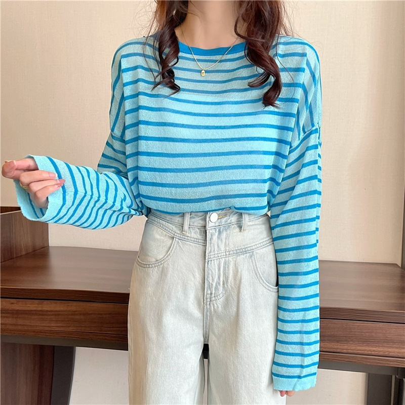 薄款糖果色圆领长袖防晒衣女夏季新款透气条纹针织空调衫大码上衣