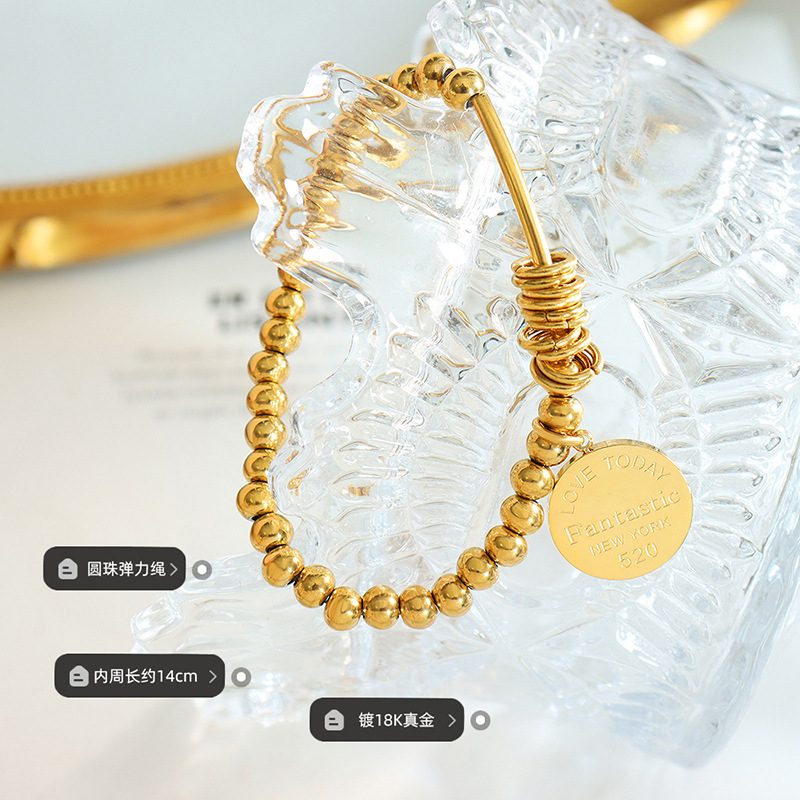 欧美情侣款流行热销饰品圆牌钢珠弹力手链厂家直销 钛钢不掉色