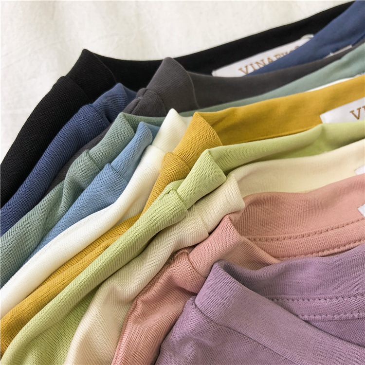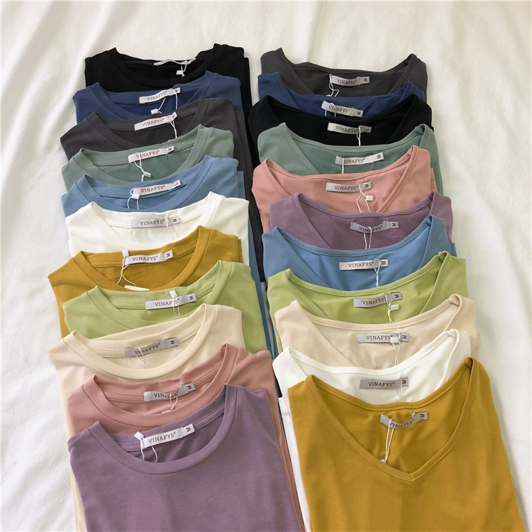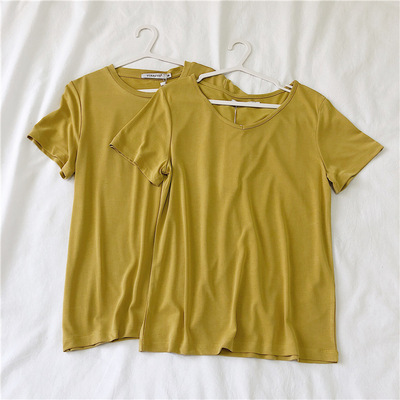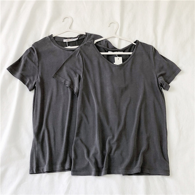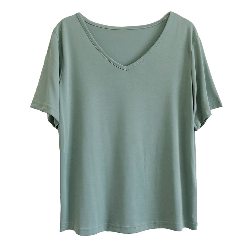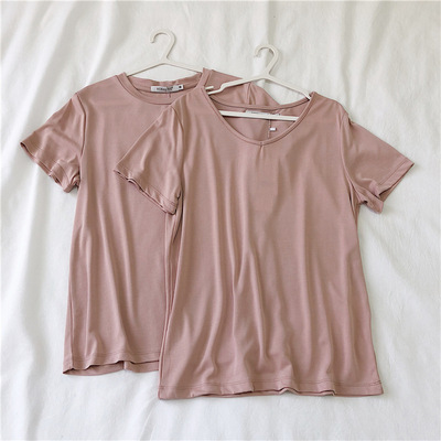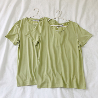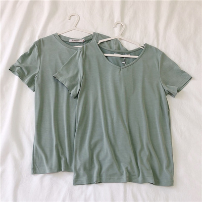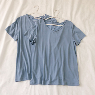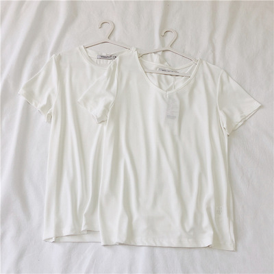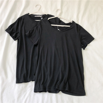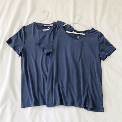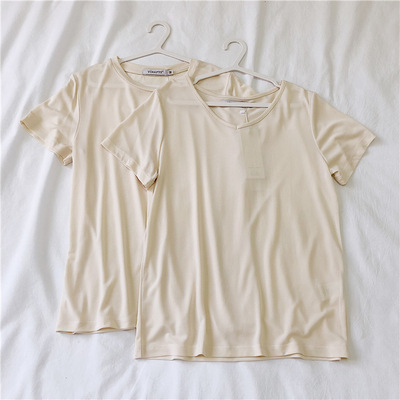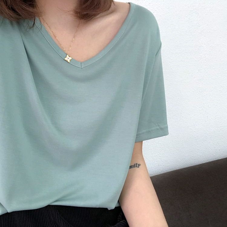 软糯~纯色短袖T恤女韩版宽松显瘦休闲大V领铜氨丝打底衫夏季新款