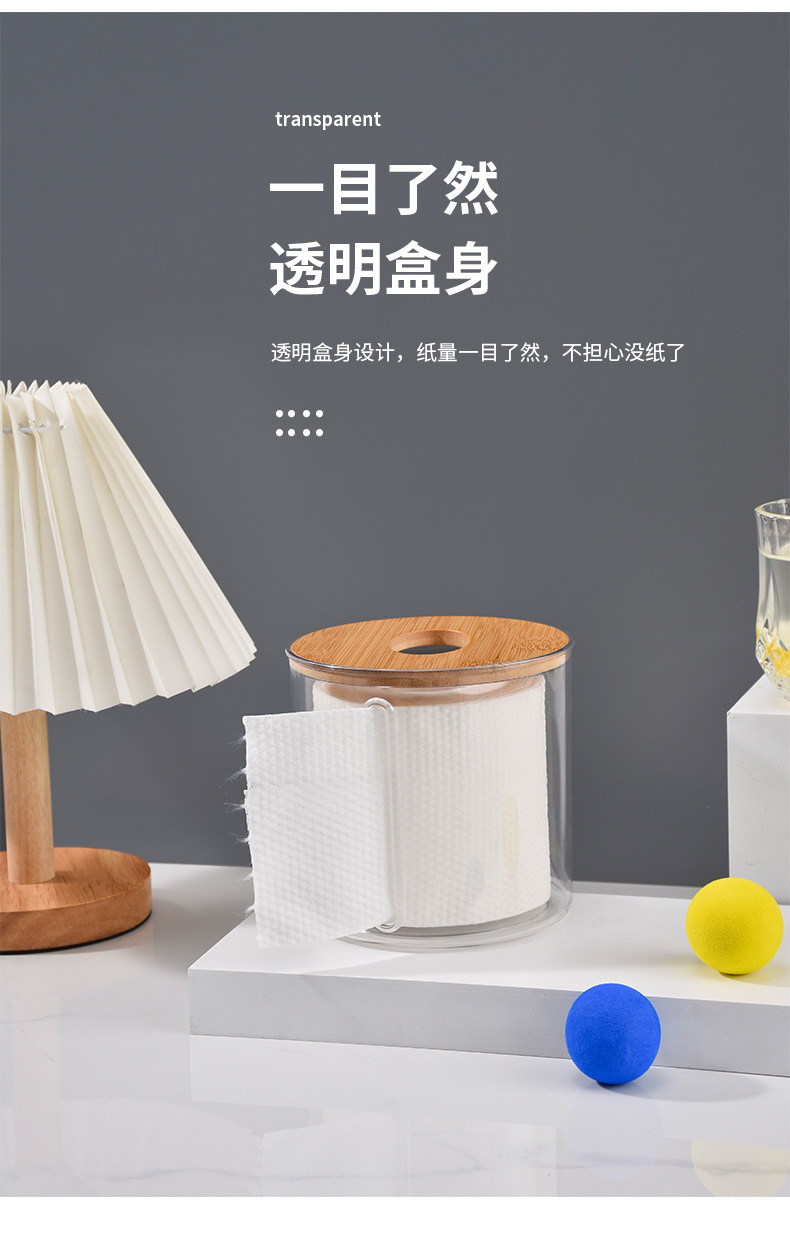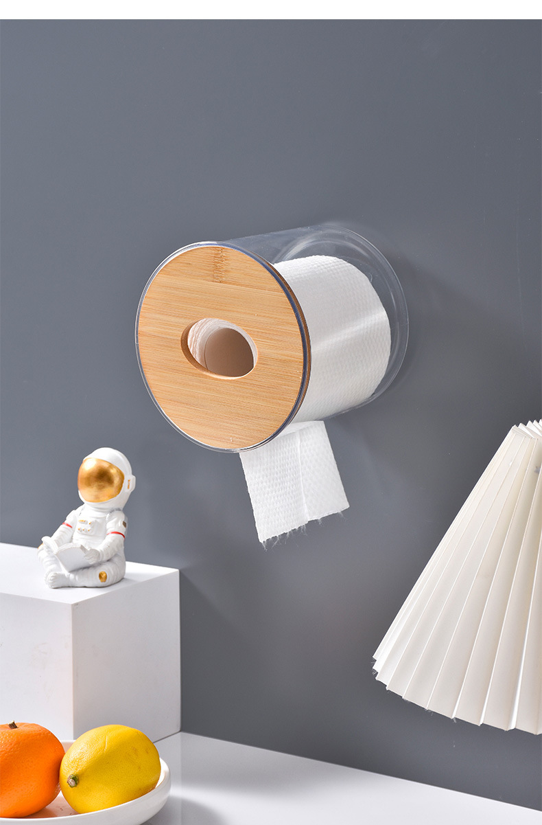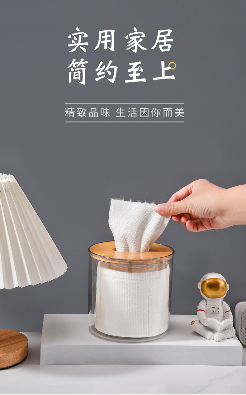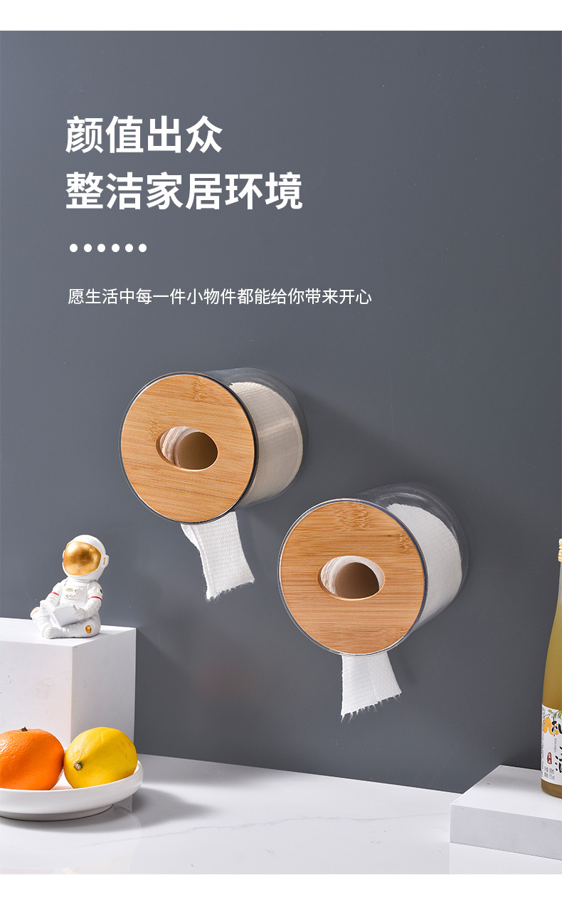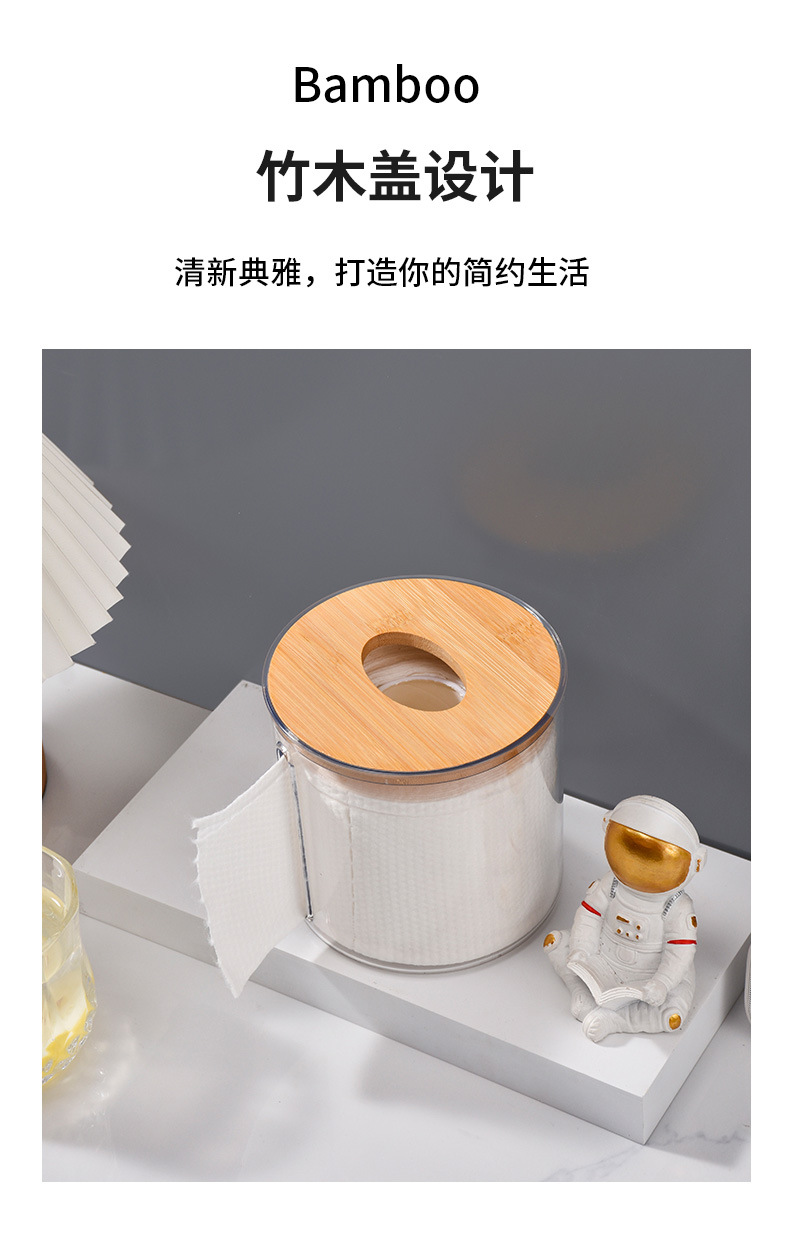 创意圆形塑料收纳纸巾盒家用抽纸盒竹木盖酒店壁挂式卫生间纸巾架
