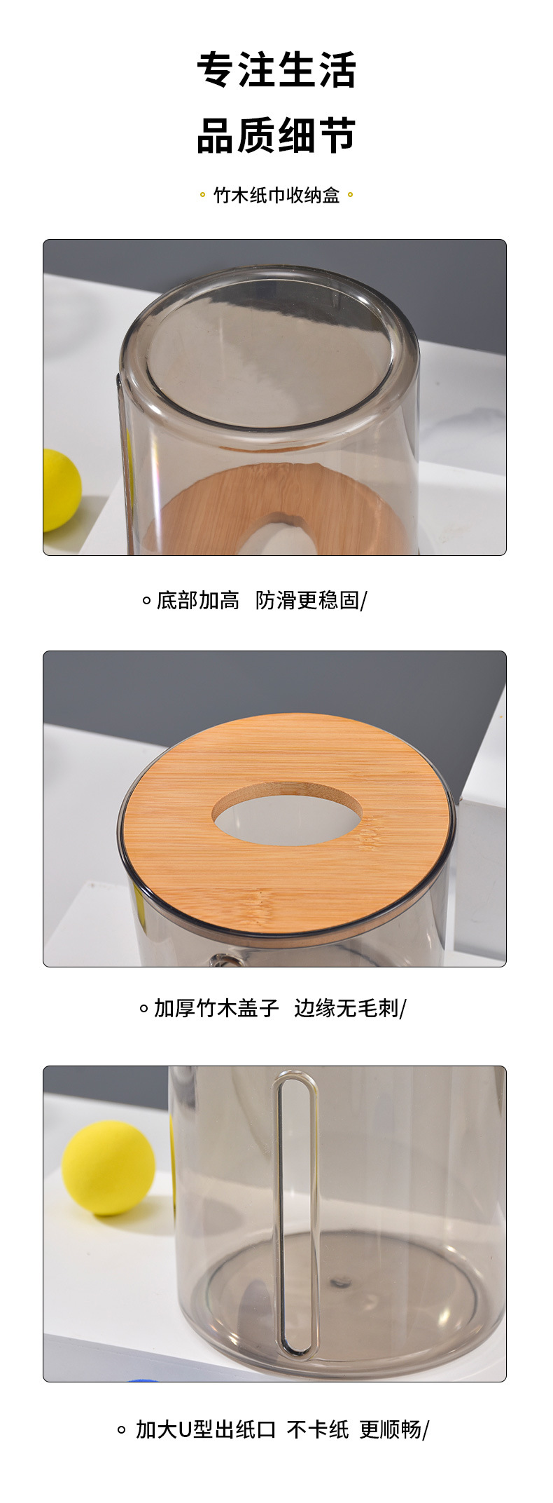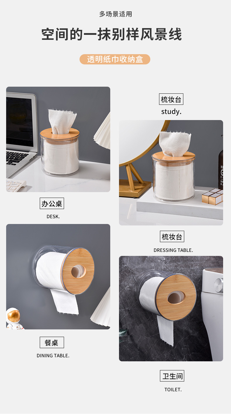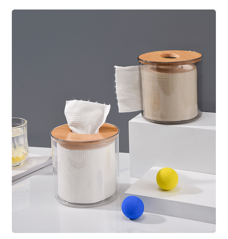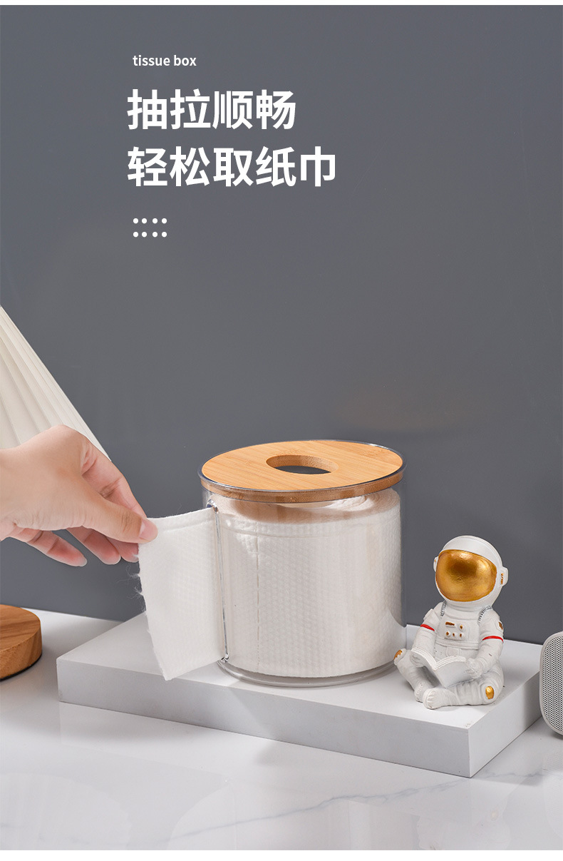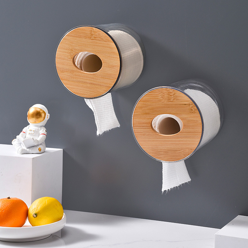 创意圆形塑料收纳纸巾盒家用抽纸盒竹木盖酒店壁挂式卫生间纸巾架