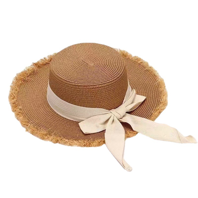 草帽女夏季蝴蝶结平顶拉菲草大檐帽子旅游沙滩帽遮阳防晒太阳帽