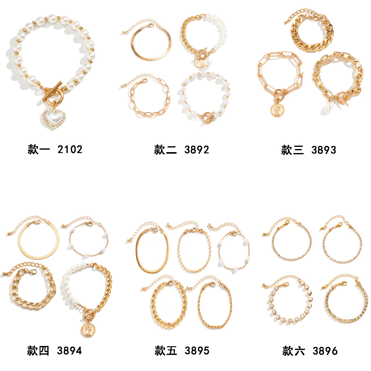 欧美跨境饰品 复古仿珍珠链条串珠手链 简约几何爱心水钻百搭手镯