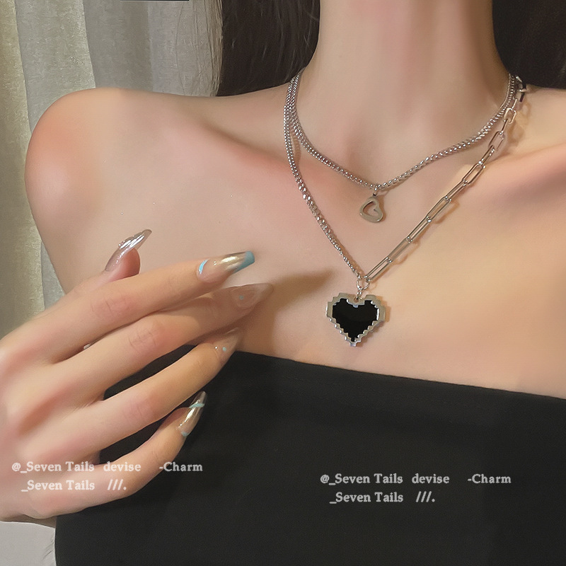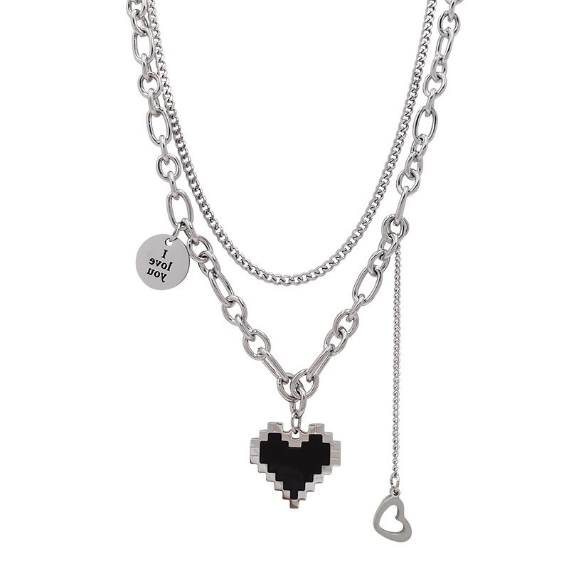 新款钛钢双层马赛克爱心形项链女嘻哈小众设计简约字母吊坠锁骨链