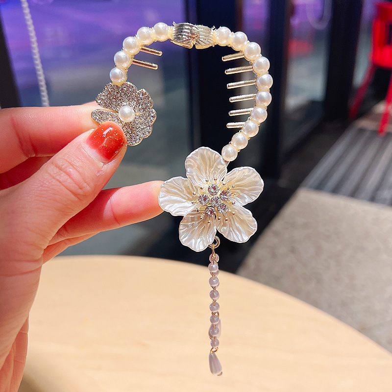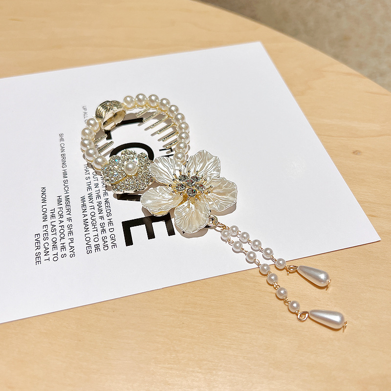 山茶花朵珍珠流苏马尾夹发扣盘发抓夹少女丸子盘发器