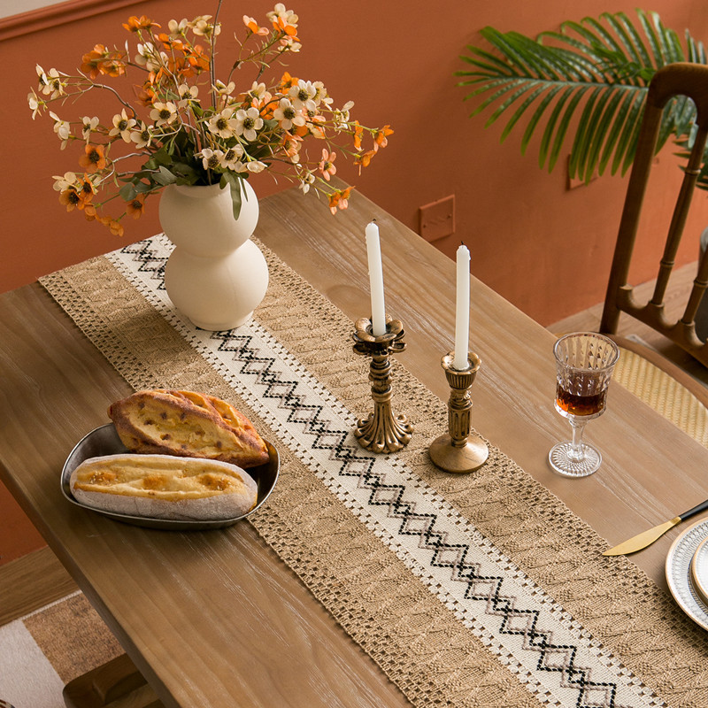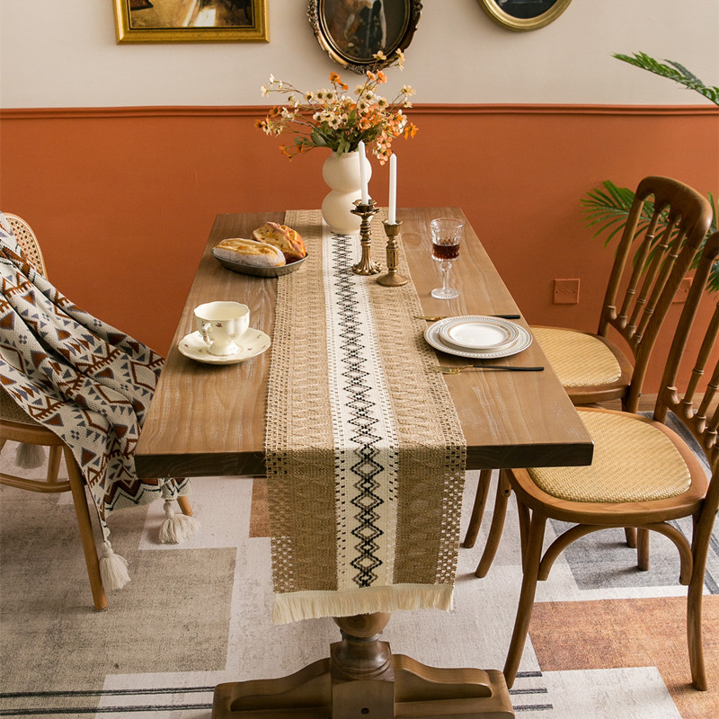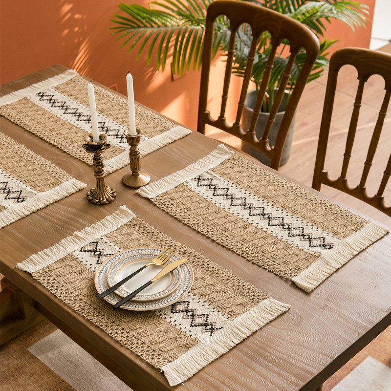 ins北欧桌旗棉麻条纹拼接双色编织流苏天然材质美式节日 蕾丝桌垫