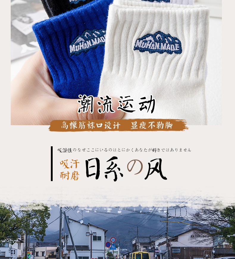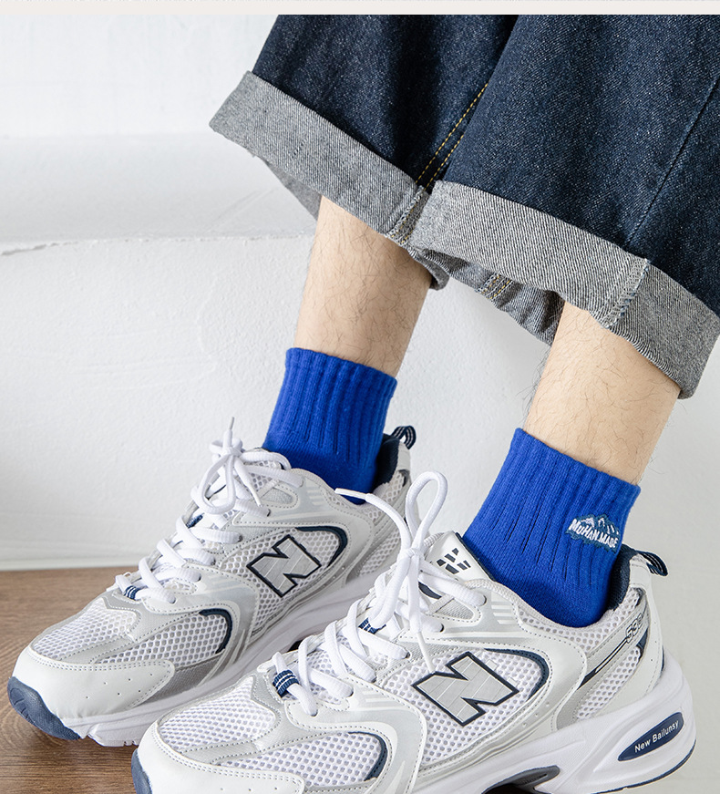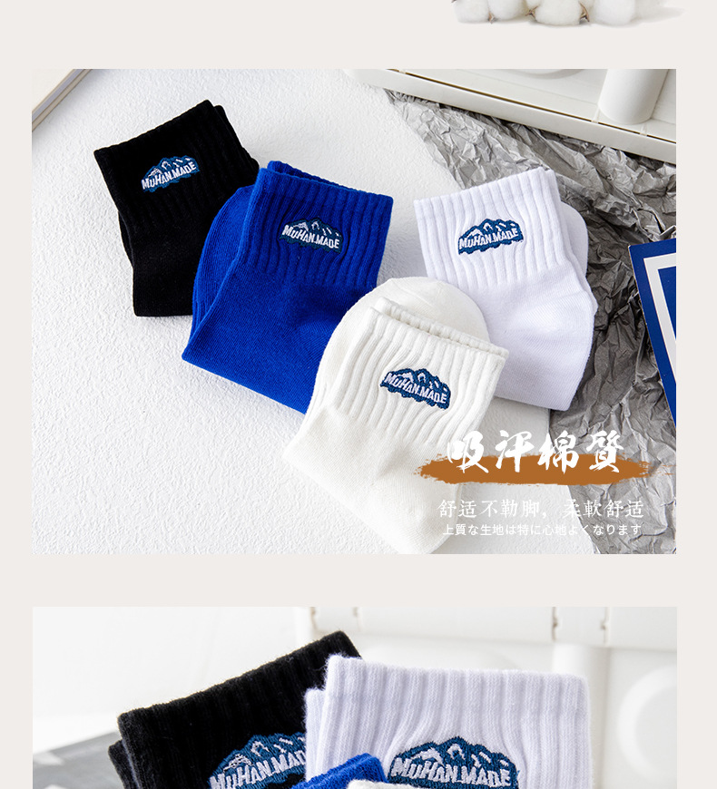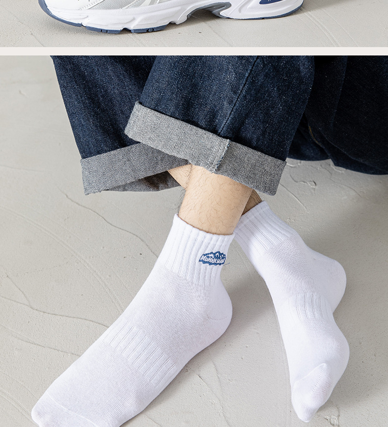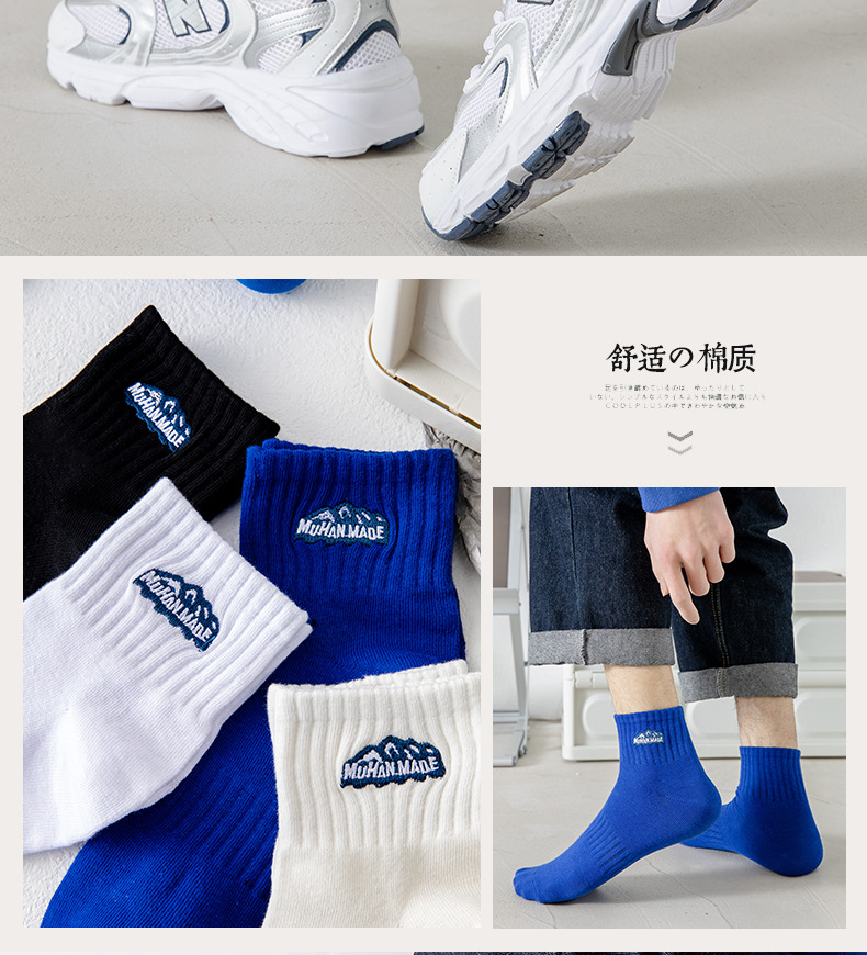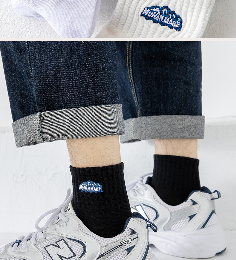 袜子男秋冬季纯棉雪山刺绣黑白色运动短袜男士跑步中筒袜女袜批发