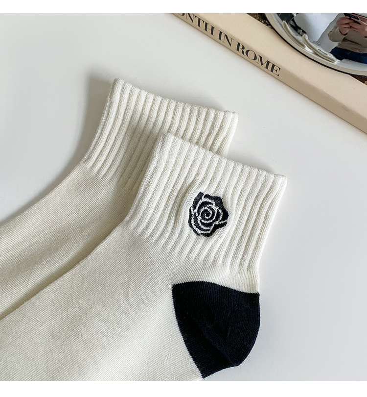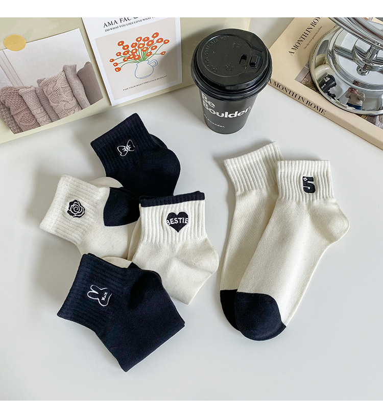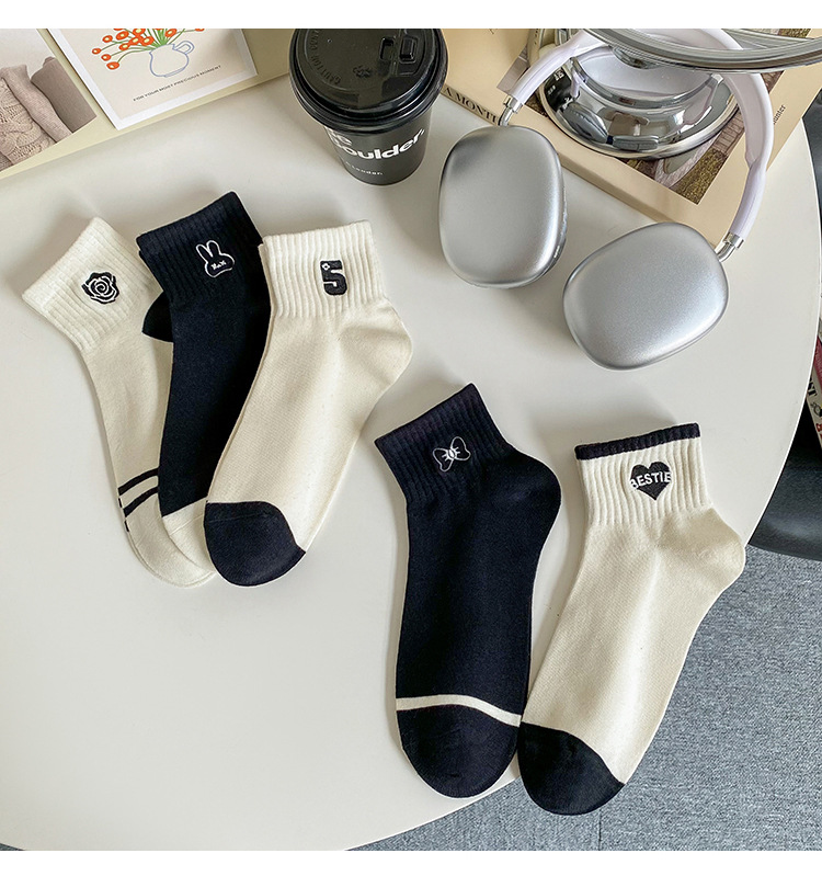 袜子女可爱日系短筒袜ins春夏季学生百搭黑白刺绣爱心蝴蝶结船袜
