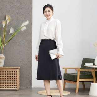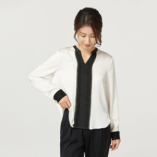 真丝衬衫女2023春缎面职业装撞色桑蚕丝长袖衬衣通勤修身方领上衣