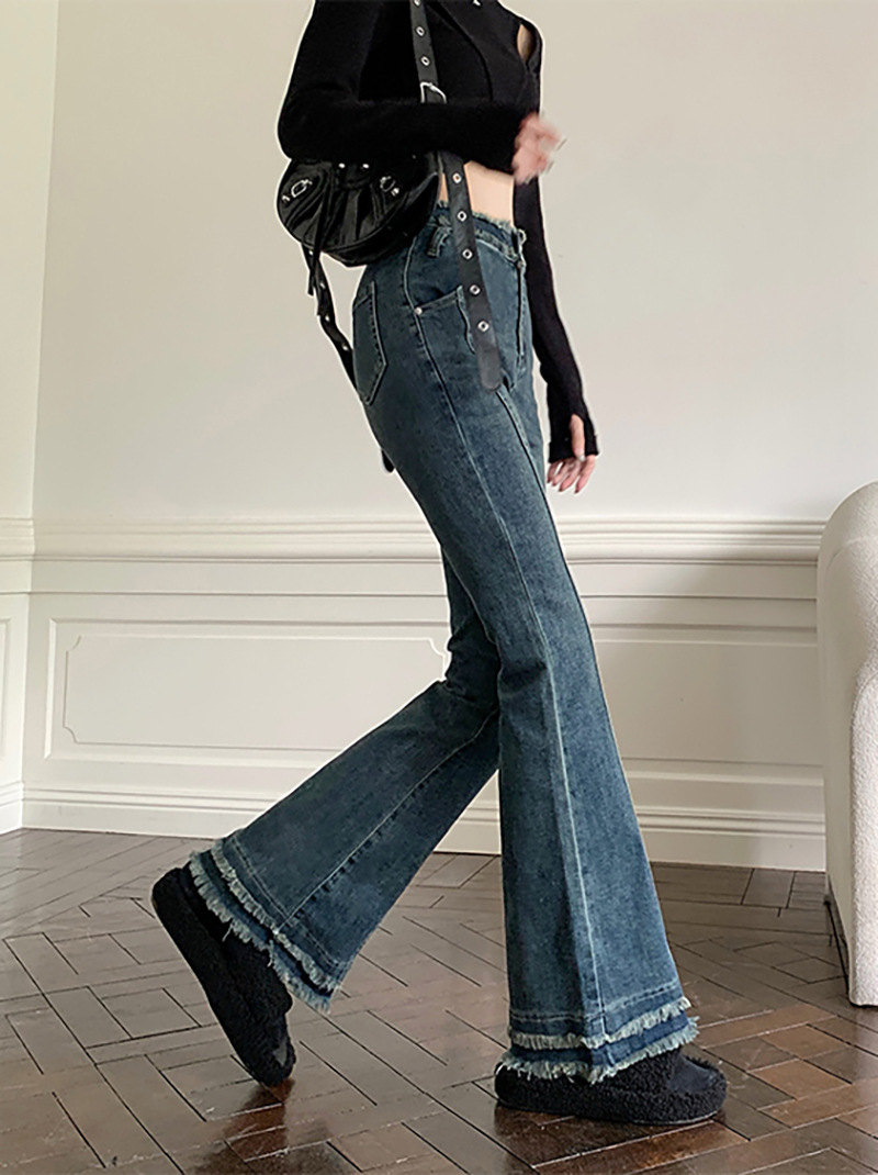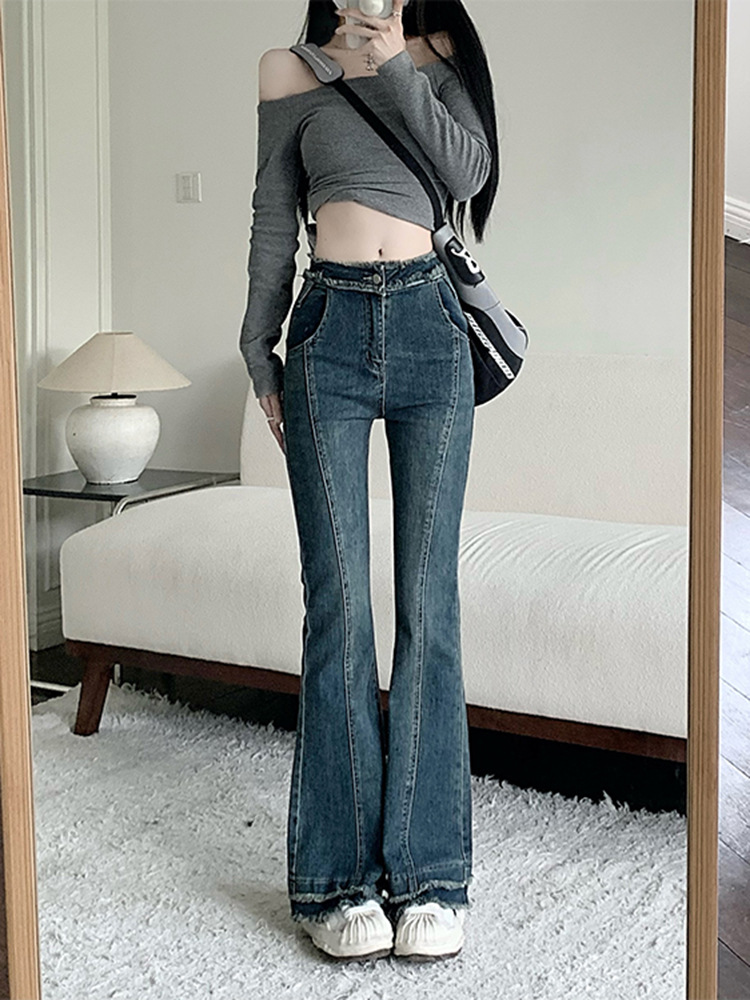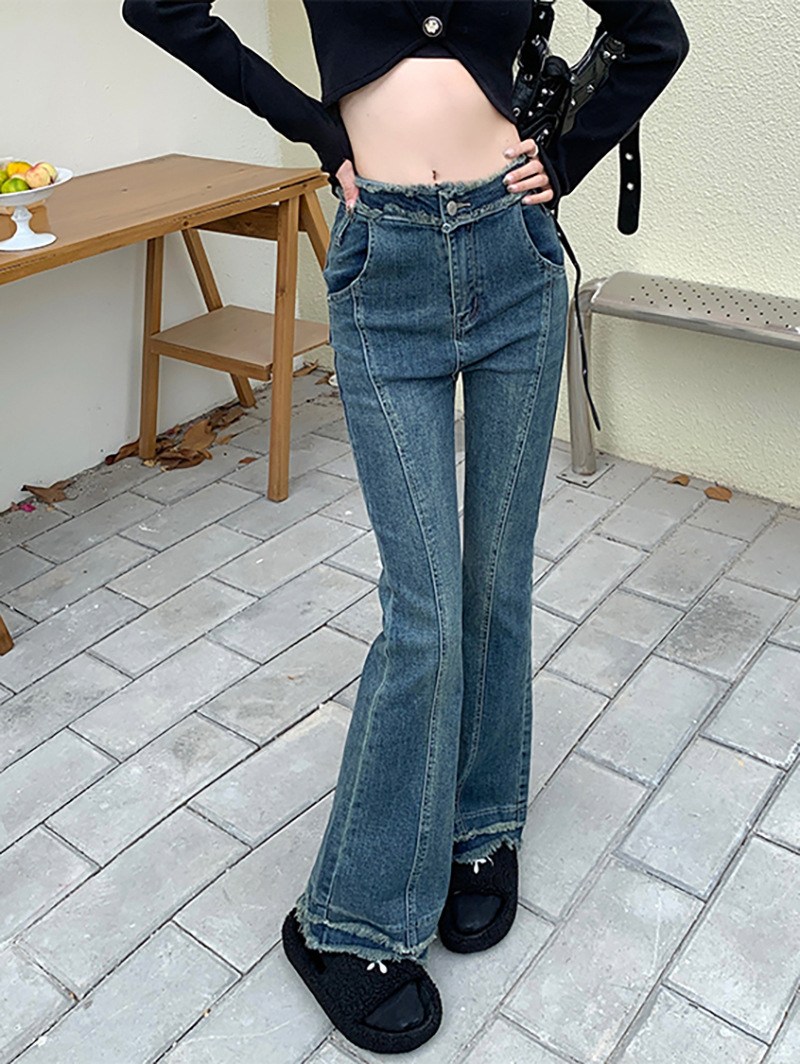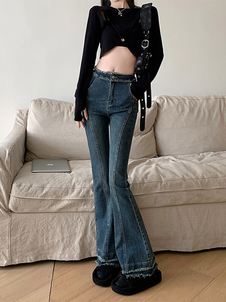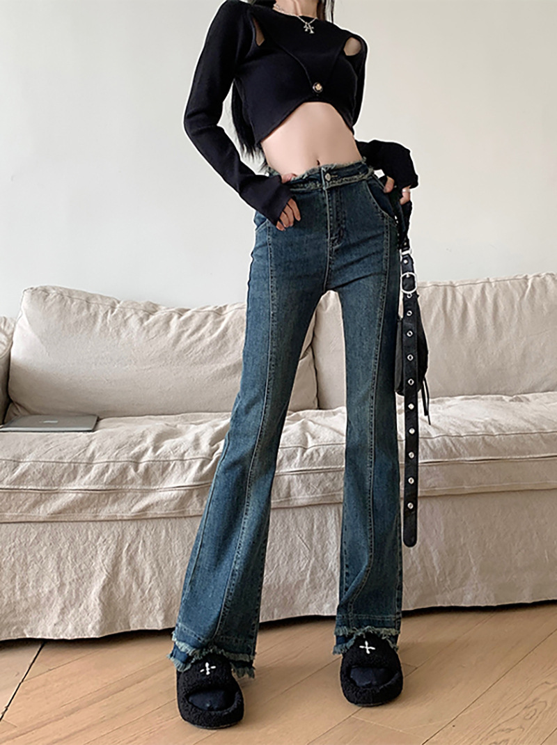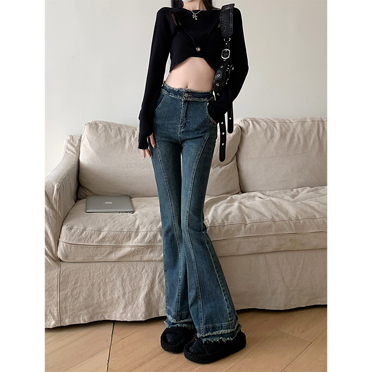 辣妹港风高腰毛边新款复古牛仔裤女秋季拖地长裤子修身显瘦微喇裤
