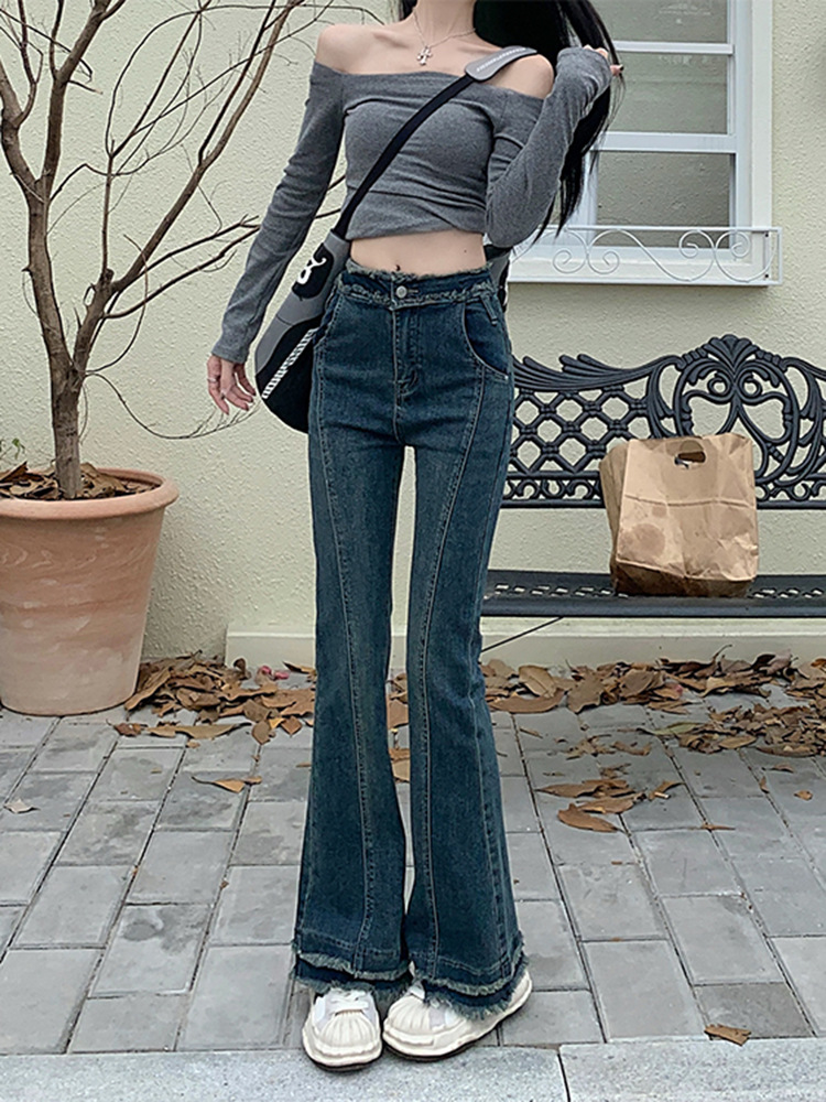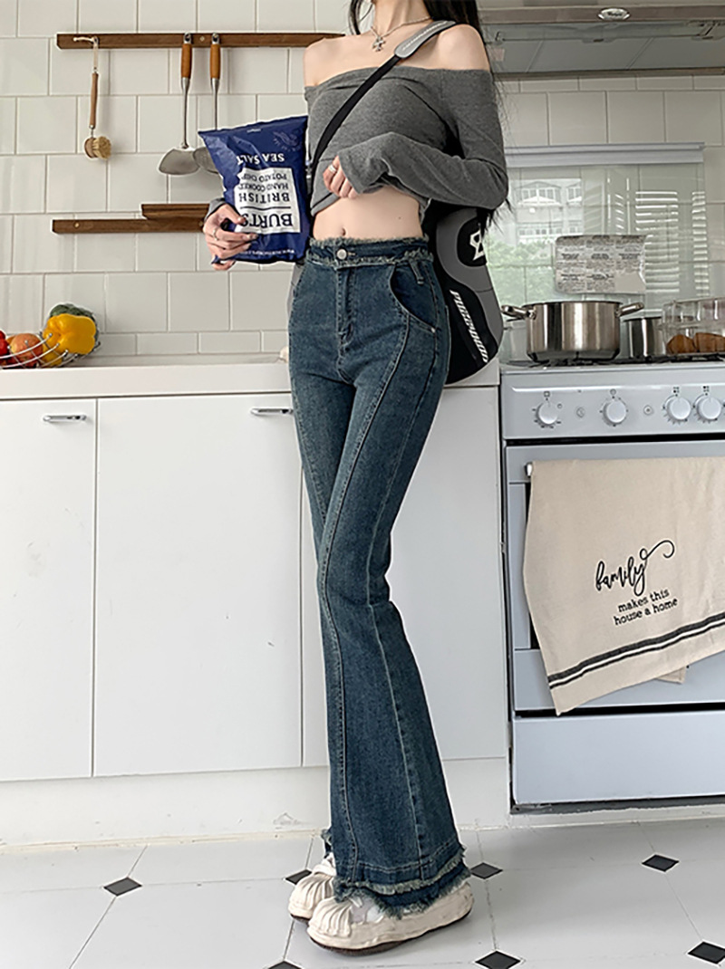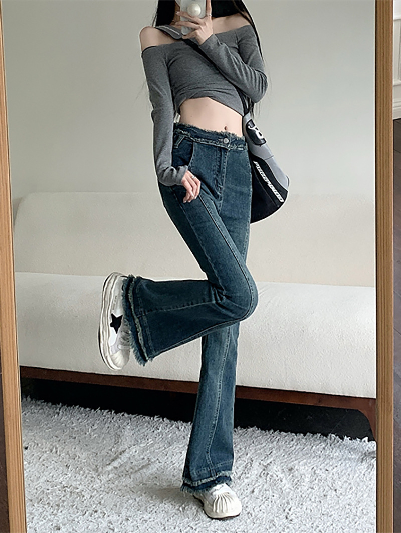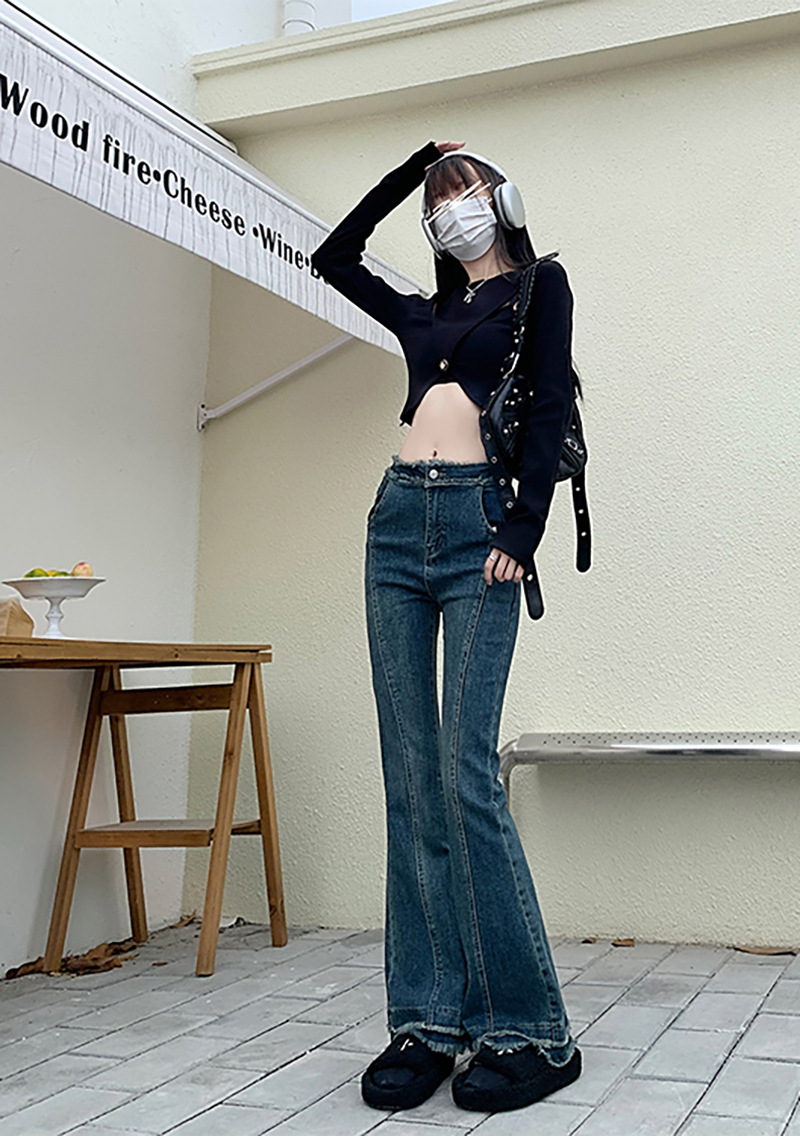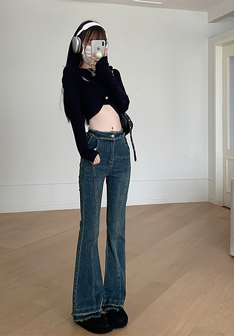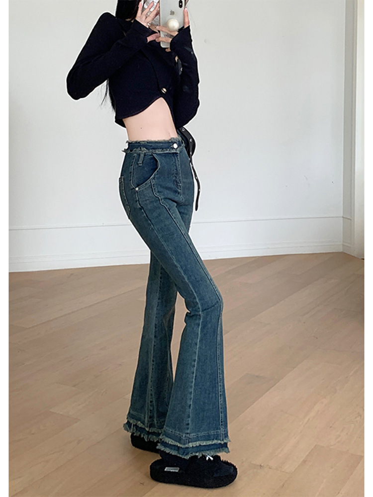 辣妹港风高腰毛边新款复古牛仔裤女秋季拖地长裤子修身显瘦微喇裤