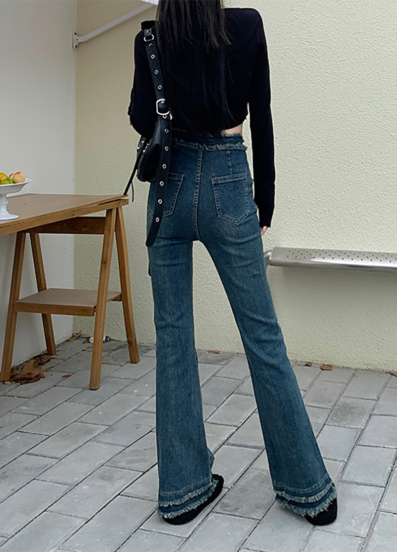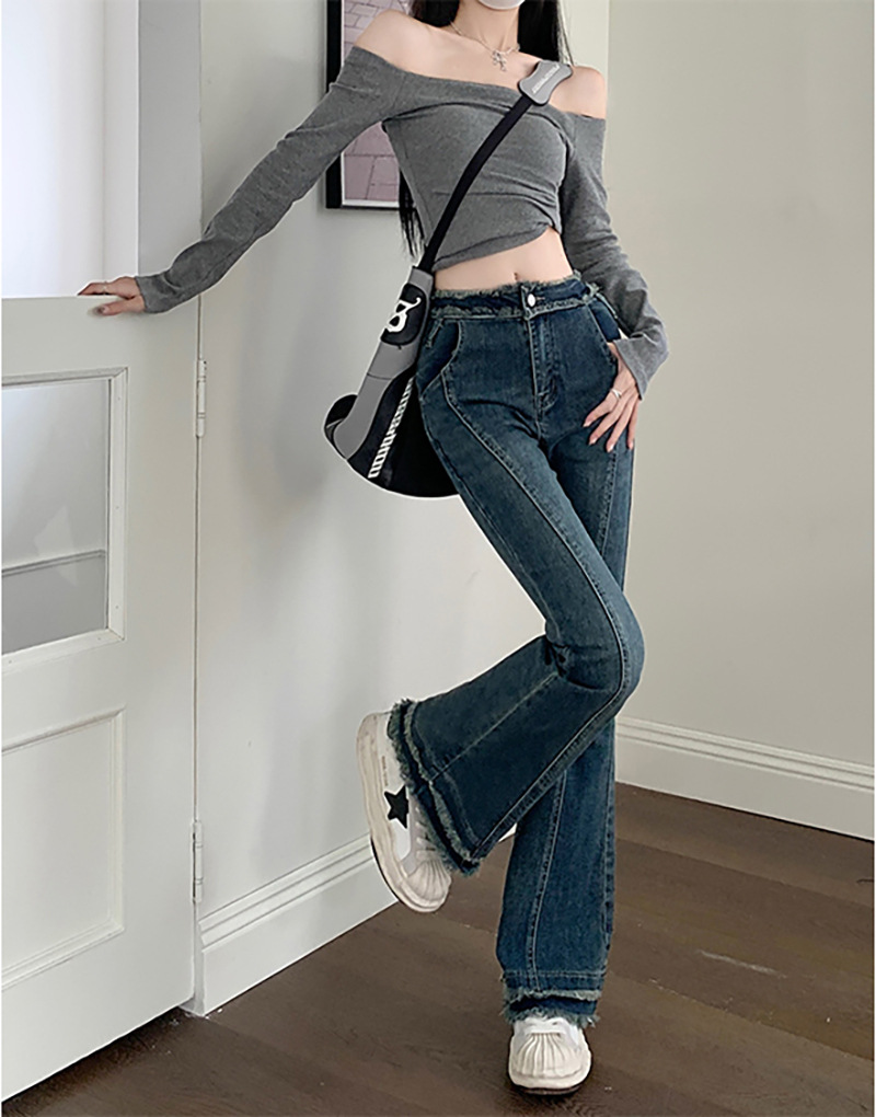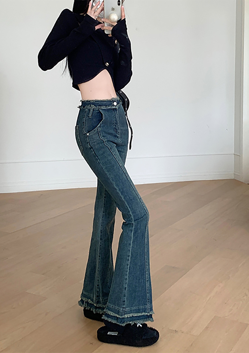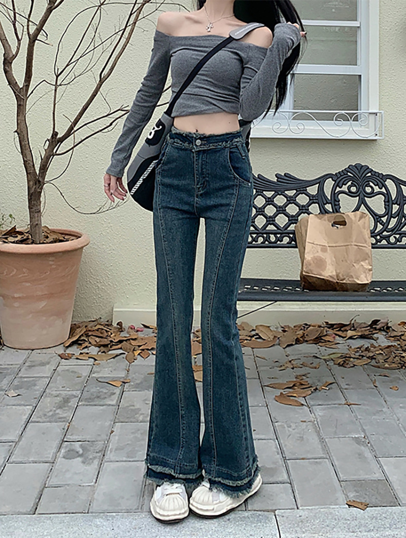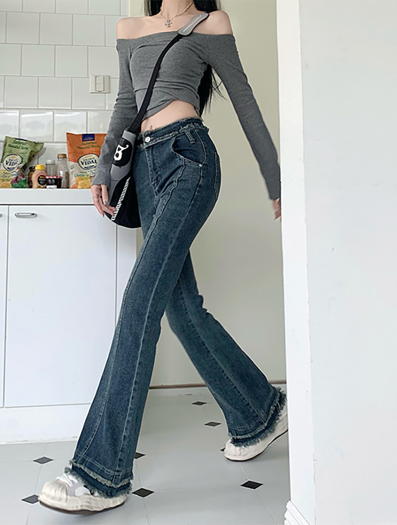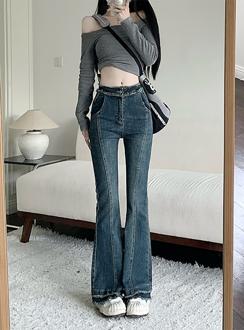 辣妹港风高腰毛边新款复古牛仔裤女秋季拖地长裤子修身显瘦微喇裤