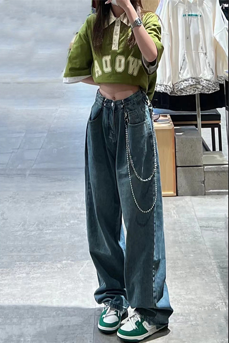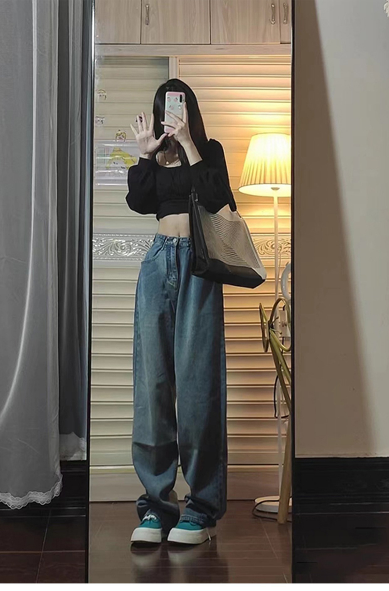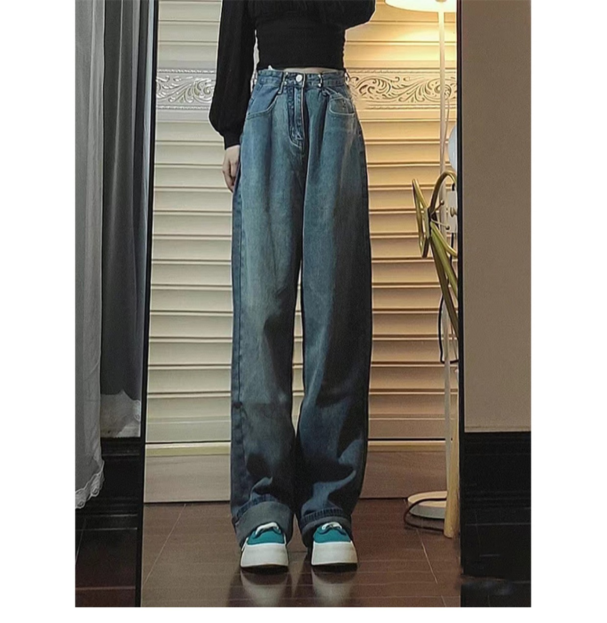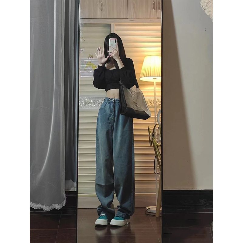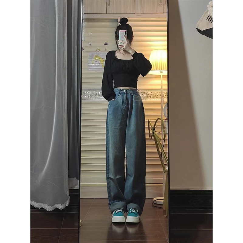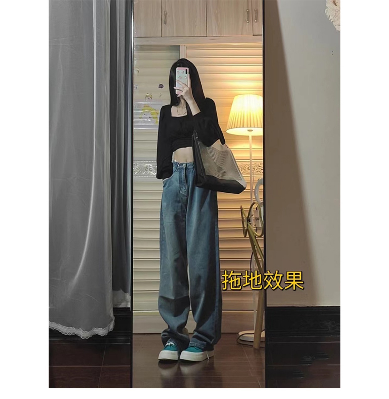 复古辣妹高腰牛仔裤女春秋美式高街设计感宽松垂感直筒阔腿拖地裤