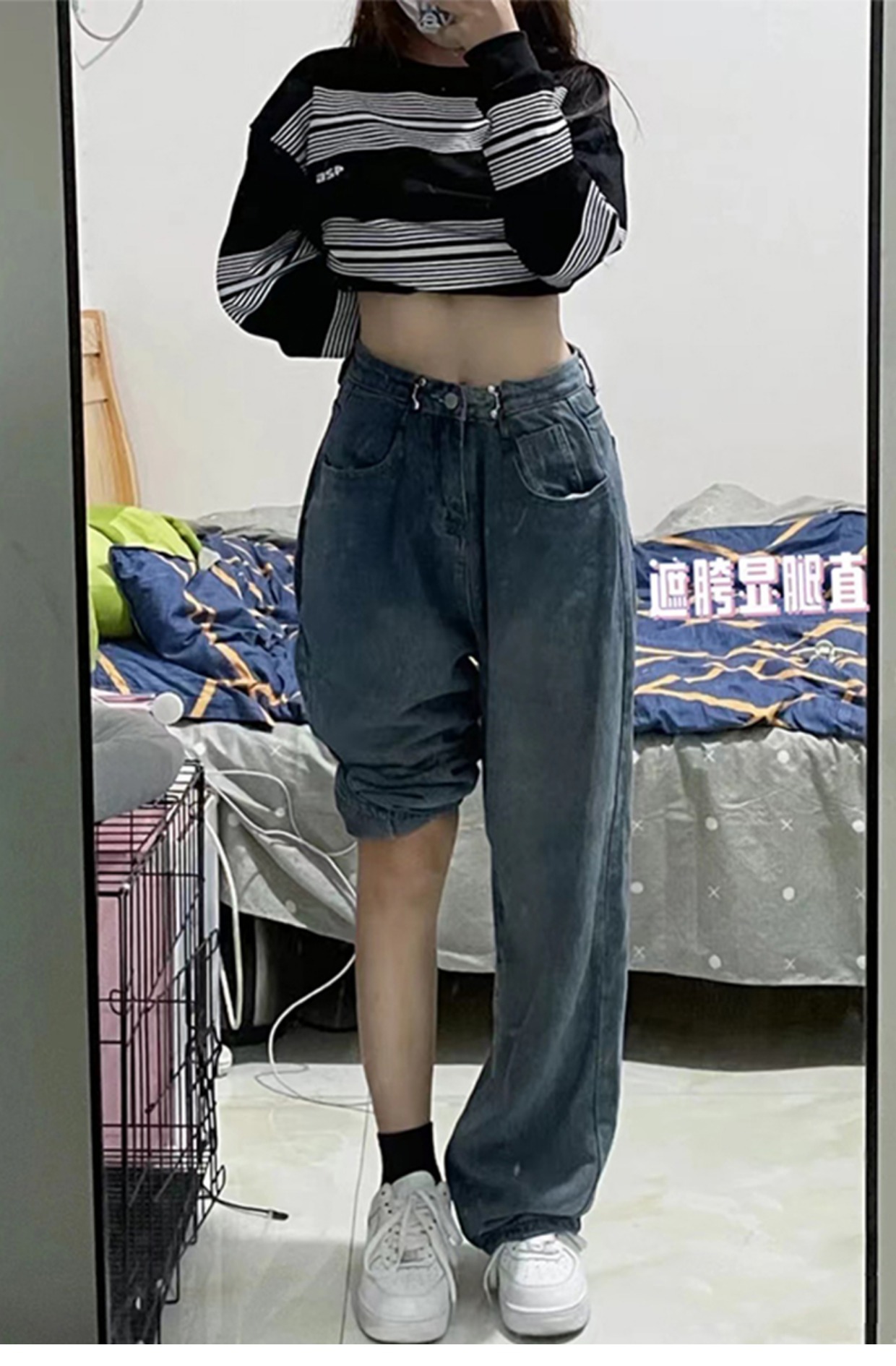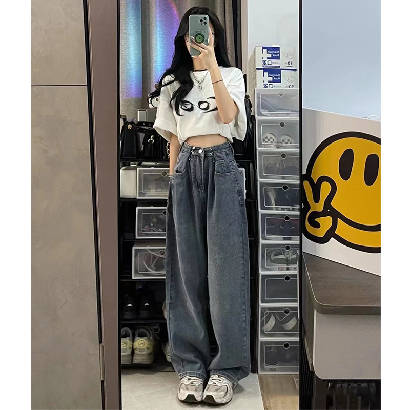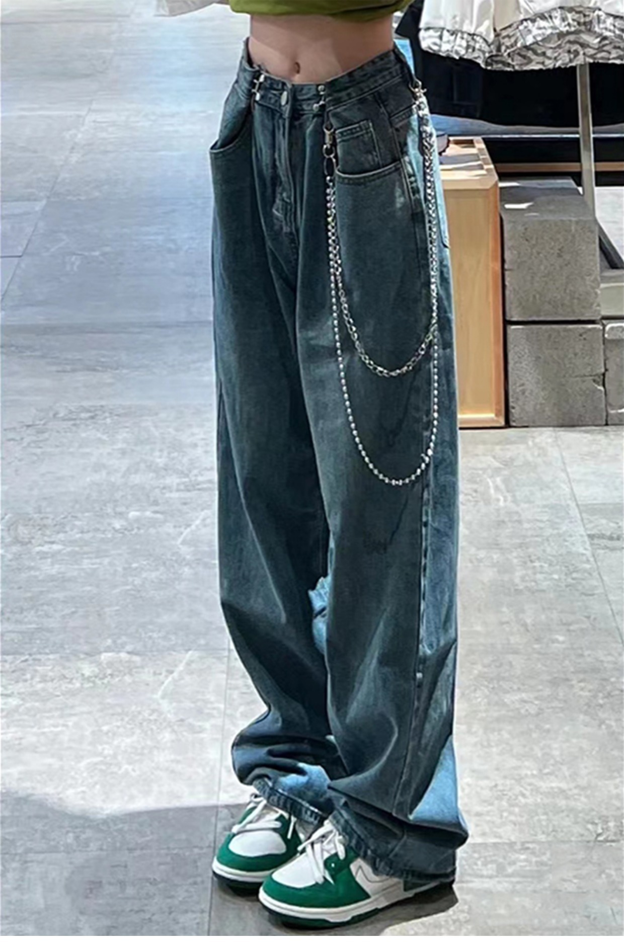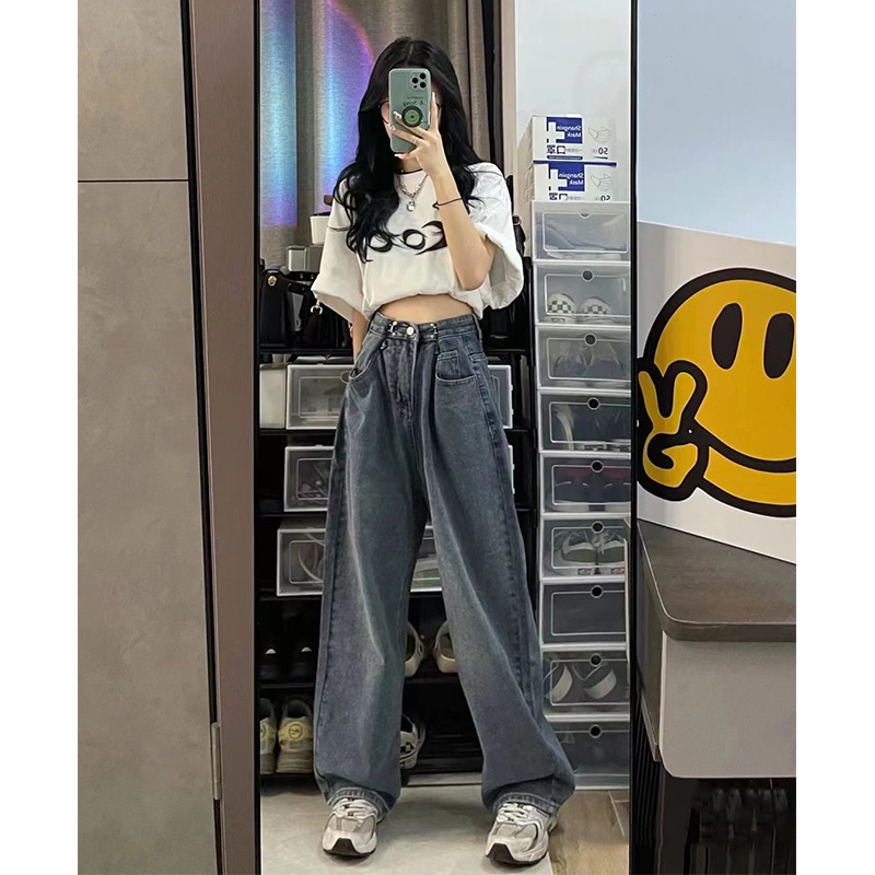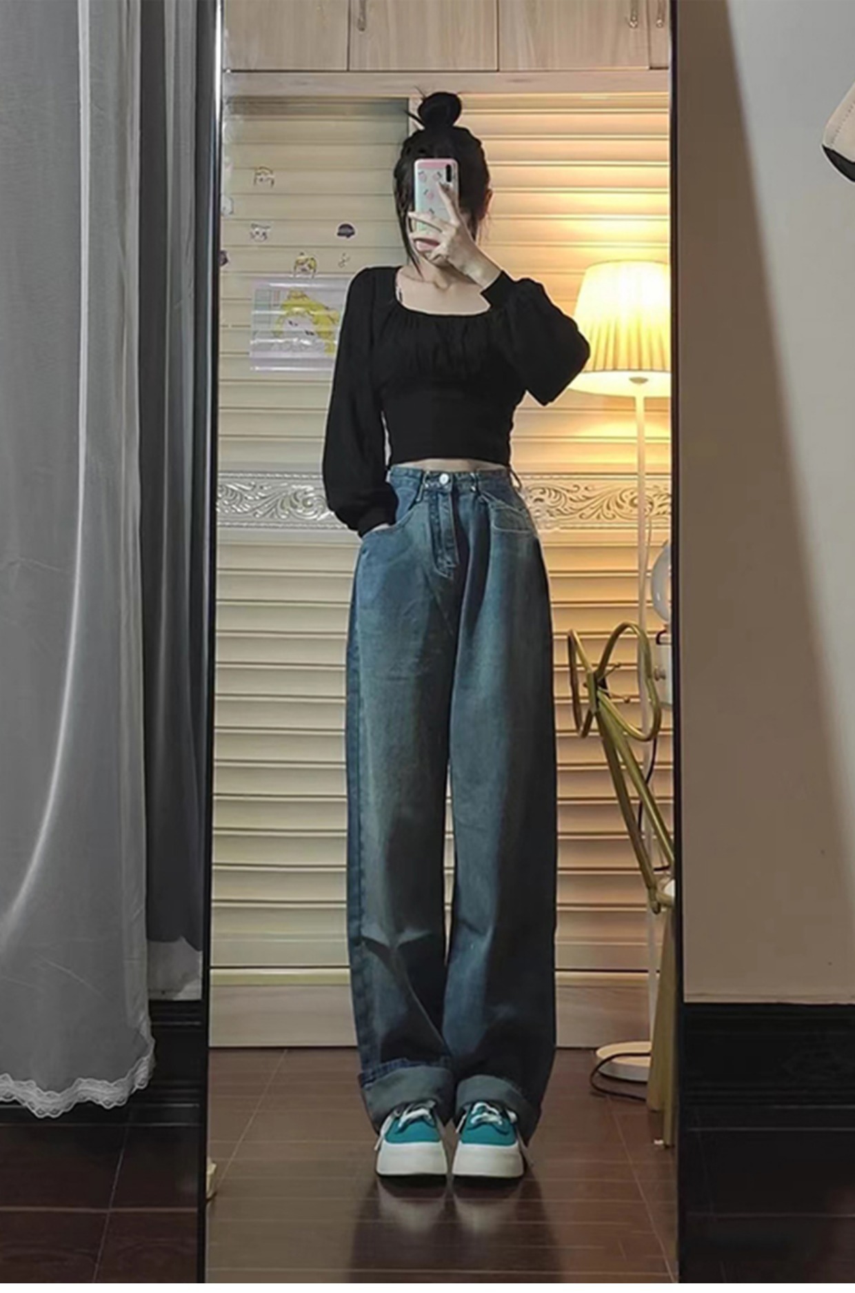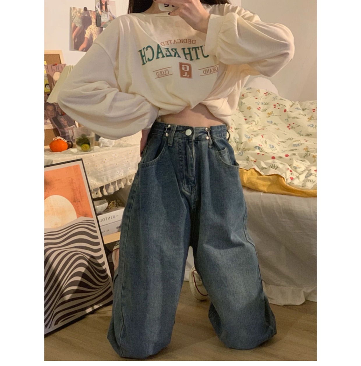 复古辣妹高腰牛仔裤女春秋美式高街设计感宽松垂感直筒阔腿拖地裤