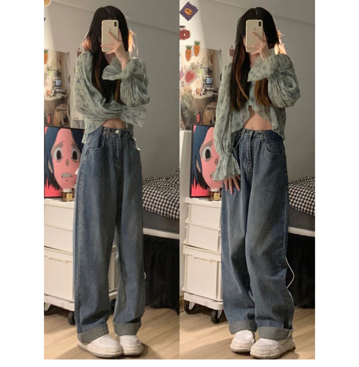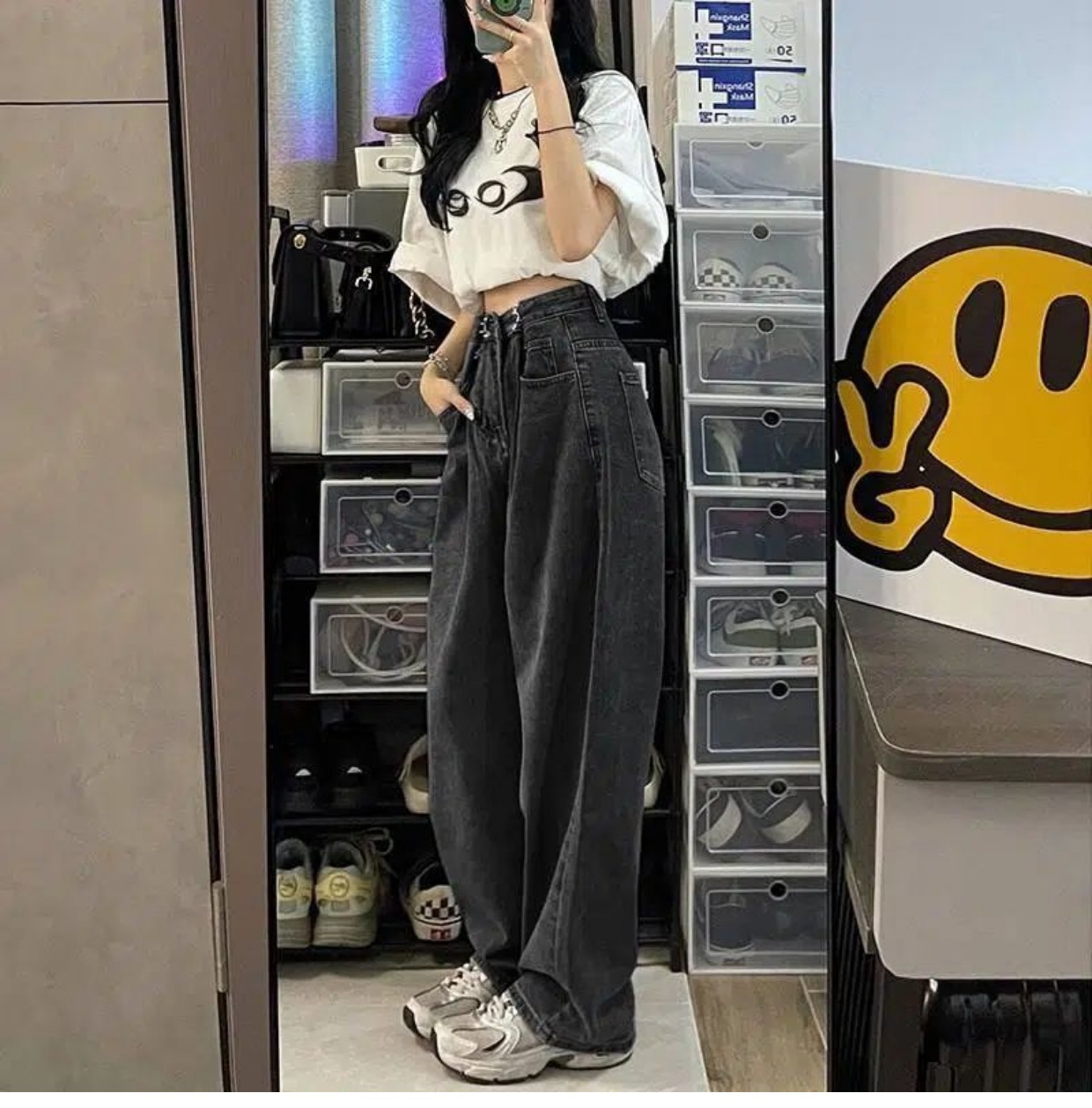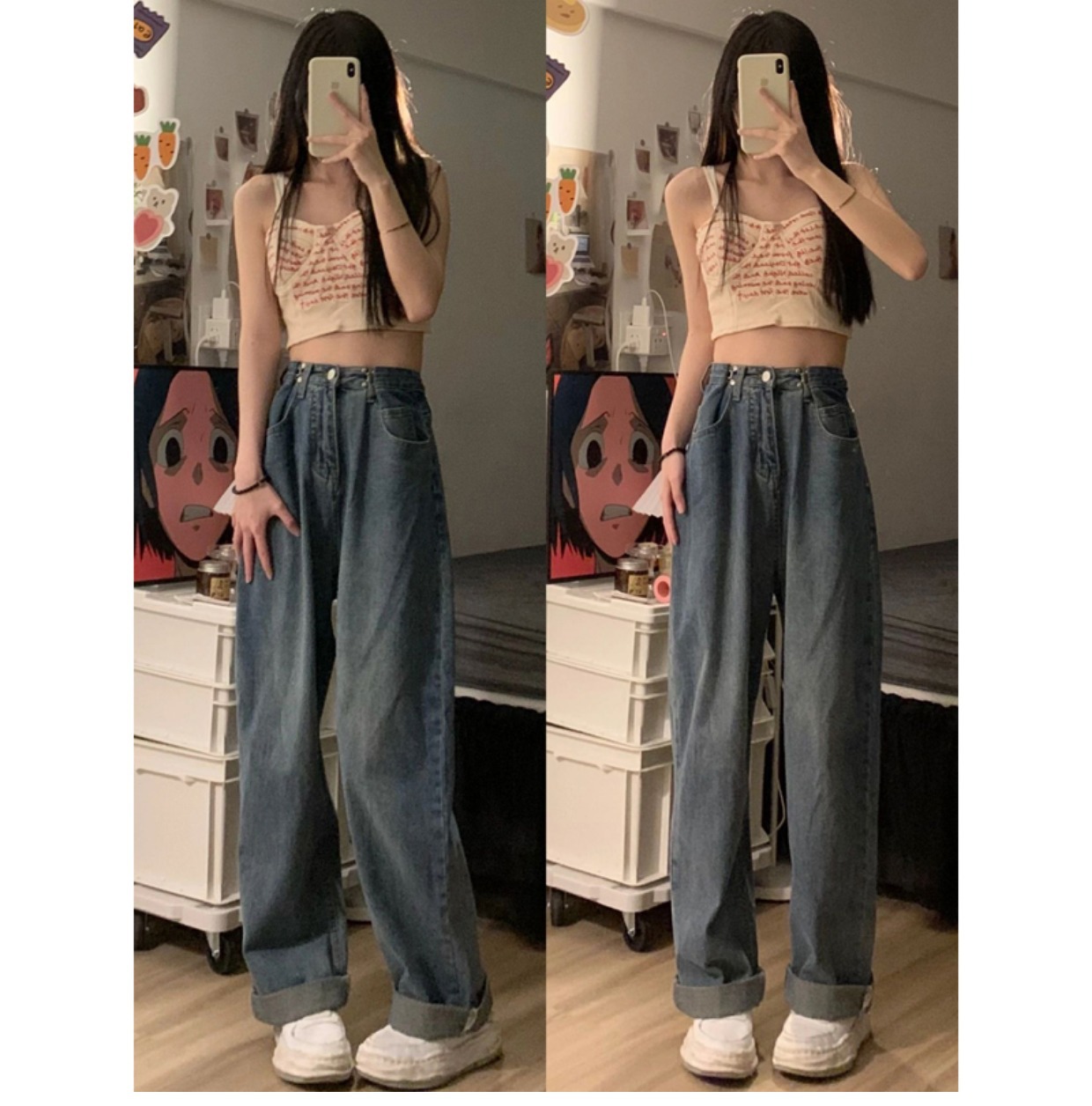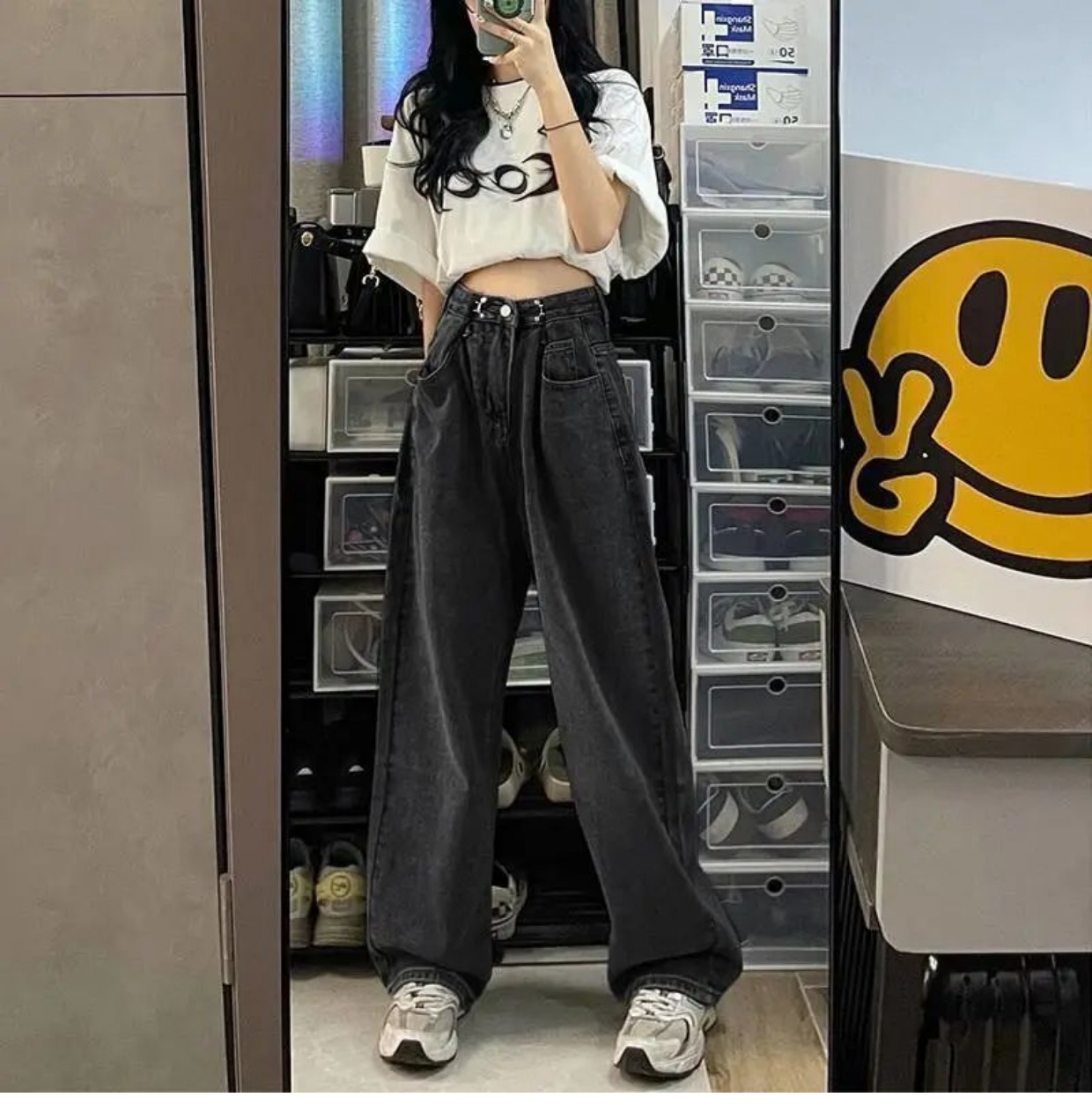 复古辣妹高腰牛仔裤女春秋美式高街设计感宽松垂感直筒阔腿拖地裤