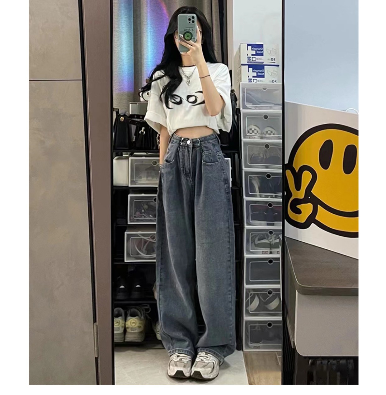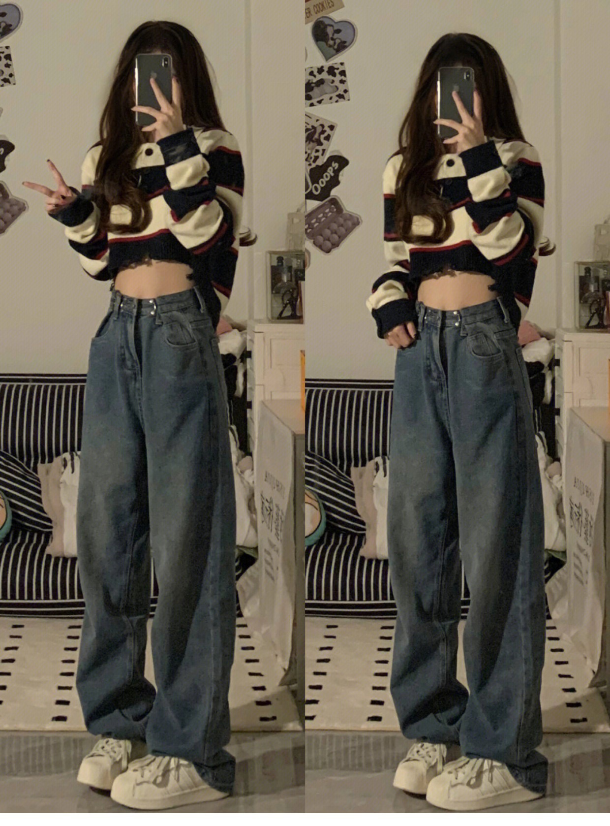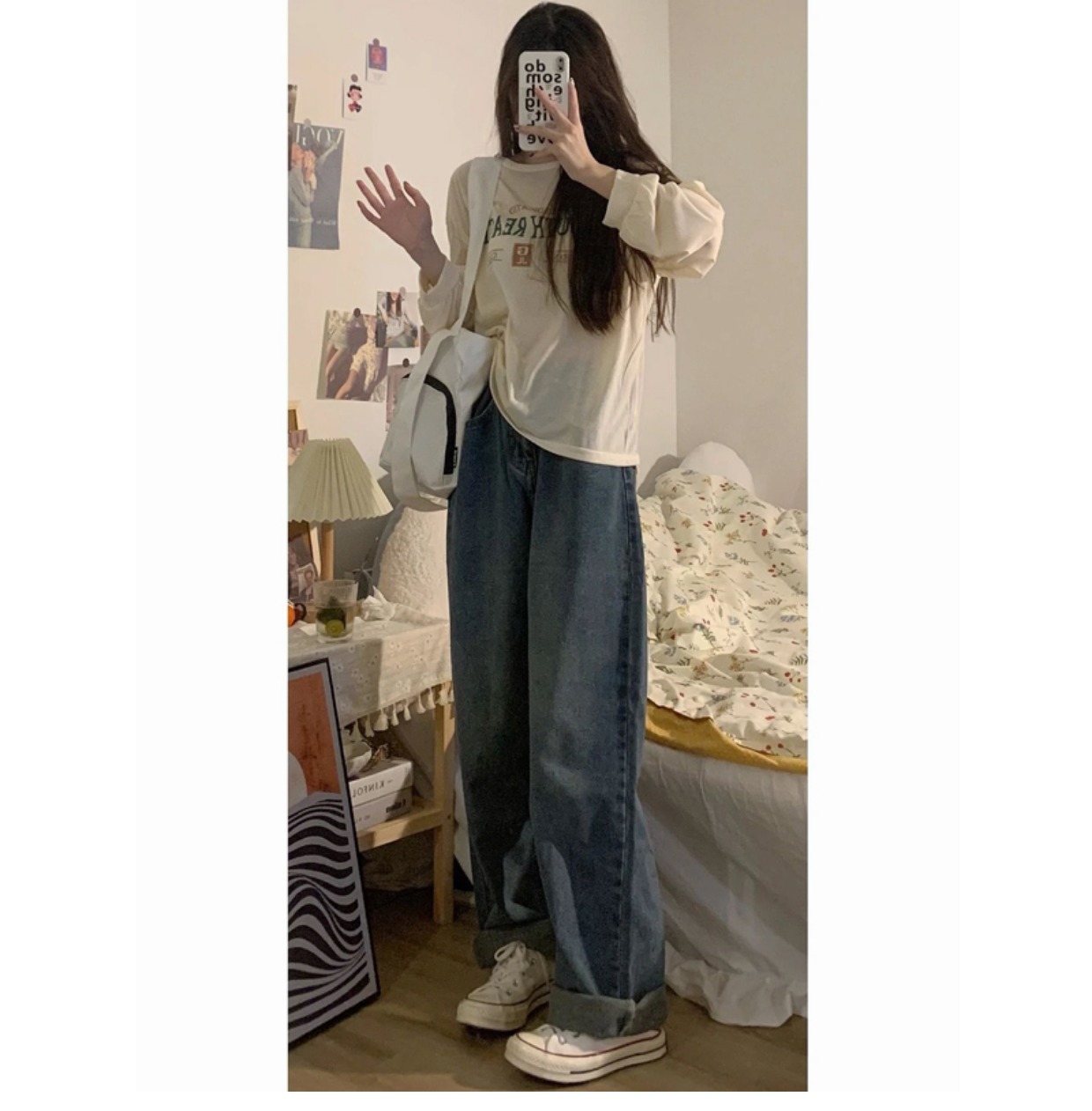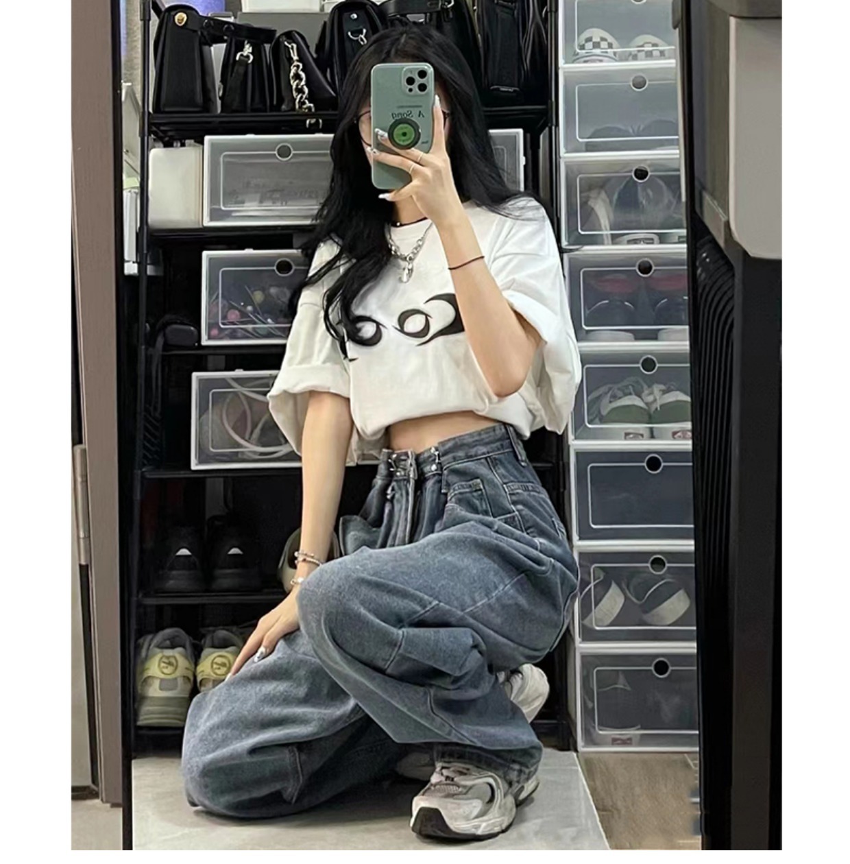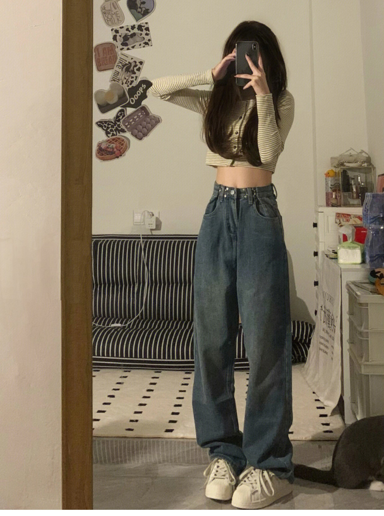 复古辣妹高腰牛仔裤女春秋美式高街设计感宽松垂感直筒阔腿拖地裤
