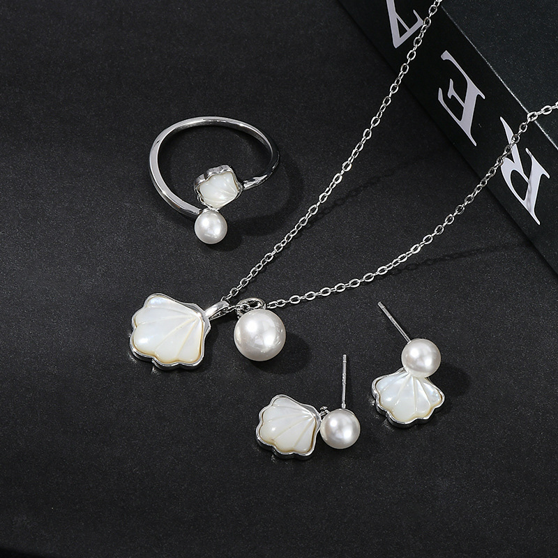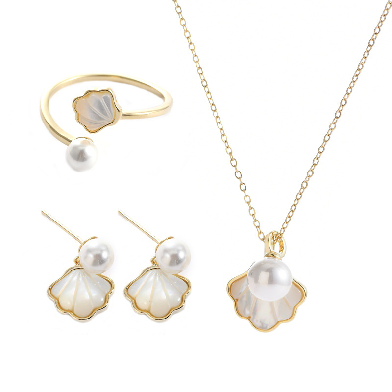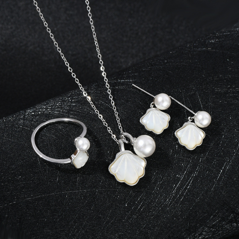 新款气质贝壳锁骨链戒指耳钉套装小众设计高级感轻奢饰品一件代发