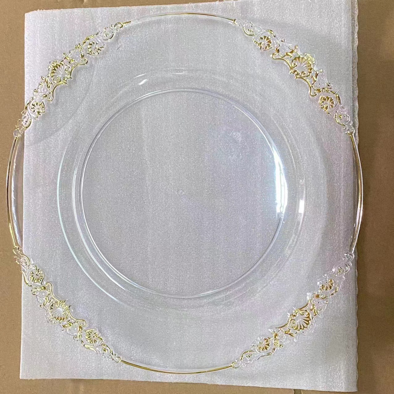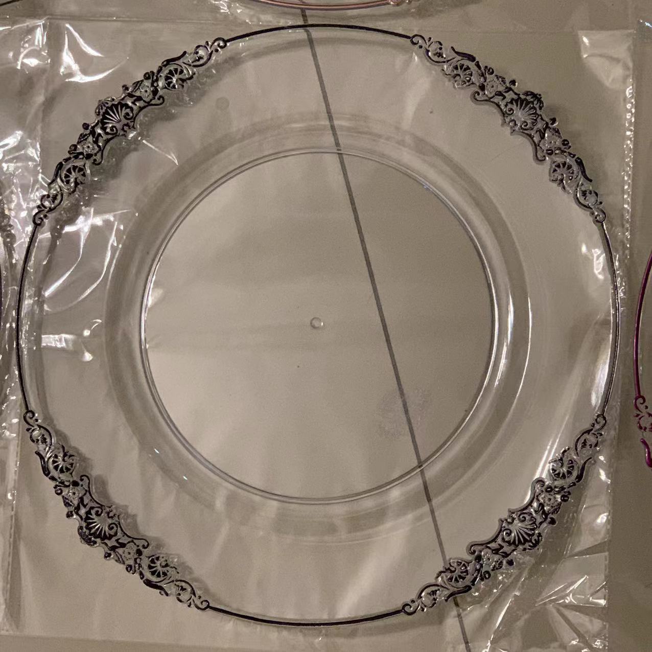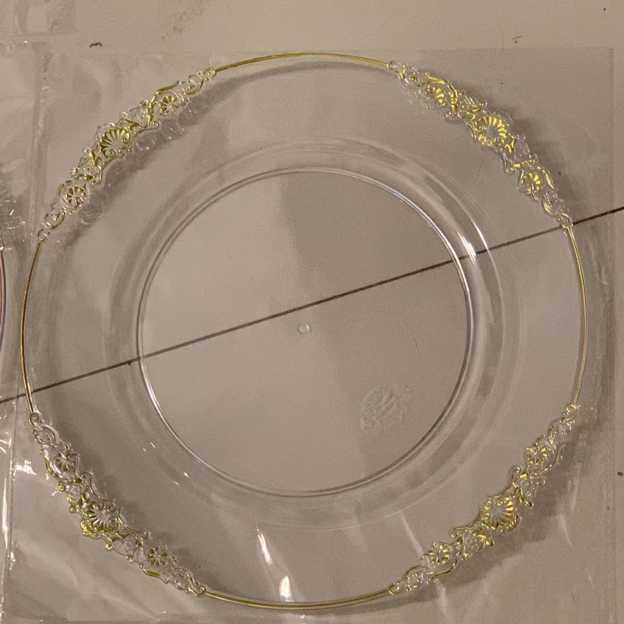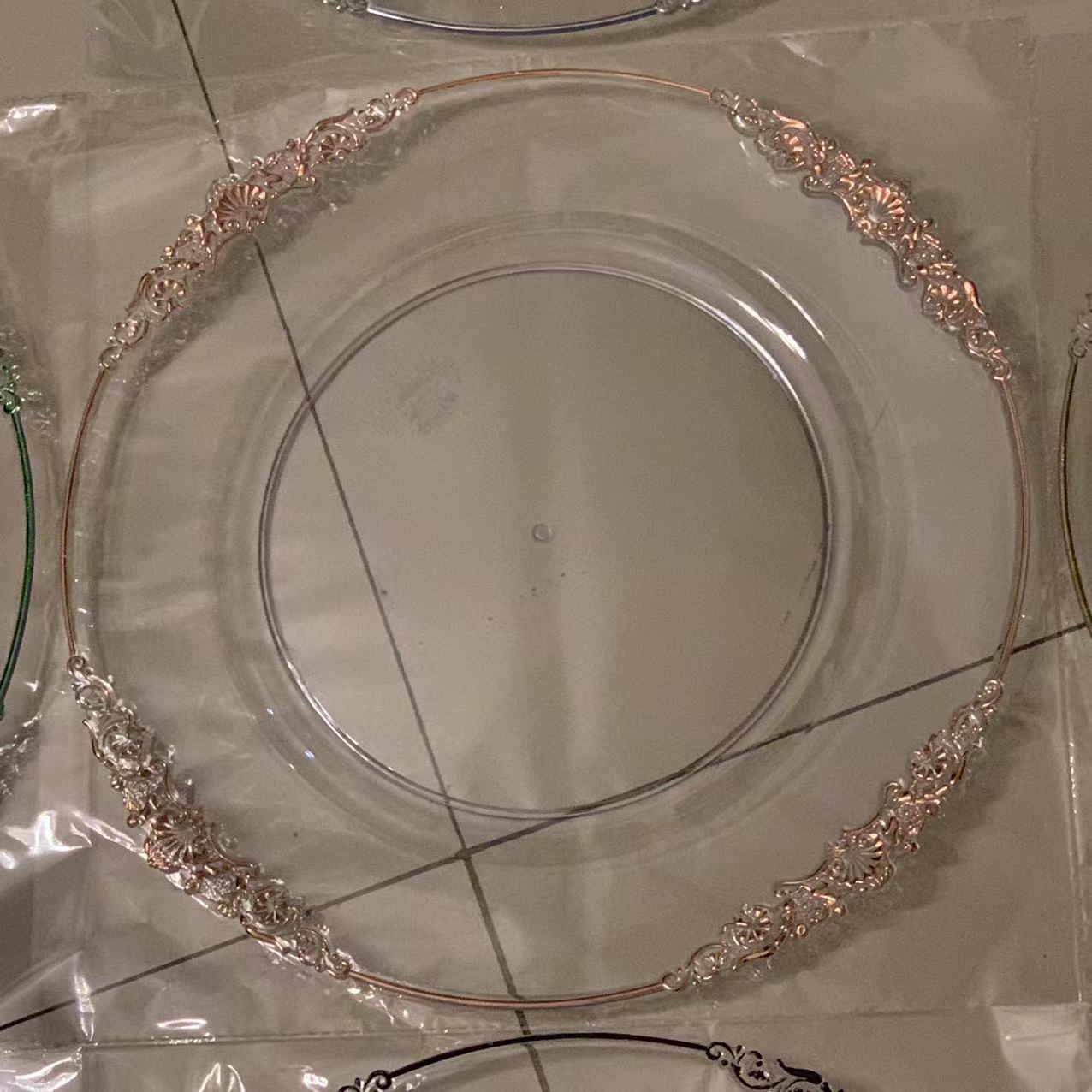 外贸透明婚礼酒店派对刷金工艺装饰塑料玻璃主盘chagerplate