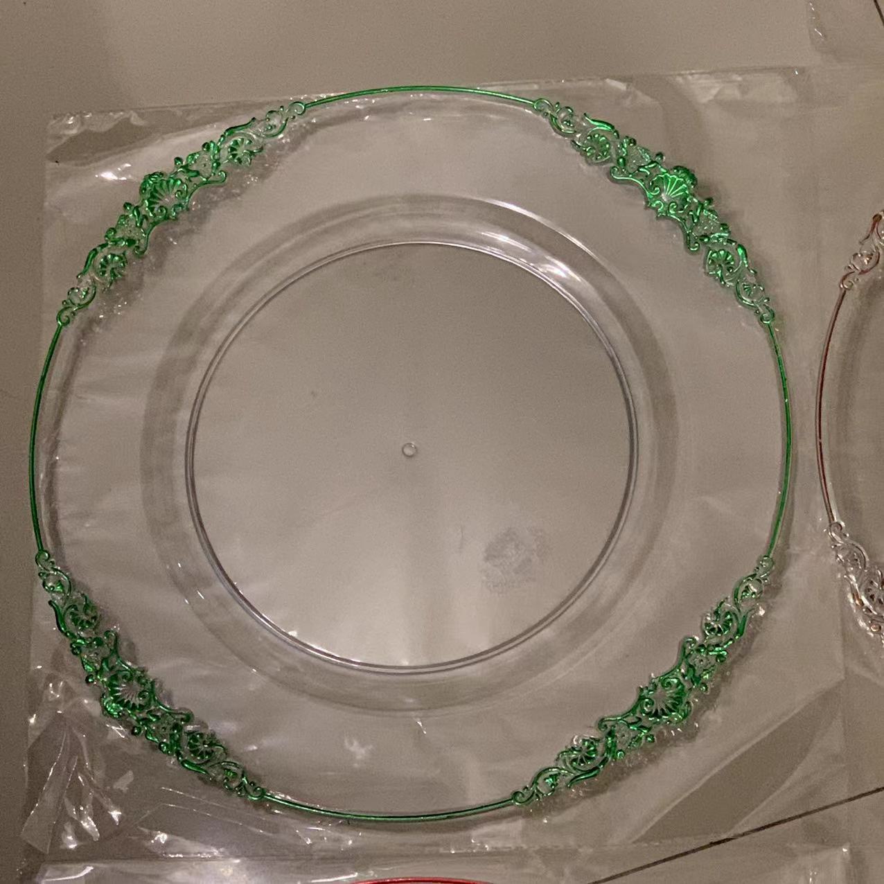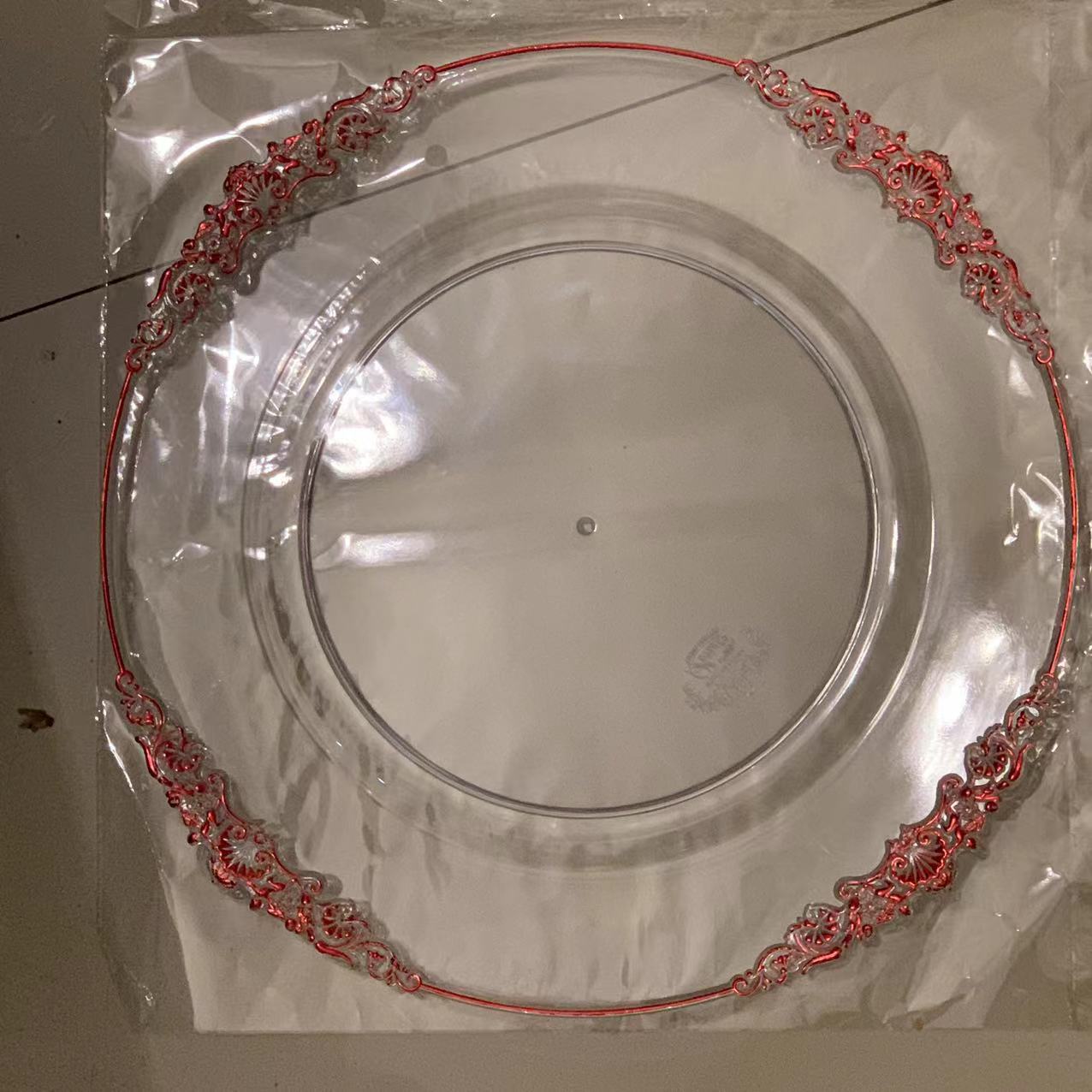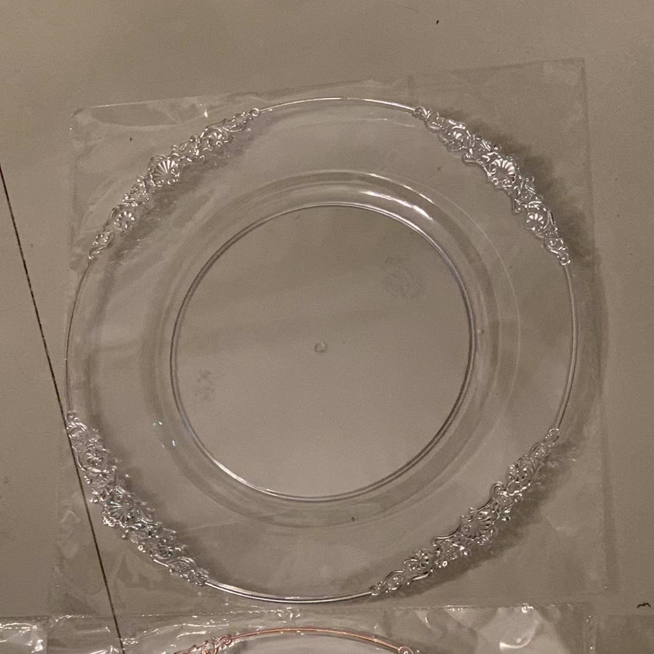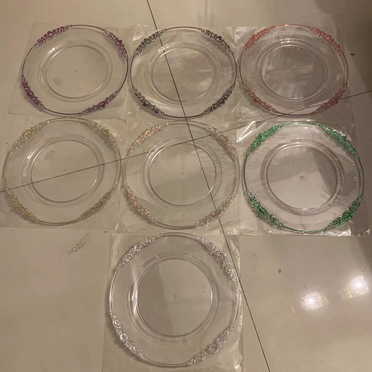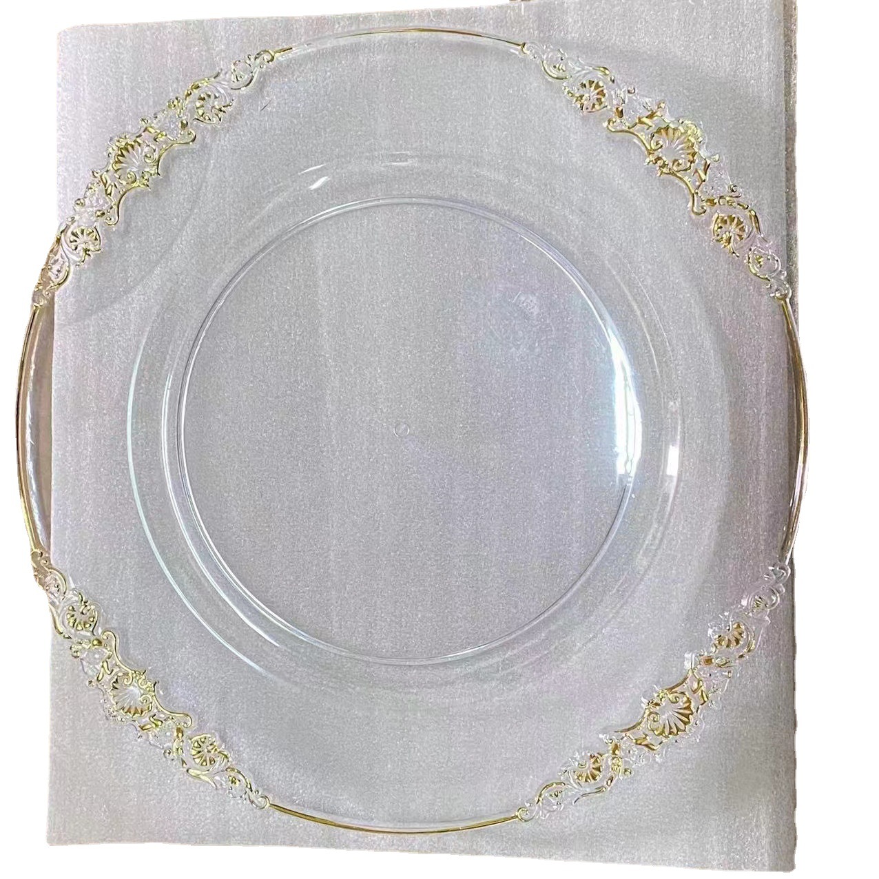 外贸透明婚礼酒店派对刷金工艺装饰塑料玻璃主盘chagerplate