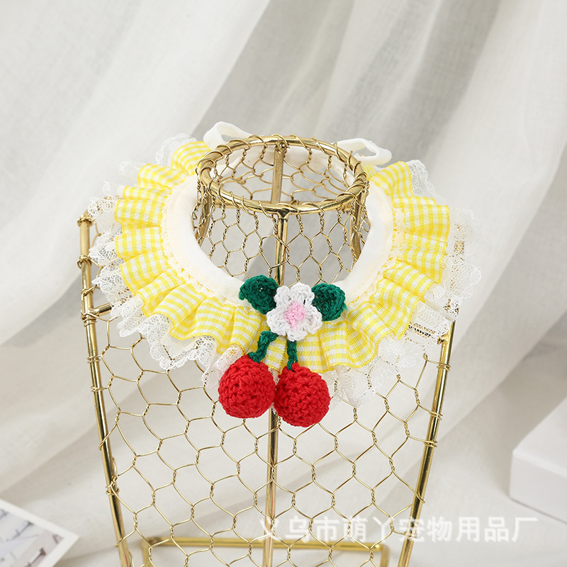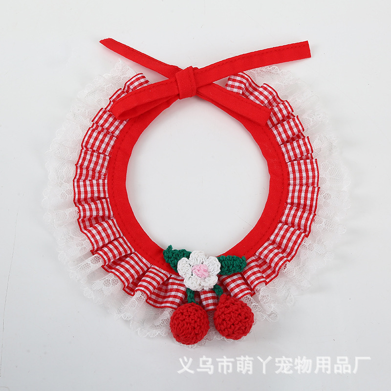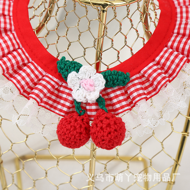 新款宠物项圈手工樱桃吊坠项圈可爱格子蕾丝花边宠物围嘴厂家批发