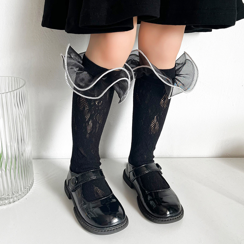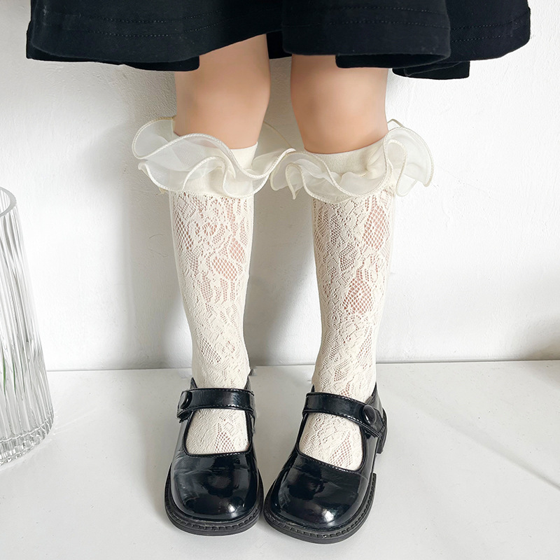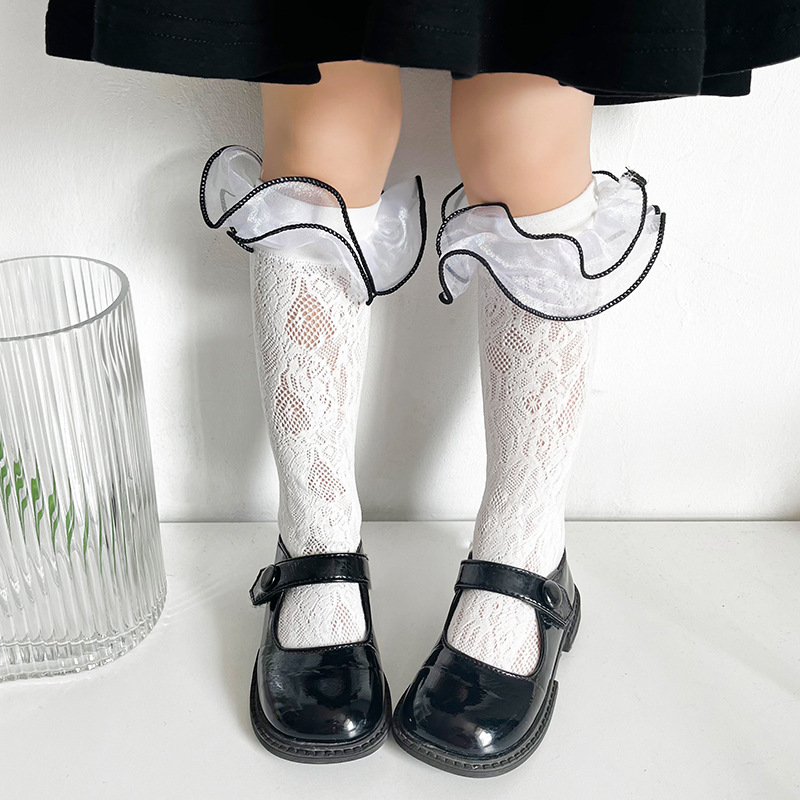 洛丽塔儿童中筒袜子春夏薄款小腿袜蕾丝花边网眼堆堆袜女童长筒袜