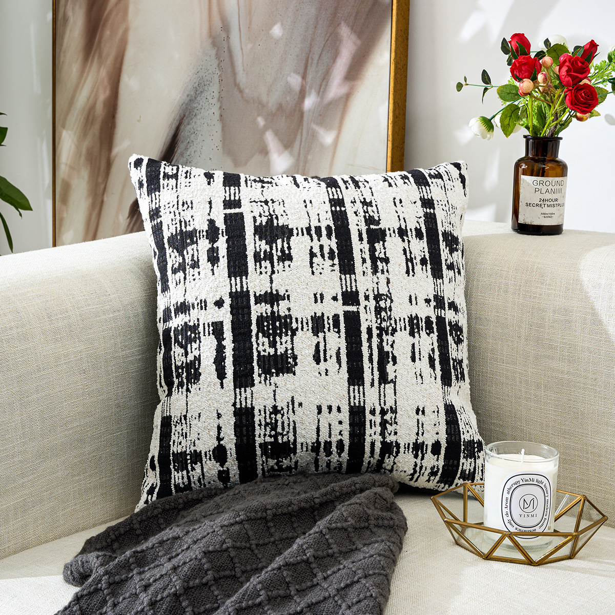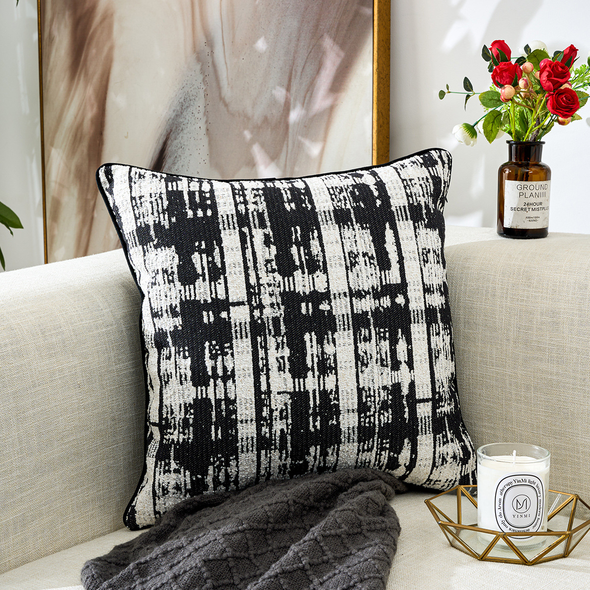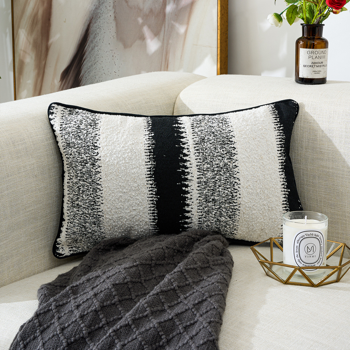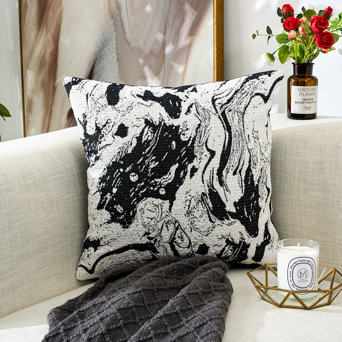 北欧风雪尼尔提花超软黑白ins时尚简约居家装饰车用靠垫套抱枕套