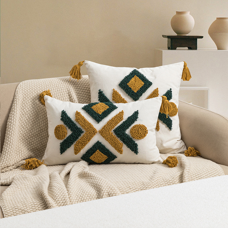 2025新款波西米亚棉帆布抱枕套摩洛哥几何圈绒流苏客厅沙发靠垫套