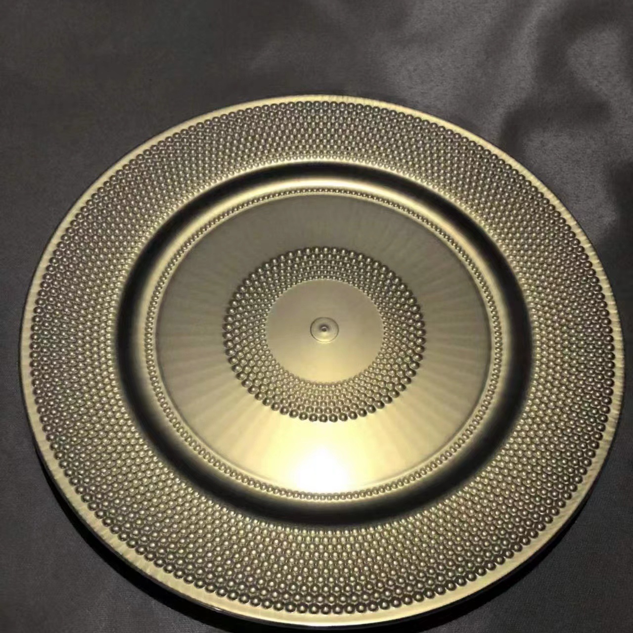 外贸颜色婚礼酒店派对电镀喷漆工艺装饰塑料主盘chagerplate西餐