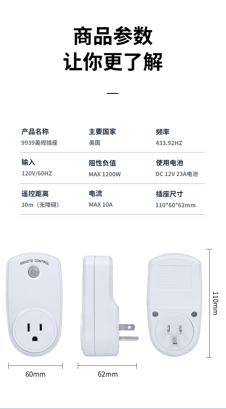 厂家供应9939U美式遥控插座 可定制远程控制开关