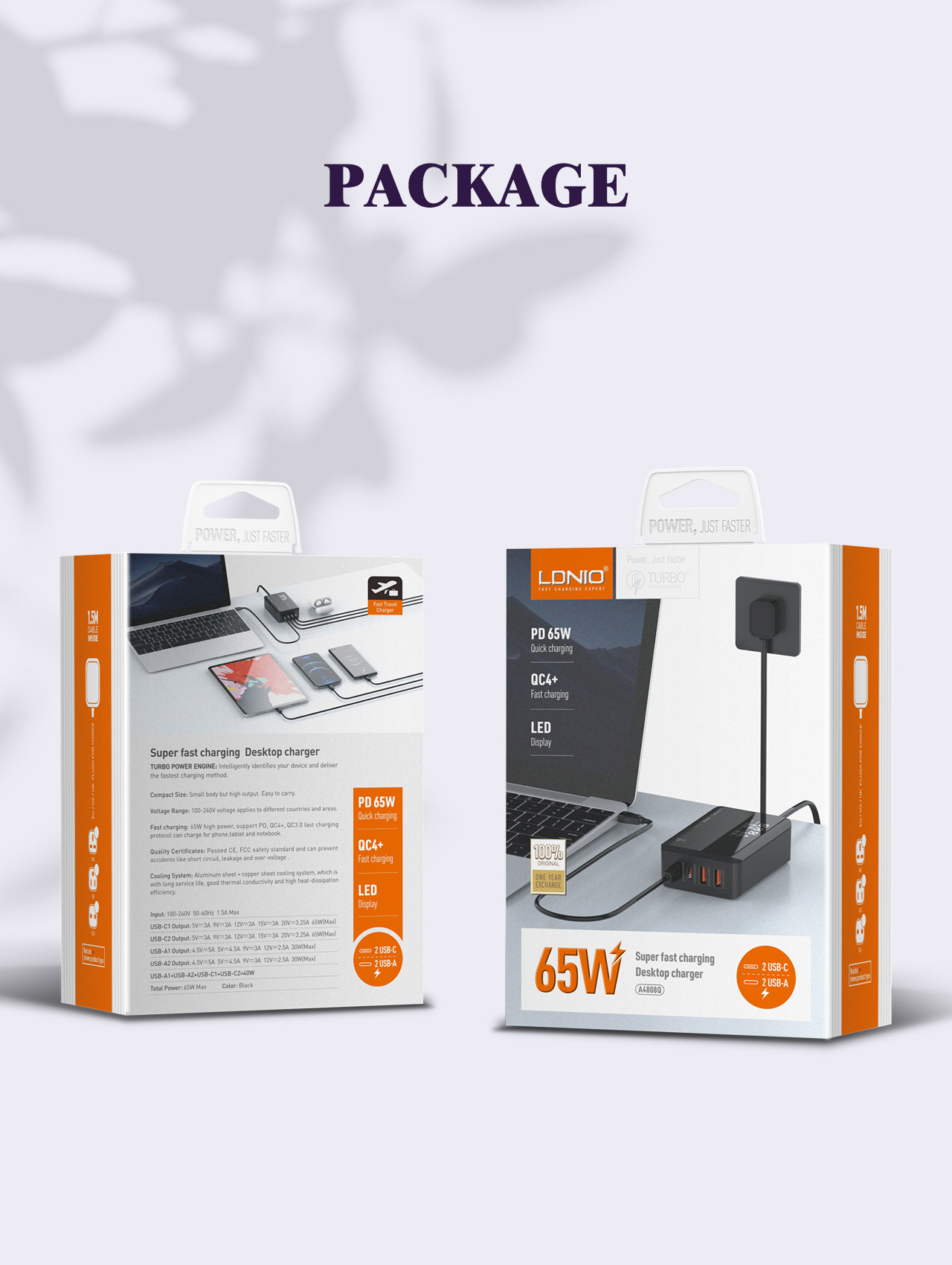 A4808Q-65w装箱详情 单个产品带包装尺寸:140*100*55mm 单个 产品带包装重量:300g 装箱数量:100pcs /箱 箱规: 58.5*30.5*59.5cm 重量:34.65KG |