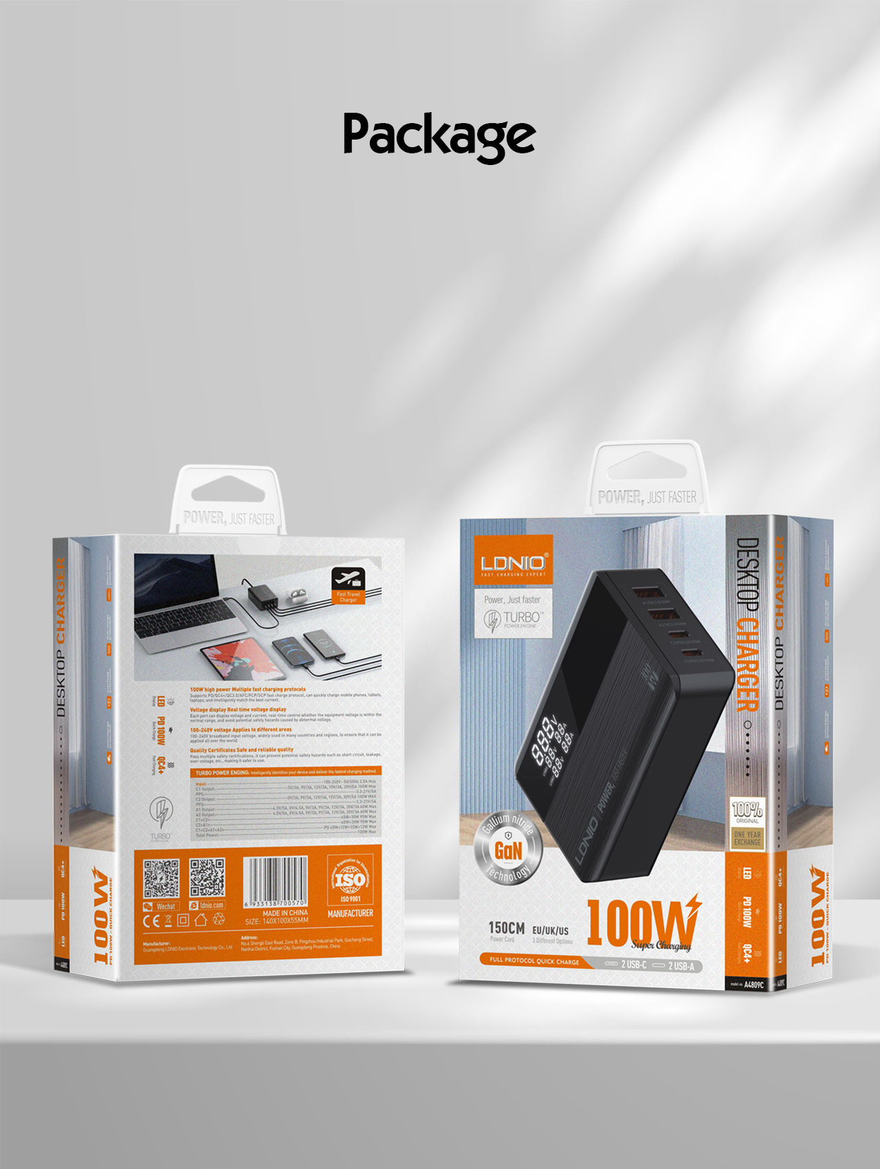 升级版A4809C-100W(氮化镓)装箱详情 单个产品带包装尺寸:140*100*55mm 单个 产品带包装重量:360g 装箱数量:50pcs /箱 箱规:59*30.5**30.5cm 重量:18KG |