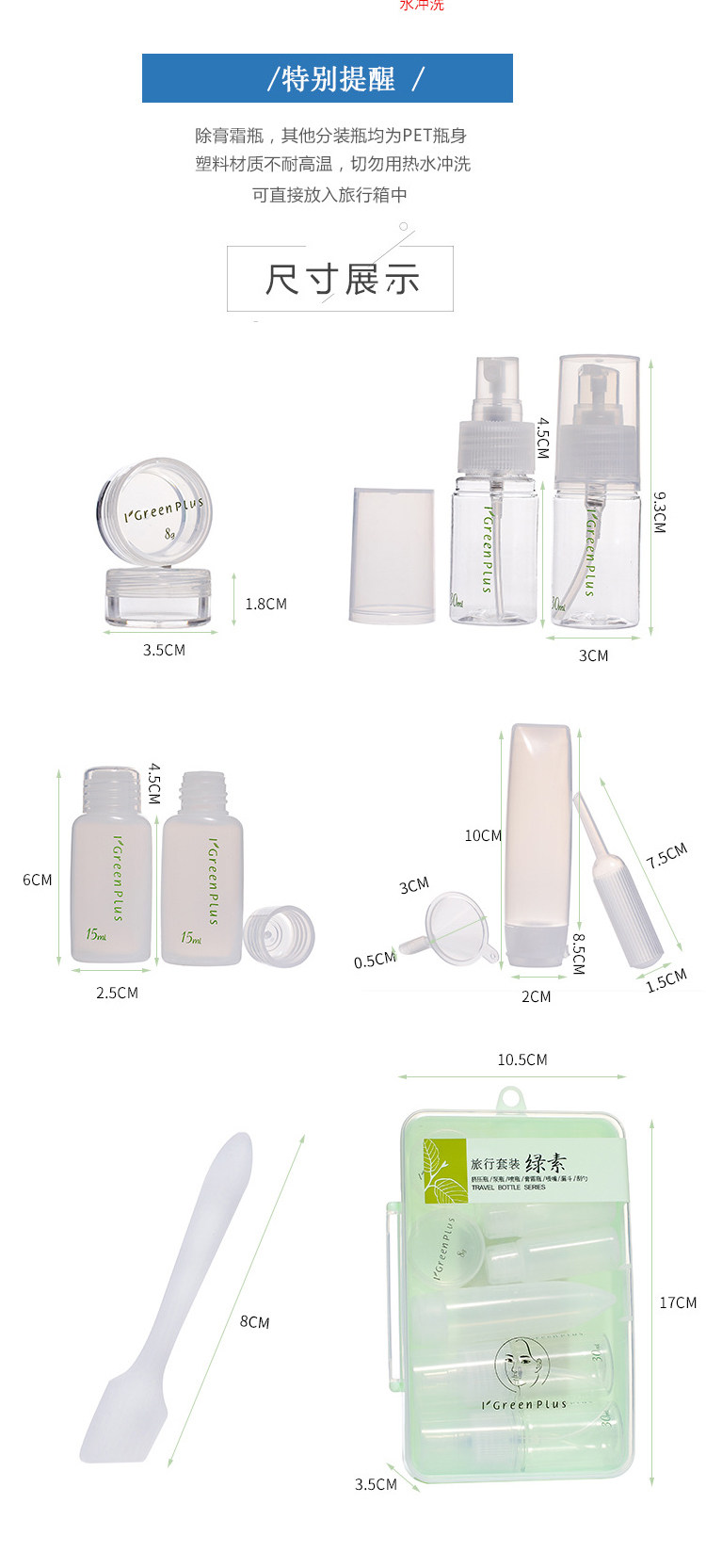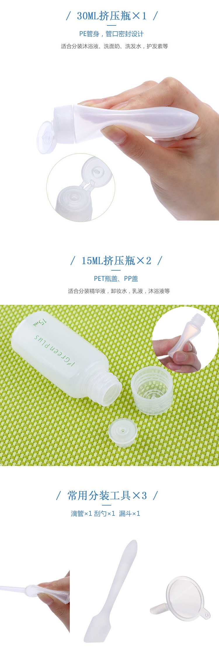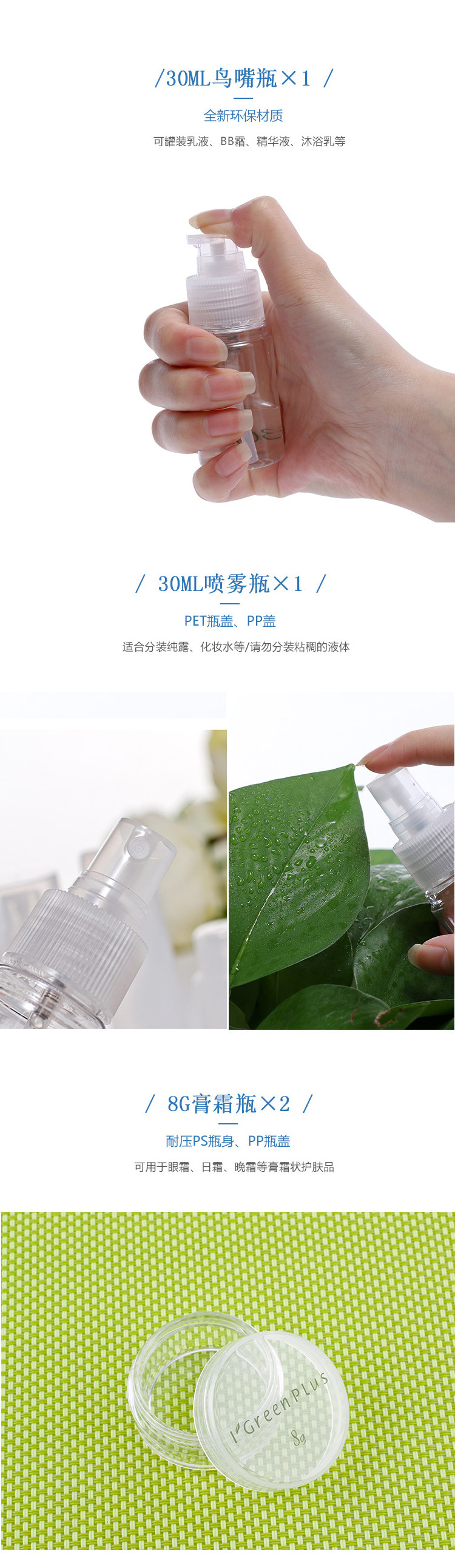 绿素旅行分装瓶10件套便携30ml喷雾瓶乳液瓶护肤品分装套装空瓶子