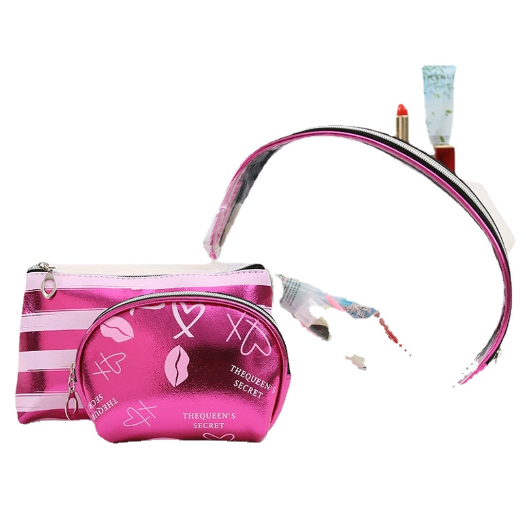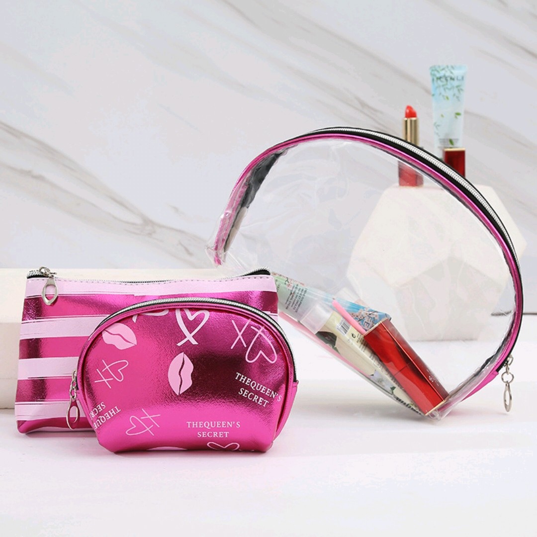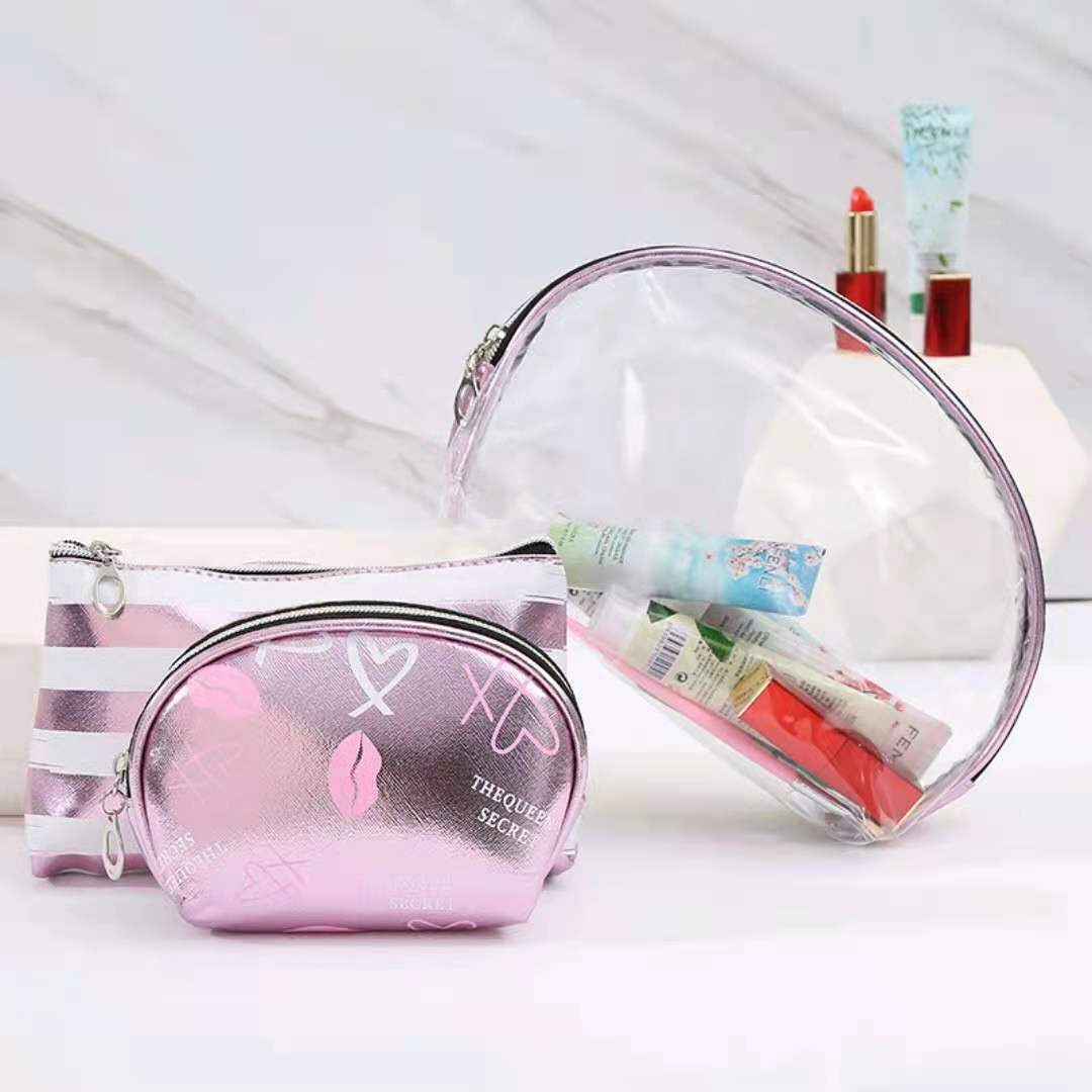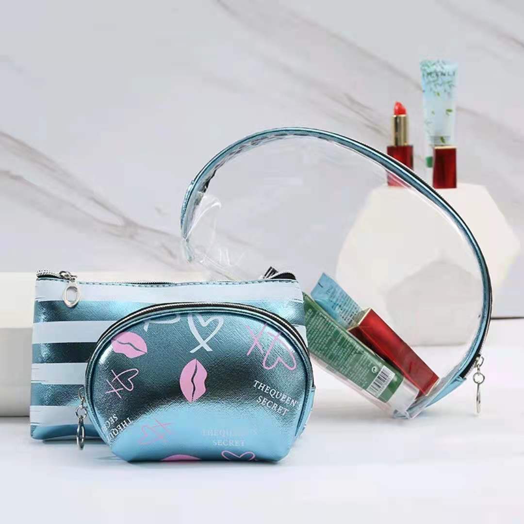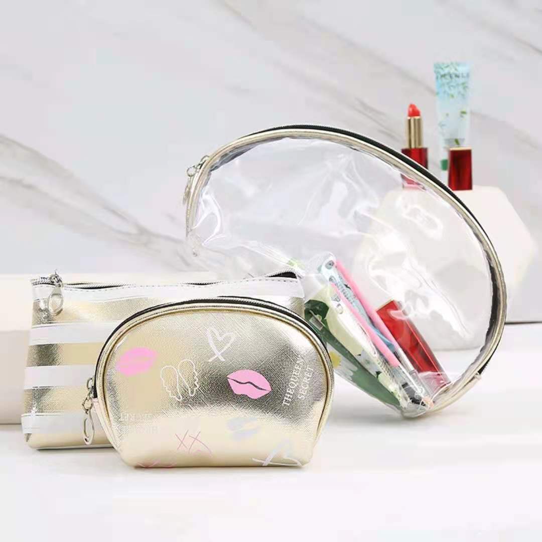 新款透明三件套印花条纹嘴唇口红手机包 化妆包 防水便携pu收纳包