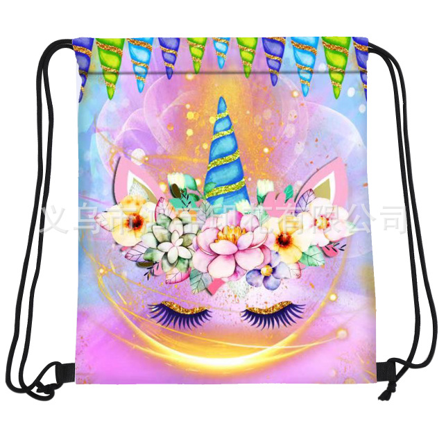 新款防水束口双肩背包夏日花环闭眼独角兽牛津布可折叠便携束口袋